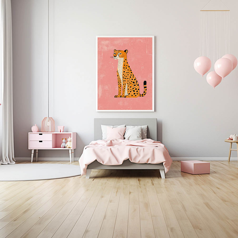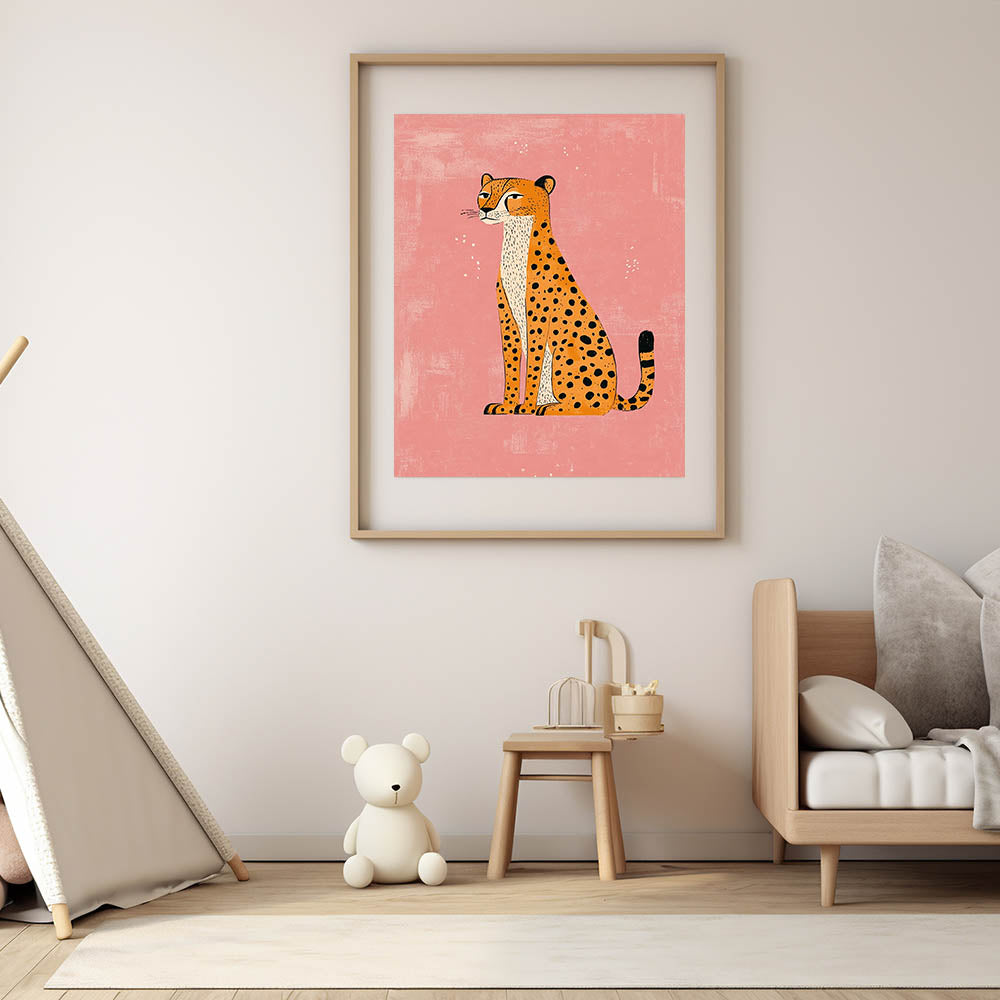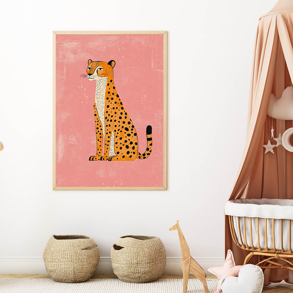 Add a bold and stylish touch to your child's space with this modern cheetah illustration print, designed to bring elegance and adventure to any nursery, playroom, or kids' bedroom. Featuring a sleek cheetah with golden fur, striking black spots, and a soft blush pink background, this children's wall décor piece blends contemporary design with a playful safari theme.