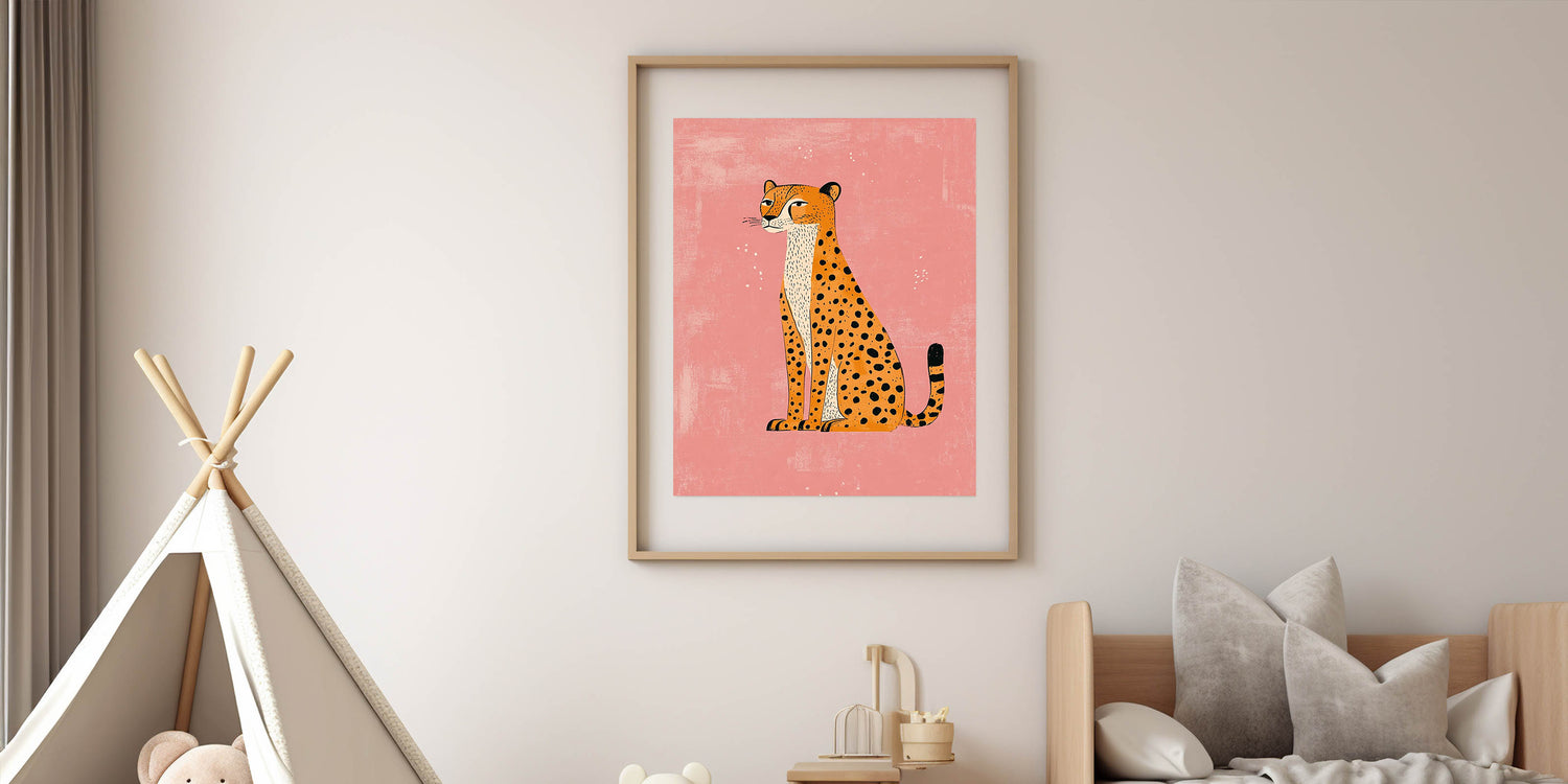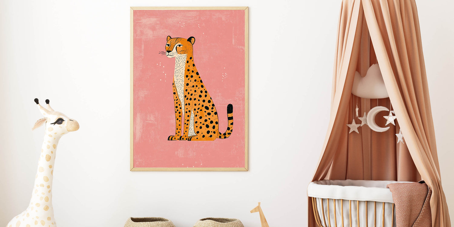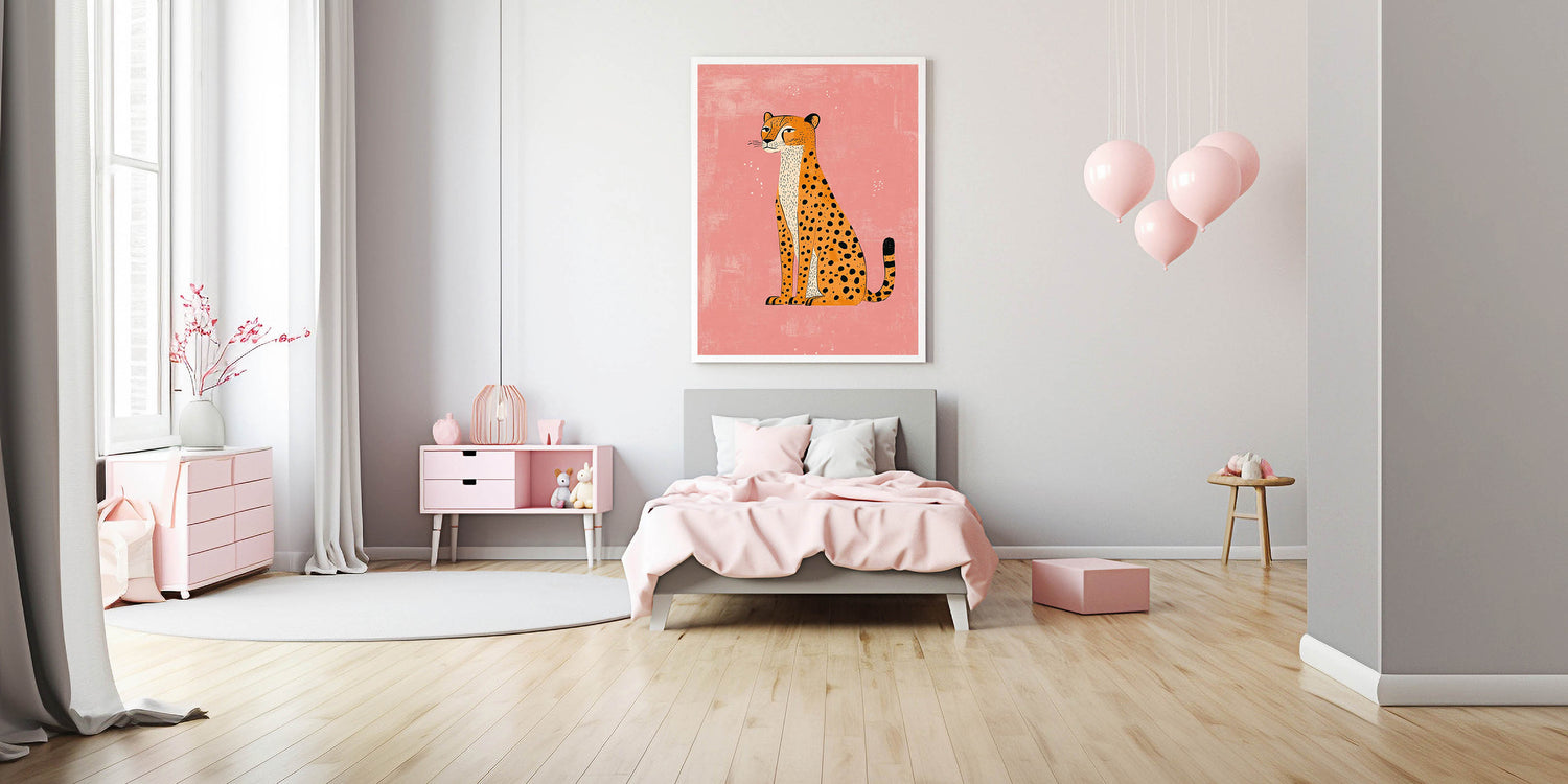 Add a bold and stylish touch to your child's space with this modern cheetah illustration print, designed to bring elegance and adventure to any nursery, playroom, or kids' bedroom. Featuring a sleek cheetah with golden fur, striking black spots, and a soft blush pink background, this children's wall décor piece blends contemporary design with a playful safari theme.