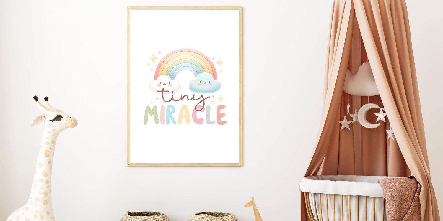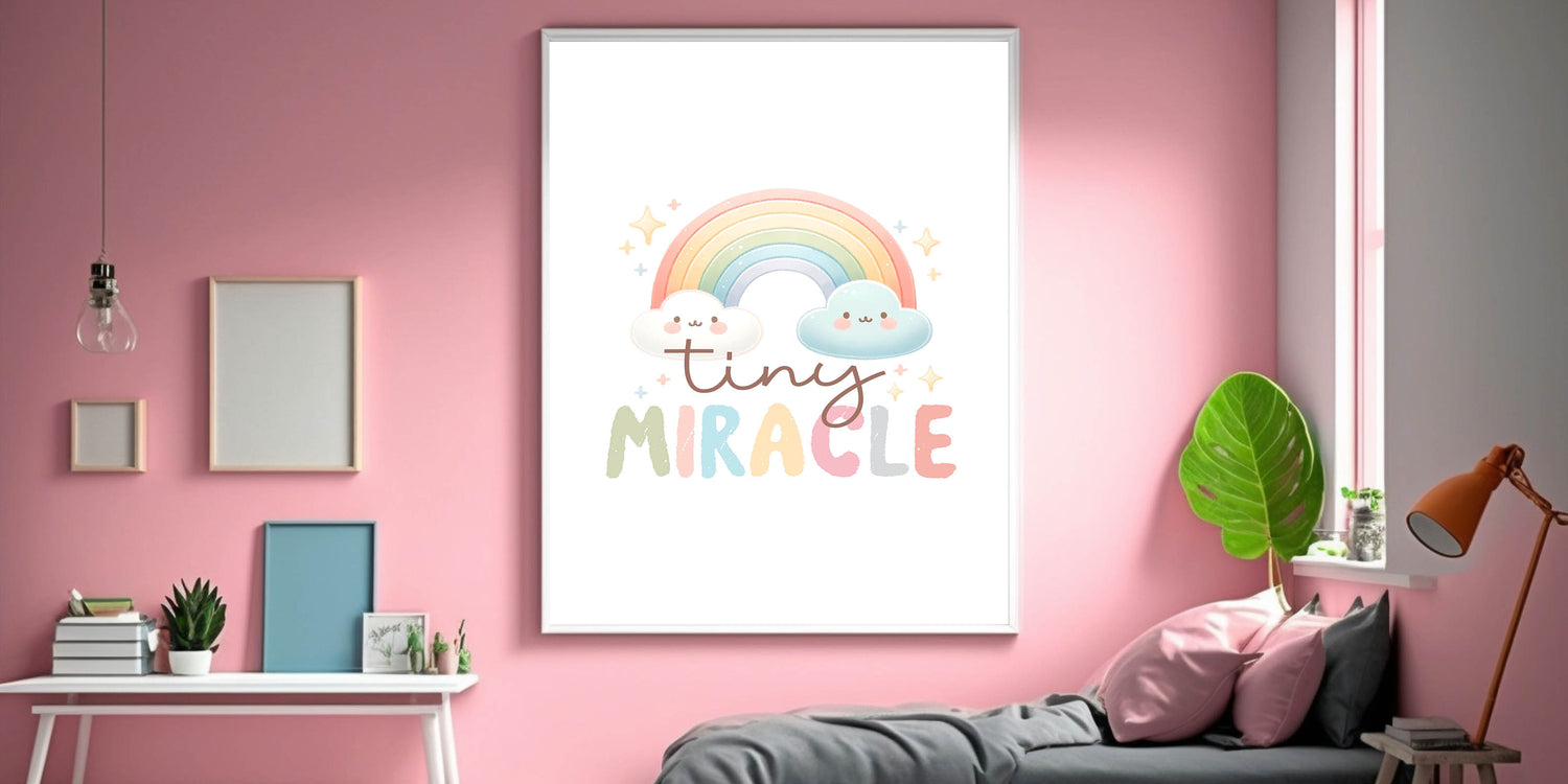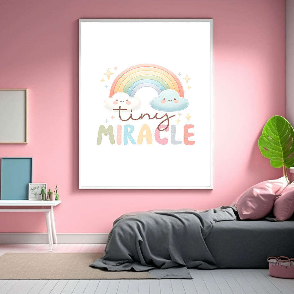 Celebrate the joy of your little one with this "Tiny Miracle" rainbow wall art, designed to bring happiness and warmth to nurseries, girls' bedrooms, and playrooms. Featuring a soft pastel rainbow with two adorable smiling clouds, this artwork radiates love, positivity, and charm. The hand-lettered text and sparkles add a whimsical touch, making it a delightful addition to any child's room.
