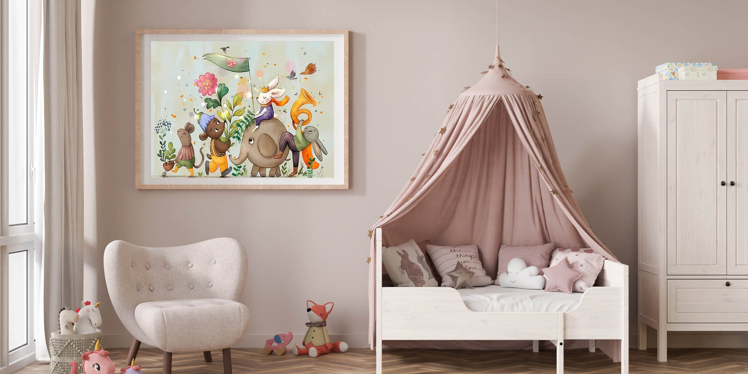 Add joy and adventure to your child’s space with this whimsical animal parade wall art. Featuring a charming group of animals marching together in celebration, this delightful piece is filled with imagination and nature-inspired details. The soft earthy tones of green, beige, and brown create a soothing yet playful atmosphere, making it a perfect addition to any girls' bedroom, nursery, or playroom.