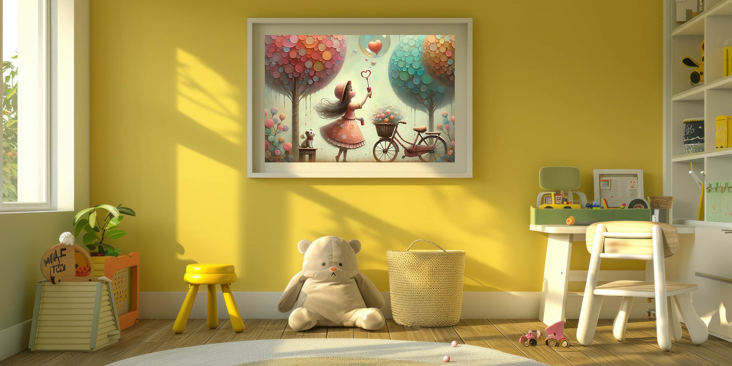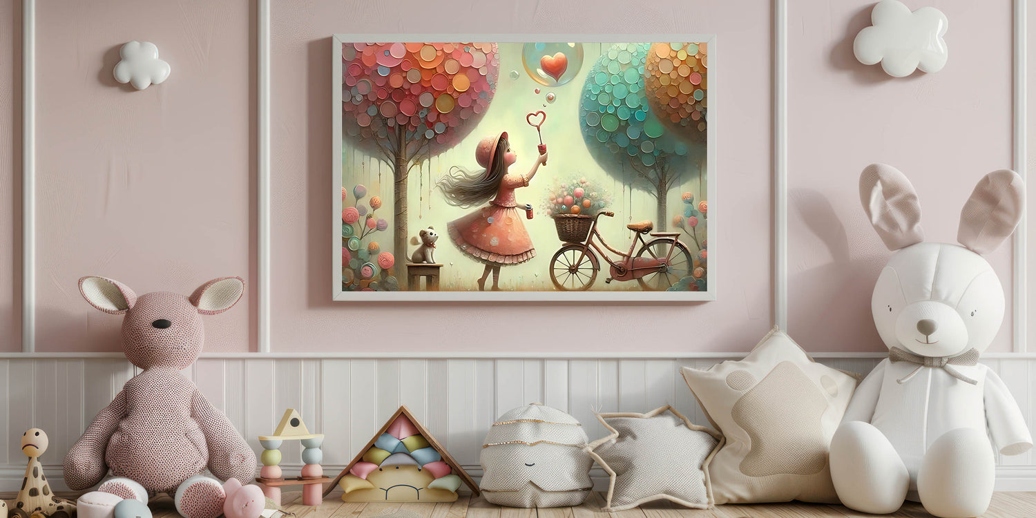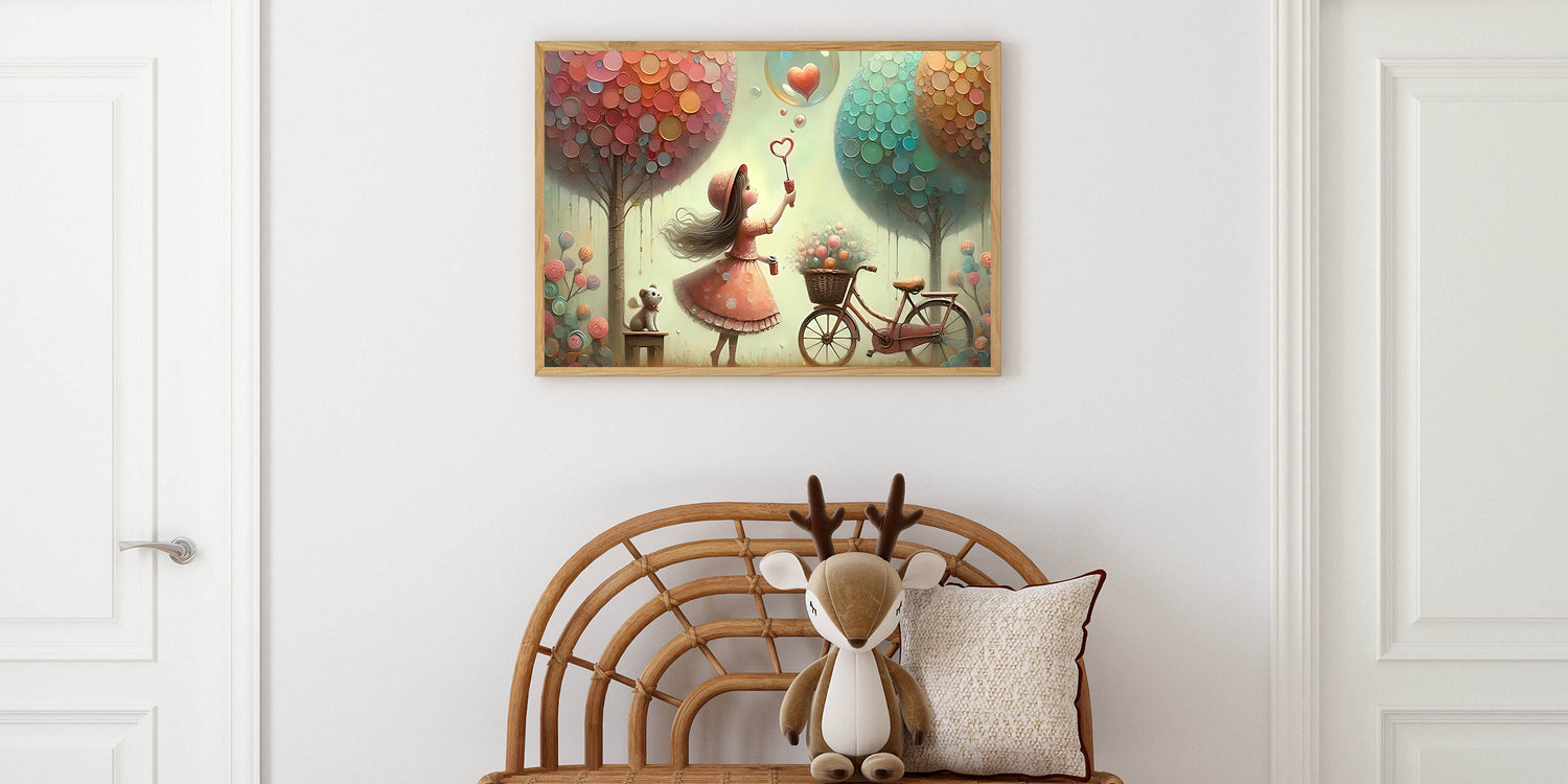Create a magical and serene atmosphere in your child's space with this whimsical girl and bubbles wall art. Featuring a young girl blowing heart-shaped bubbles amid dreamy pastel trees, this enchanting artwork evokes innocence, wonder, and imagination. The warm peach and teal hues blend beautifully, making it a stunning addition to any girls' bedroom, nursery, or playroom.