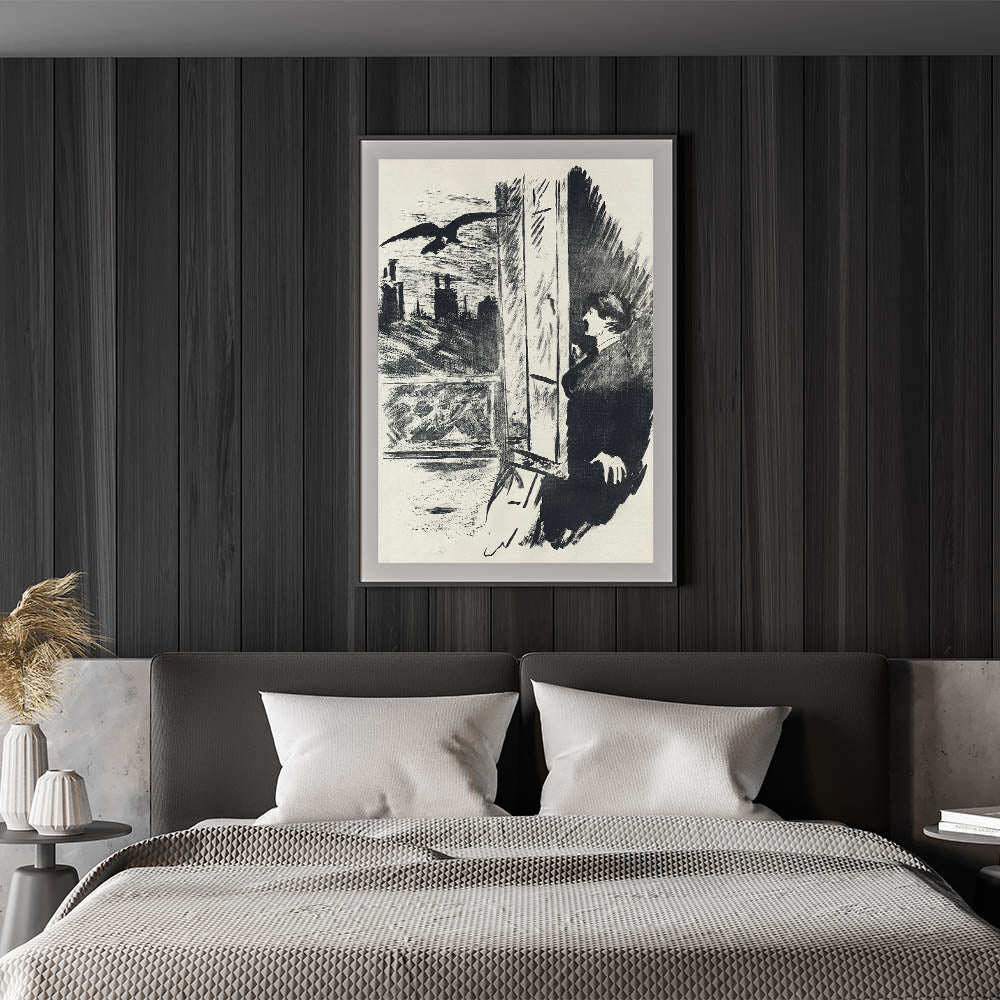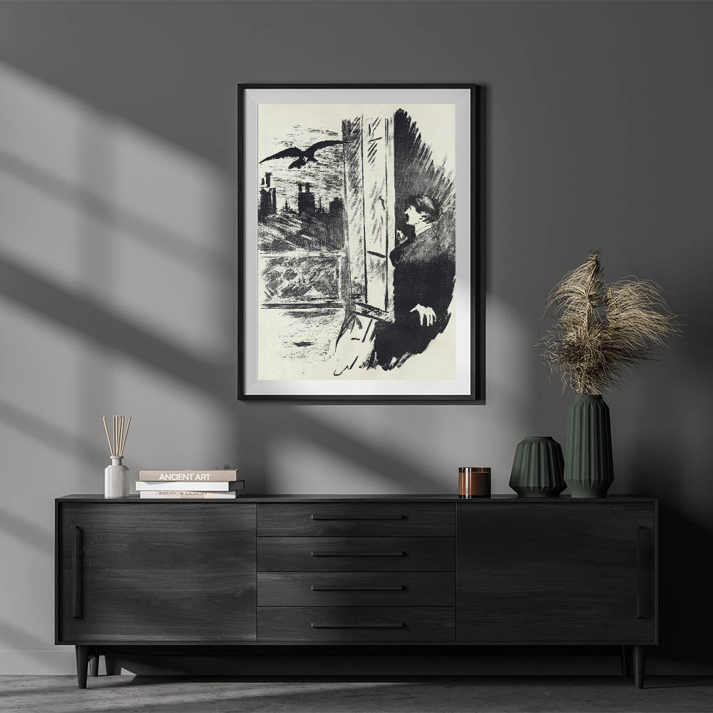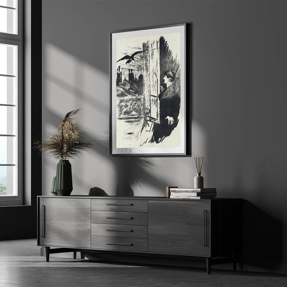 This Gothic wall art piece portrays a haunting cityscape with a silhouetted figure gazing out at a raven soaring above the skyline. The dramatic black and white tones enhance the eerie atmosphere, capturing a moment of suspense and solitude. The rough, expressive strokes add texture and depth, making this piece an ideal choice for those who appreciate the moody and mysterious essence of Gothic aesthetics. Perfect for creating a dramatic focal point, this artwork blends urban and natural elements to tell a captivating story.