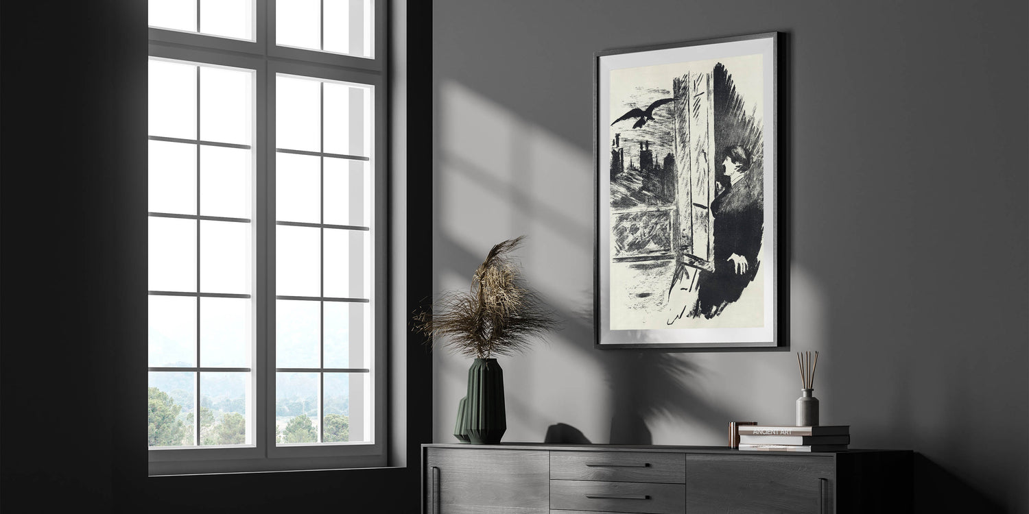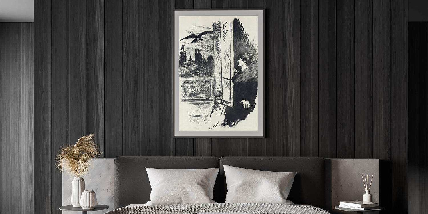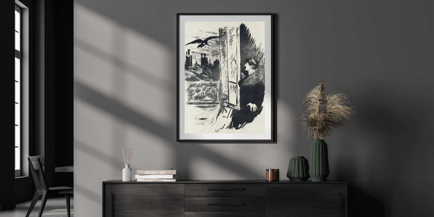 This Gothic wall art piece portrays a haunting cityscape with a silhouetted figure gazing out at a raven soaring above the skyline. The dramatic black and white tones enhance the eerie atmosphere, capturing a moment of suspense and solitude. The rough, expressive strokes add texture and depth, making this piece an ideal choice for those who appreciate the moody and mysterious essence of Gothic aesthetics. Perfect for creating a dramatic focal point, this artwork blends urban and natural elements to tell a captivating story.