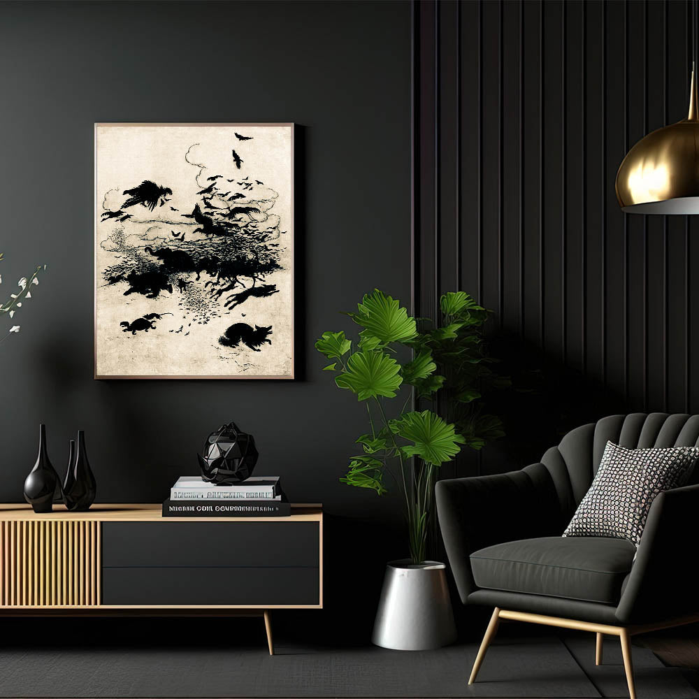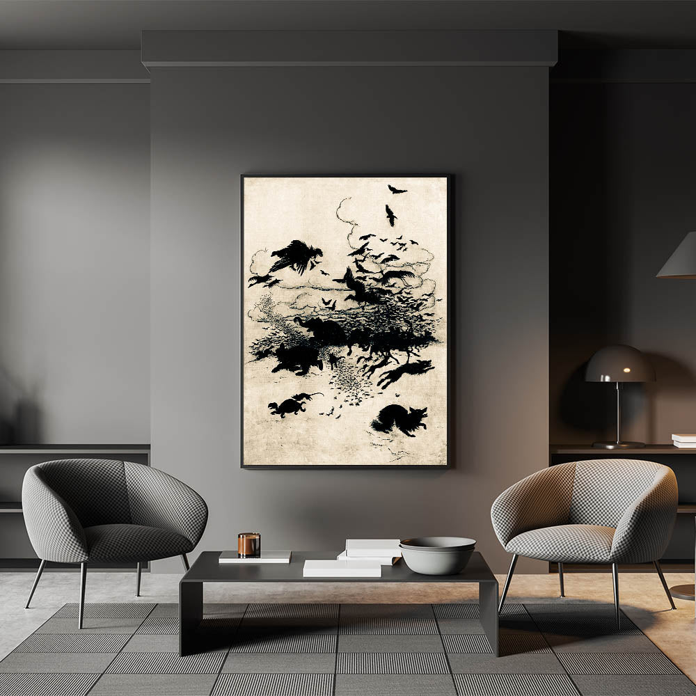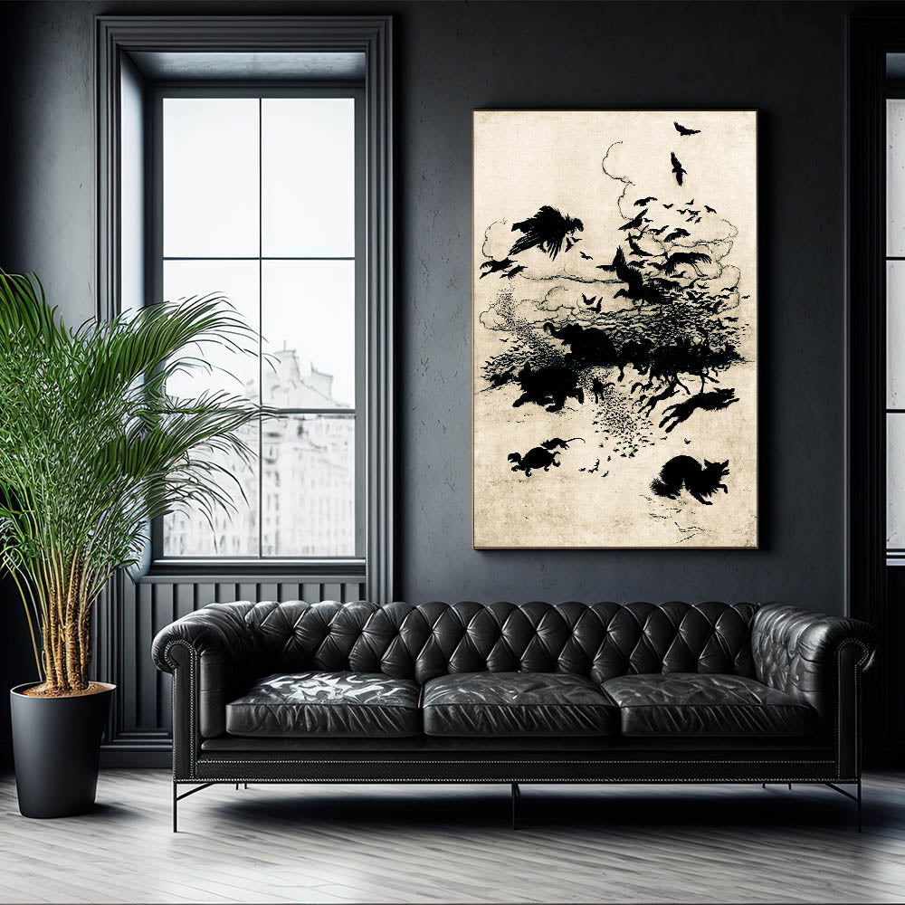 This Gothic wall art captures the eerie beauty of nature's dark side, featuring a swirling mass of crows and shadowy wolves in a haunting chase. The vintage Gothic print style brings out the ominous tones of medieval Gothic themes, making it an ideal addition to any dark decor style. This timeless artwork evokes mystery, power, and the chaos of the natural world. The design is perfect for those who love Gothic-inspired designs and want to add a sense of drama to their space.