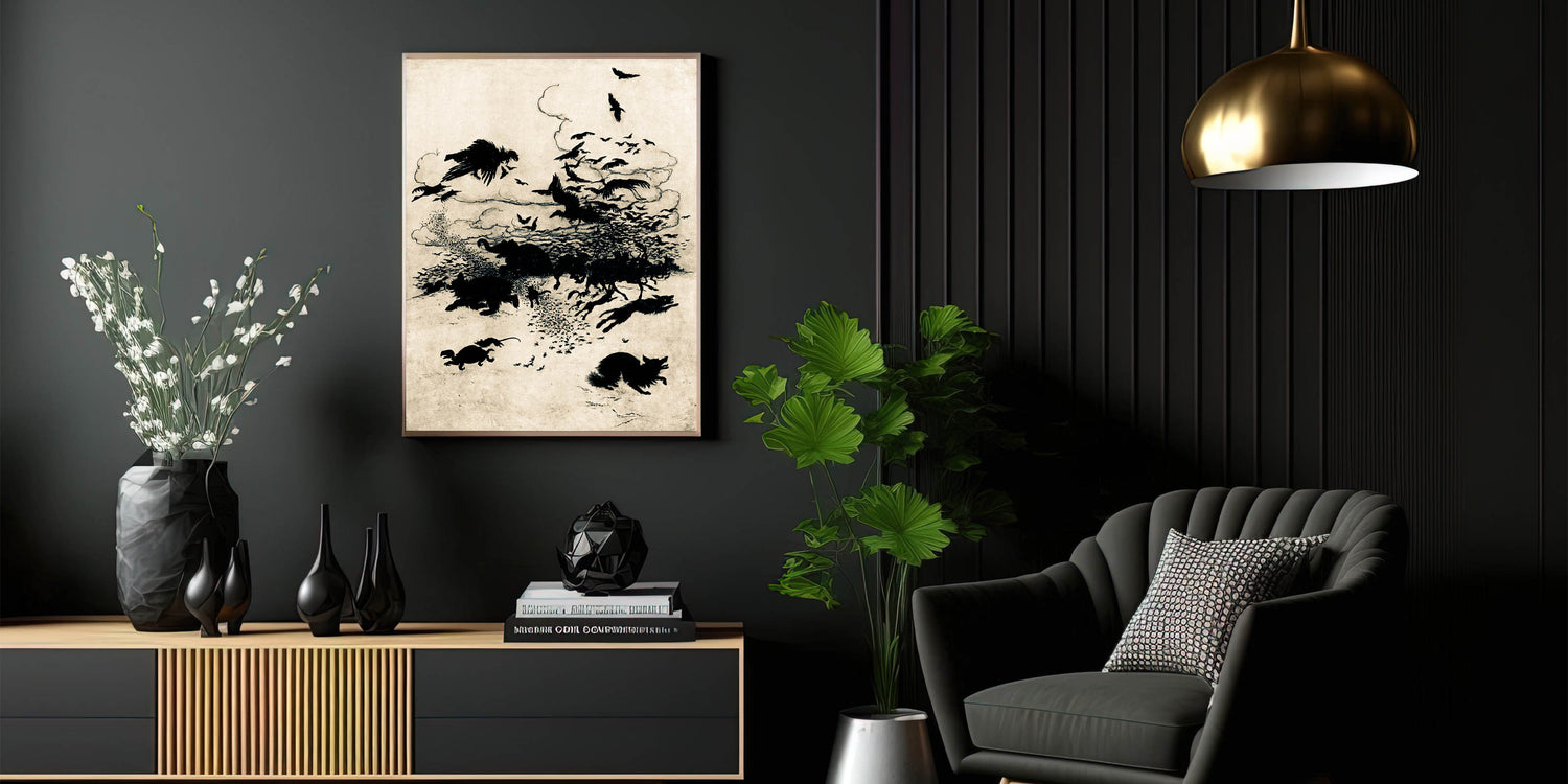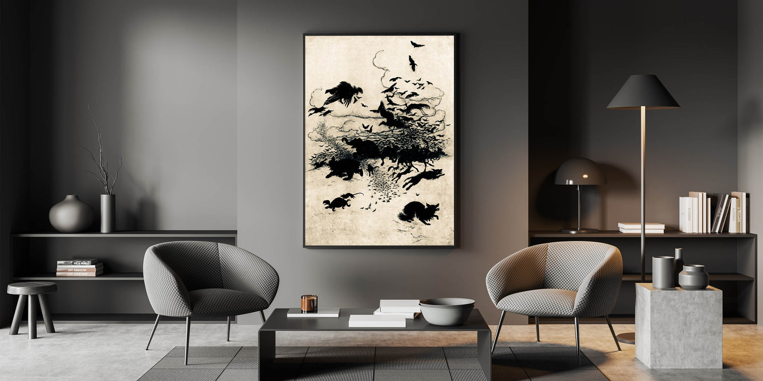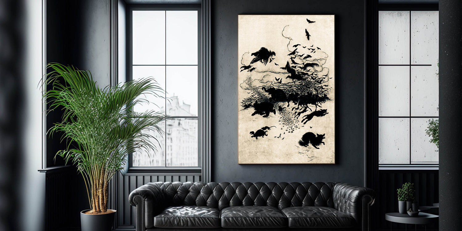 This Gothic wall art captures the eerie beauty of nature's dark side, featuring a swirling mass of crows and shadowy wolves in a haunting chase. The vintage Gothic print style brings out the ominous tones of medieval Gothic themes, making it an ideal addition to any dark decor style. This timeless artwork evokes mystery, power, and the chaos of the natural world. The design is perfect for those who love Gothic-inspired designs and want to add a sense of drama to their space.