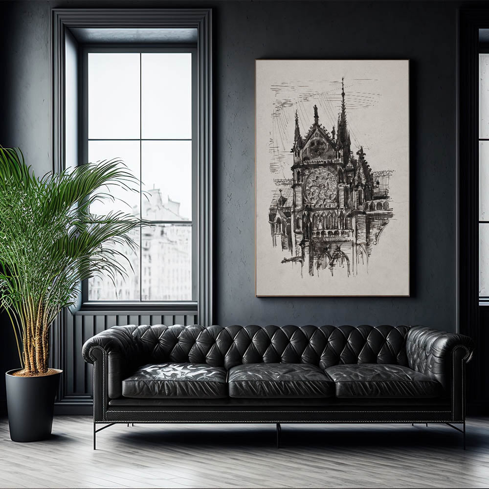 Experience the grandeur of medieval architecture with this Gothic-inspired sketch of a cathedral. This detailed artwork captures the intricate designs and towering spires typical of Gothic architecture, making it a stunning addition to any decor that appreciates historical and architectural beauty. The piece’s fine detailing and stark contrast offer a compelling visual experience that draws viewers into a bygone era.