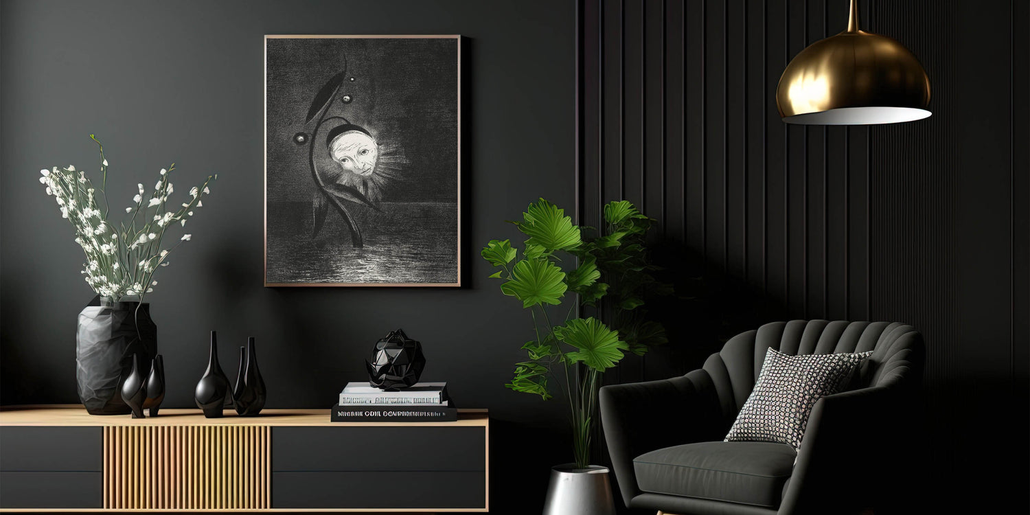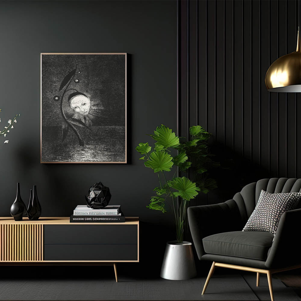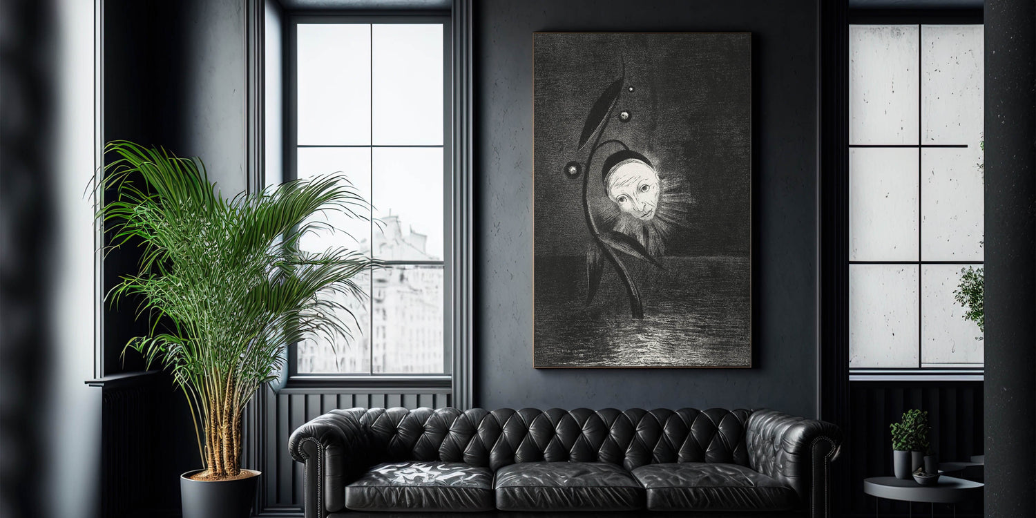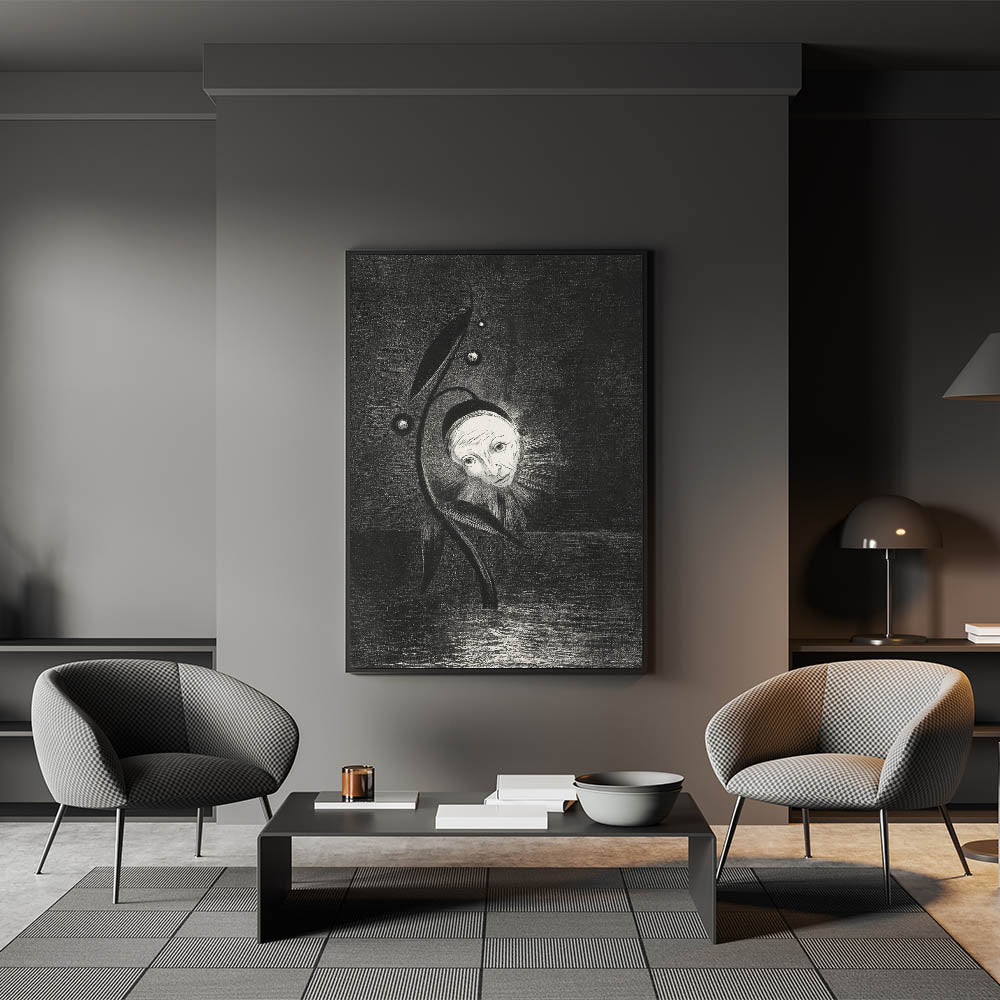 This captivating Gothic wall art features a surreal combination of a flower and a mysterious face, blending natural and supernatural elements into a hauntingly beautiful design. The dark tones and dreamlike atmosphere create a sense of mystery and intrigue, making it perfect for those who appreciate the more surreal side of Gothic decor. The delicate details and eerie expression of the face add depth and emotion to the piece, making it a striking addition to any room.