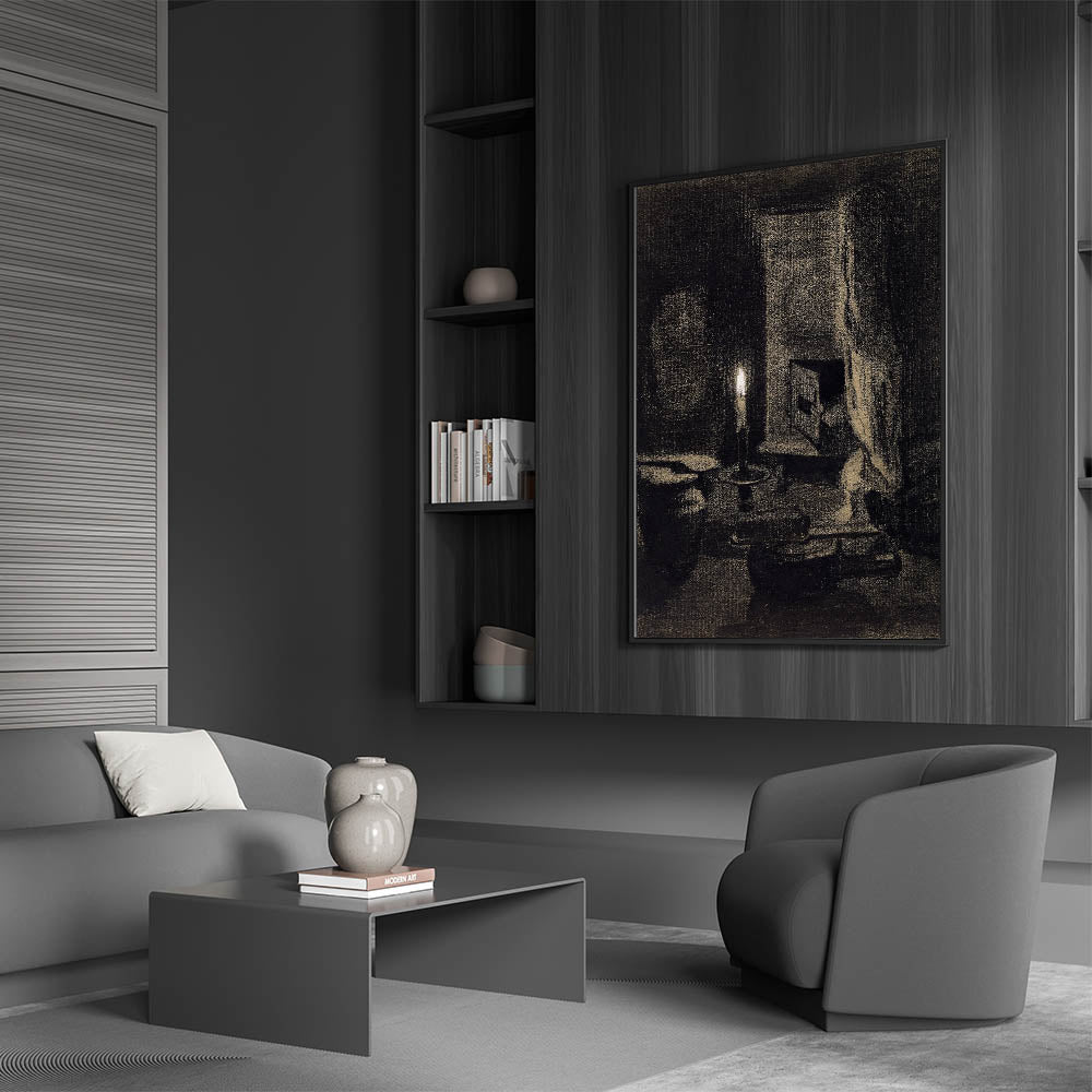 This captivating Gothic wall art features a candlelit still life scene that perfectly captures the atmosphere of a dimly lit, quiet room. The soft glow of the candle contrasts with the dark shadows, creating a striking interplay of light and darkness, evoking feelings of mystery and solitude. This vintage Gothic print draws upon medieval Gothic themes, making it an ideal choice for those who appreciate dark decor style. The still life composition, complete with books, pottery, and a single candle, brings a quiet, contemplative energy to any space.