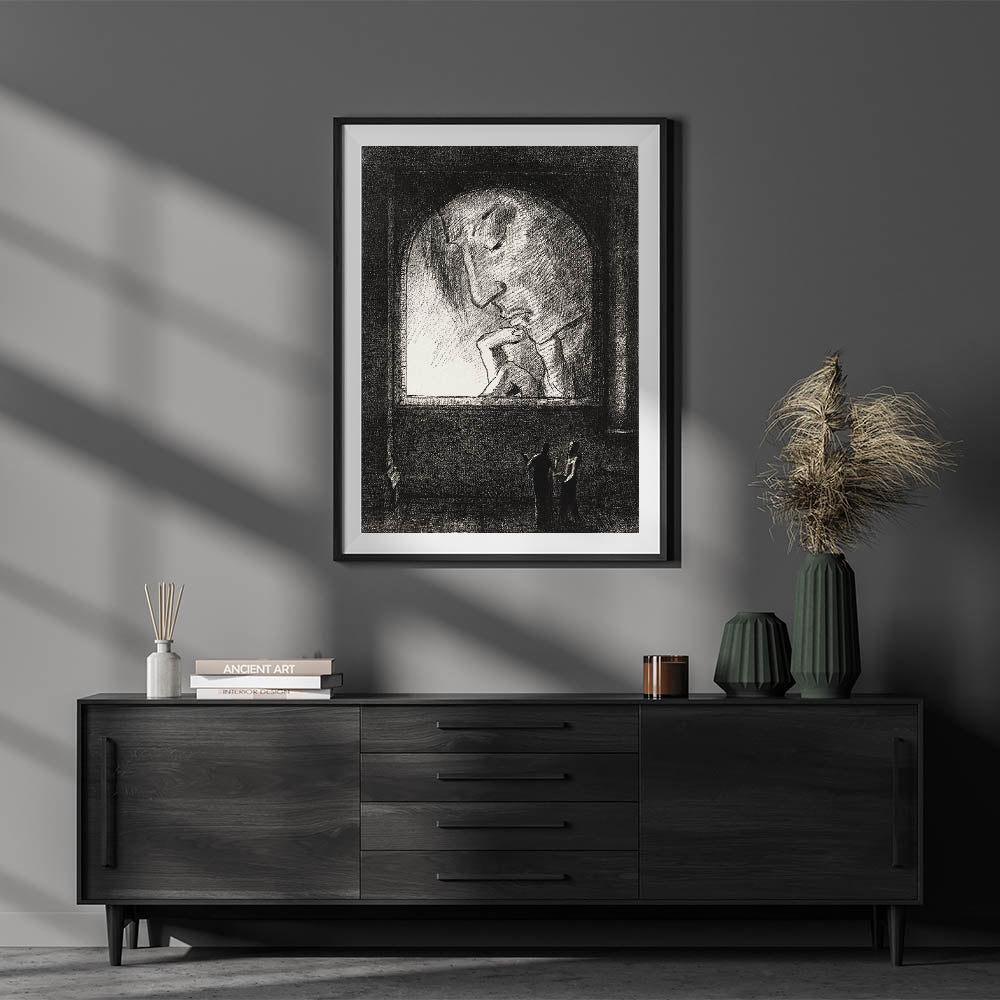 This striking Gothic-inspired artwork portrays a dark, contemplative scene, where two figures stand beneath a looming, thoughtful face displayed on a grand window. The haunting and mysterious atmosphere of this piece makes it perfect for those seeking to incorporate Gothic elements into their home decor. Its dark tones and intricate details evoke a sense of wonder and introspection, making it a centerpiece for any room.