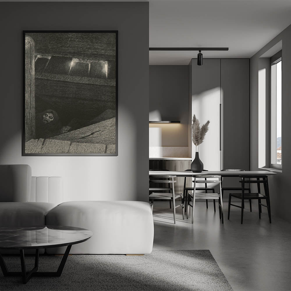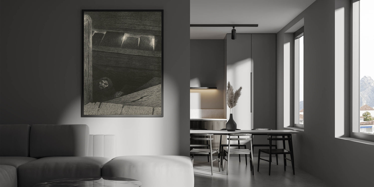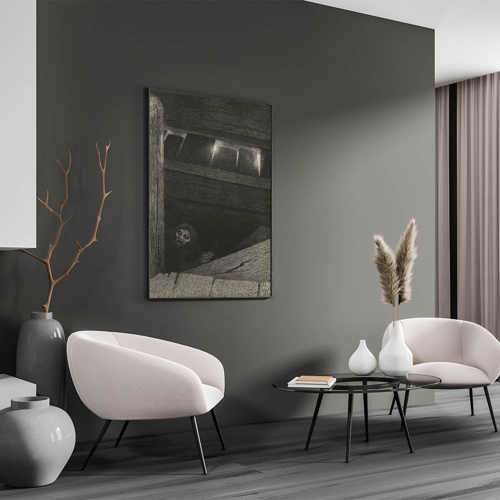 Step into the shadows with this haunting Gothic Wall Art, featuring a dark, ominous creature lurking in the depths of a mysterious setting. This Gothic-inspired design offers a powerful contrast between light and dark, evoking an eerie atmosphere that is perfect for any dark decor style. The carefully detailed creature, with its penetrating gaze, adds an element of suspense and intrigue, making it an ideal piece for lovers of Gothic themes and unsettling art.