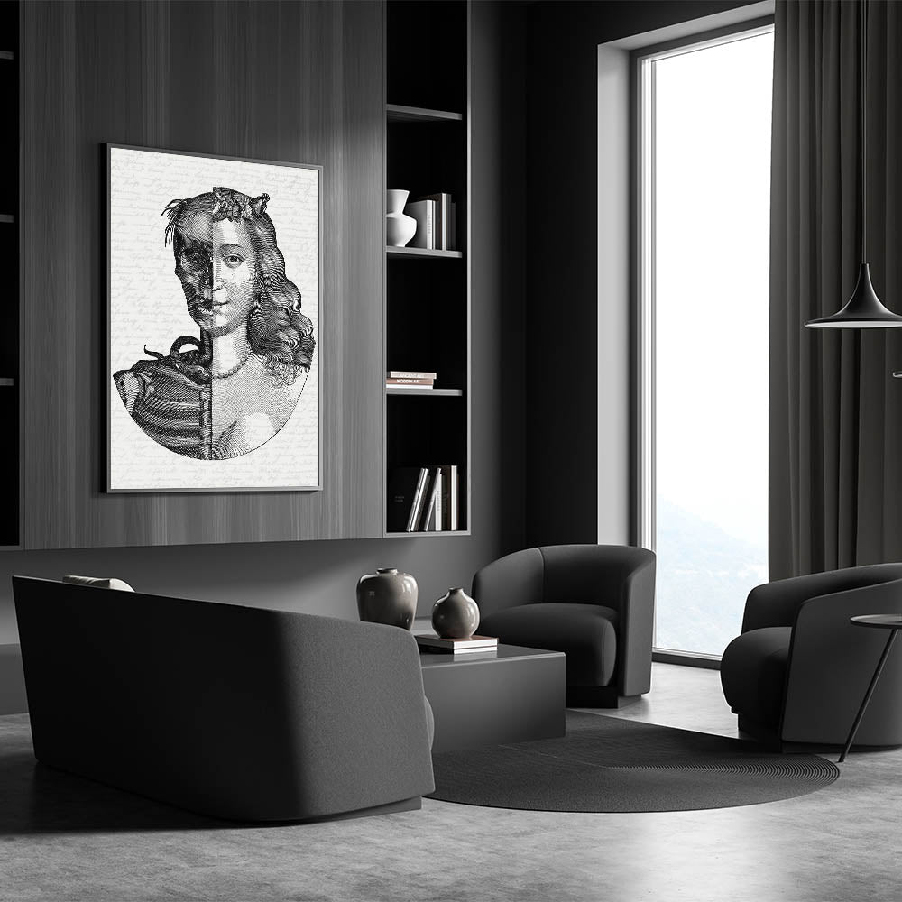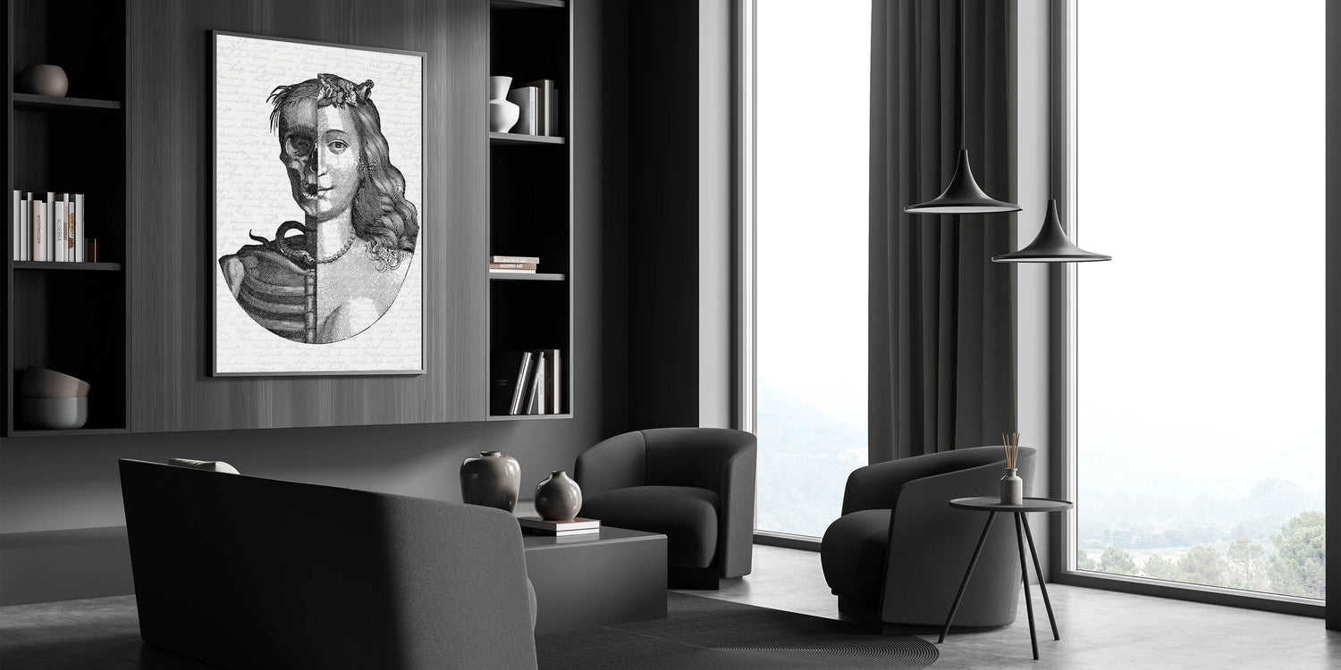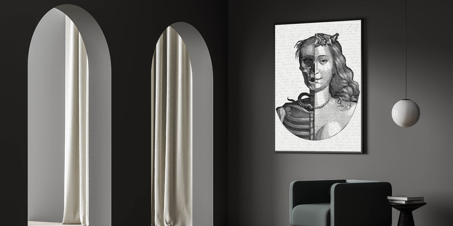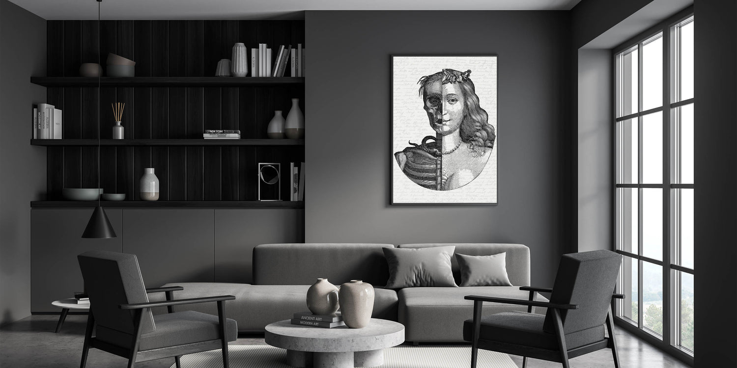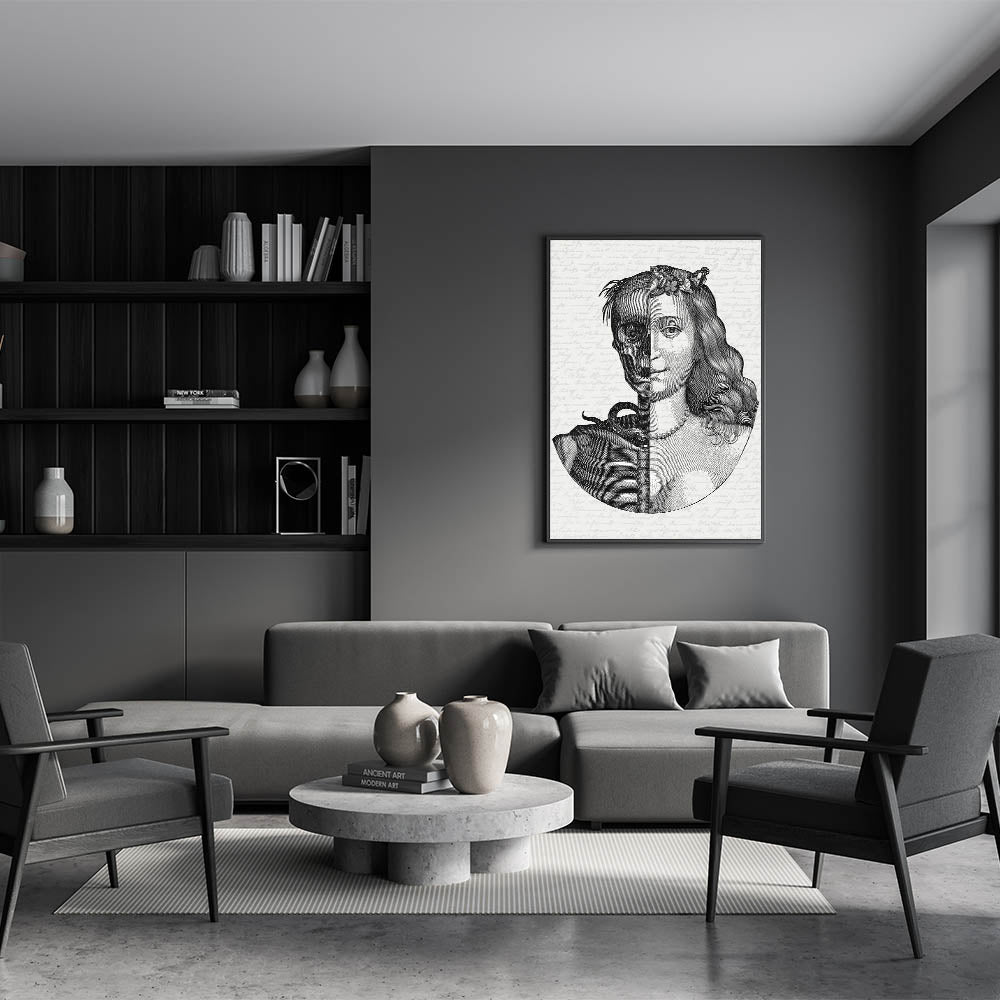 Elevate your space with this captivating Gothic wall art that seamlessly blends beauty and mortality. The design features a split portrait of a woman and a skeleton, creating a striking contrast between life and death. This medieval Gothic canvas reflects the timeless fascination with the duality of existence, making it an excellent choice for those who appreciate mysterious Gothic themes. The intricate details and bold, monochromatic palette make this piece an essential addition to any dark decor style.