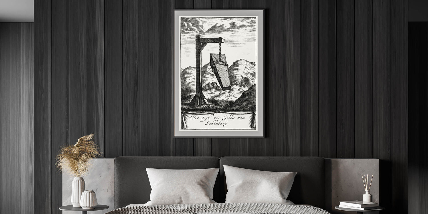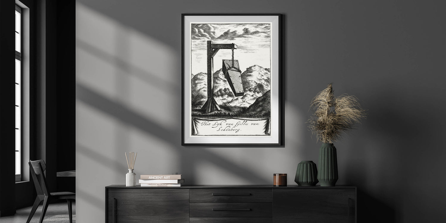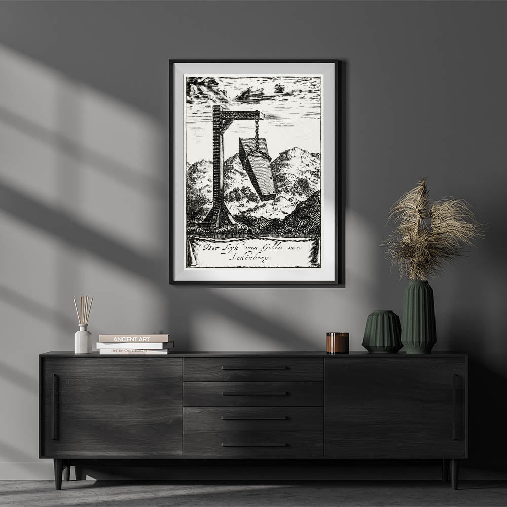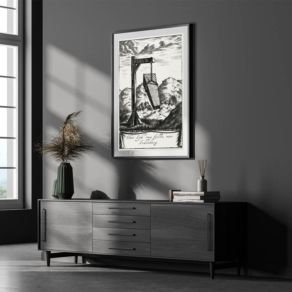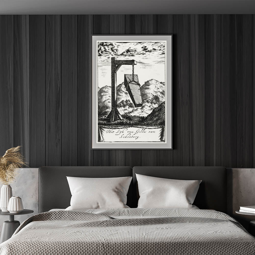 Add a haunting piece of history to your decor with this Gothic Wall Art, featuring an illustration of a hanging coffin. This dark and thought-provoking piece captures the eerie atmosphere of ancient rituals, making it a perfect addition to any dark decor style. The stark imagery of the coffin suspended against a foreboding sky evokes a sense of mystery and mortality, ideal for creating a dramatic focal point in your home or office.
