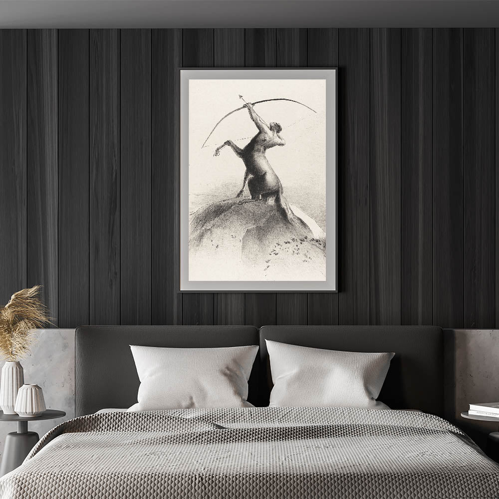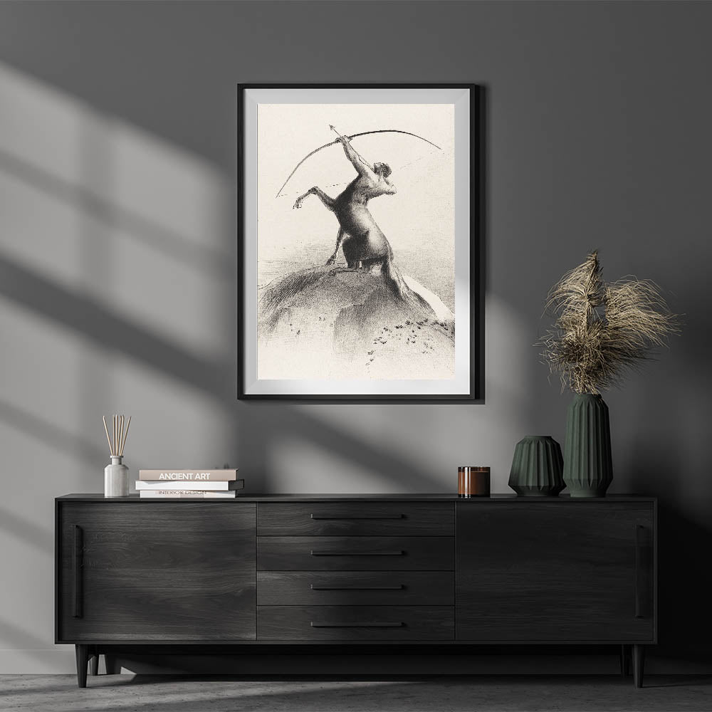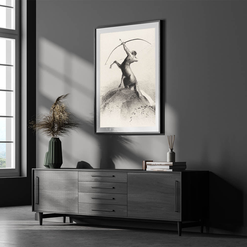 Step into the mythical world of Gothic wall art with this powerful depiction of a centaur drawing a bow. This vintage Gothic print highlights the majesty and strength of this half-human, half-horse creature, as it stands poised on a rocky ledge, ready to release an arrow. The composition exudes energy and tension, making it an ideal piece for those who appreciate medieval Gothic themes and dark decor style. The detailed shading and dynamic posture bring this ancient myth to life, making it a perfect focal point for any room.