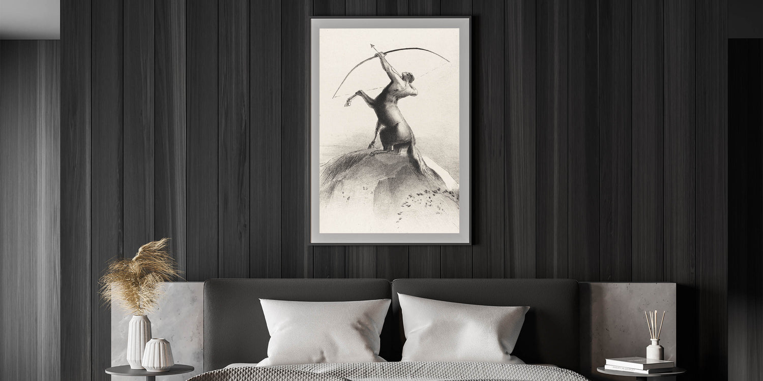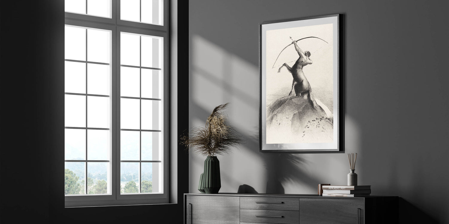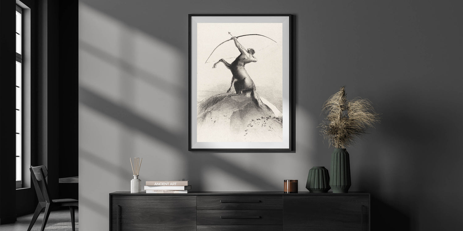 Step into the mythical world of Gothic wall art with this powerful depiction of a centaur drawing a bow. This vintage Gothic print highlights the majesty and strength of this half-human, half-horse creature, as it stands poised on a rocky ledge, ready to release an arrow. The composition exudes energy and tension, making it an ideal piece for those who appreciate medieval Gothic themes and dark decor style. The detailed shading and dynamic posture bring this ancient myth to life, making it a perfect focal point for any room.