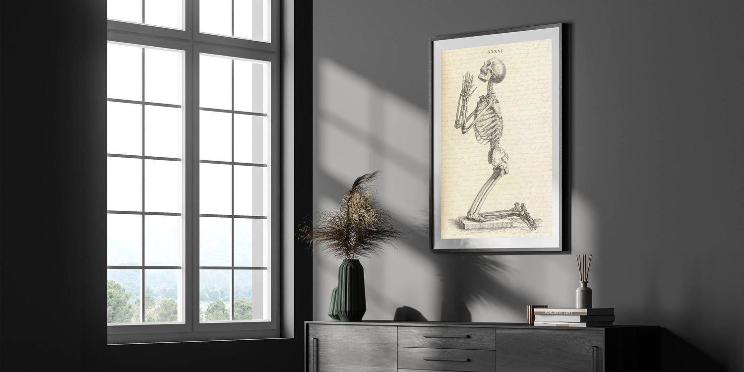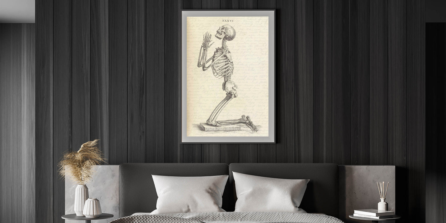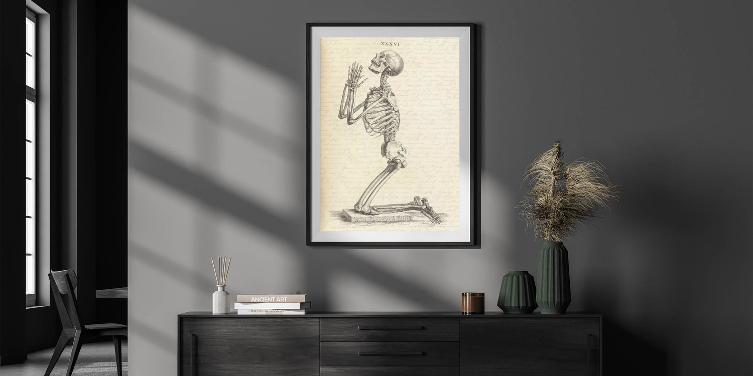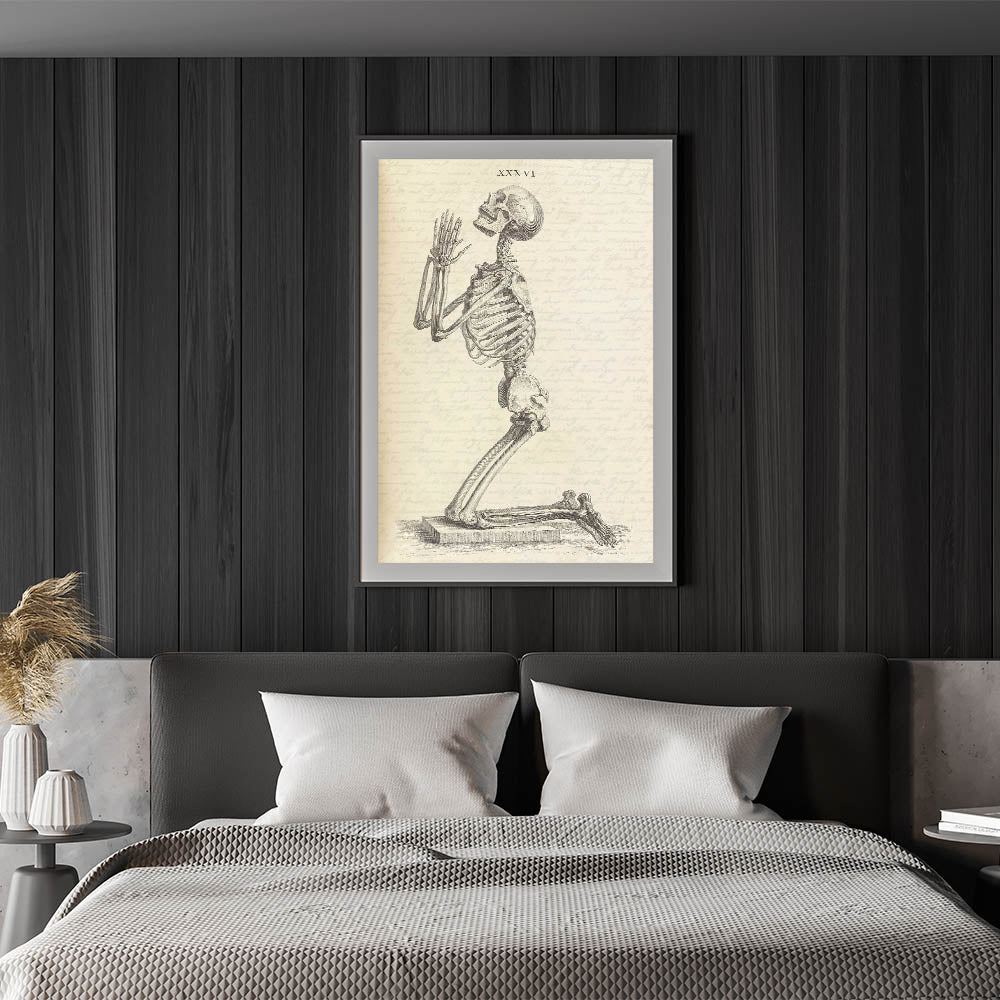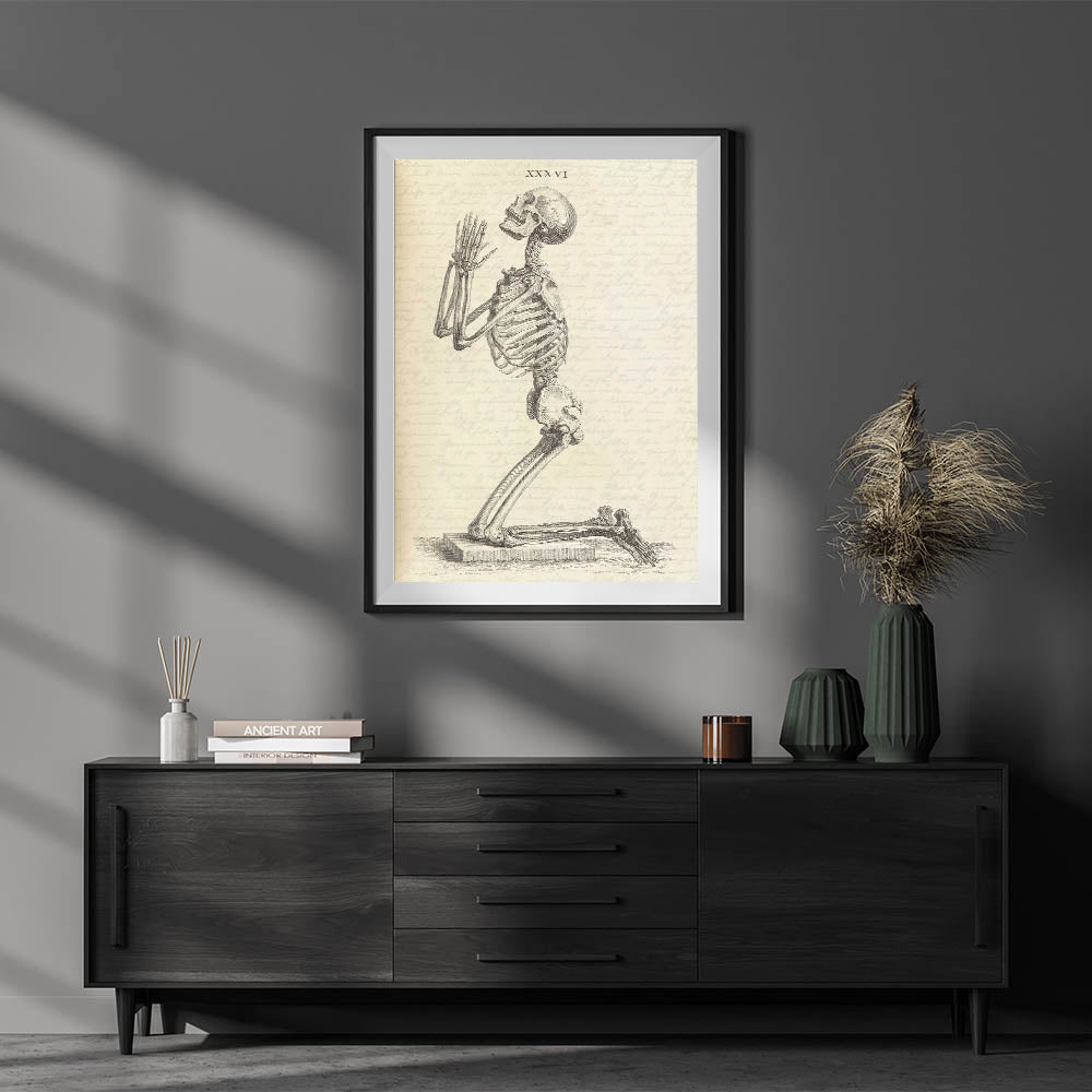 Add a unique touch of Gothic wall decor to your home with this striking skeletal artwork, featuring a medieval Gothic canvas design. The detailed illustration of a kneeling skeleton is both eerie and fascinating, perfectly capturing the essence of Gothic-inspired design. This piece is an excellent choice for those who enjoy the mysterious Gothic themes and want to incorporate dark elegance into their living space.