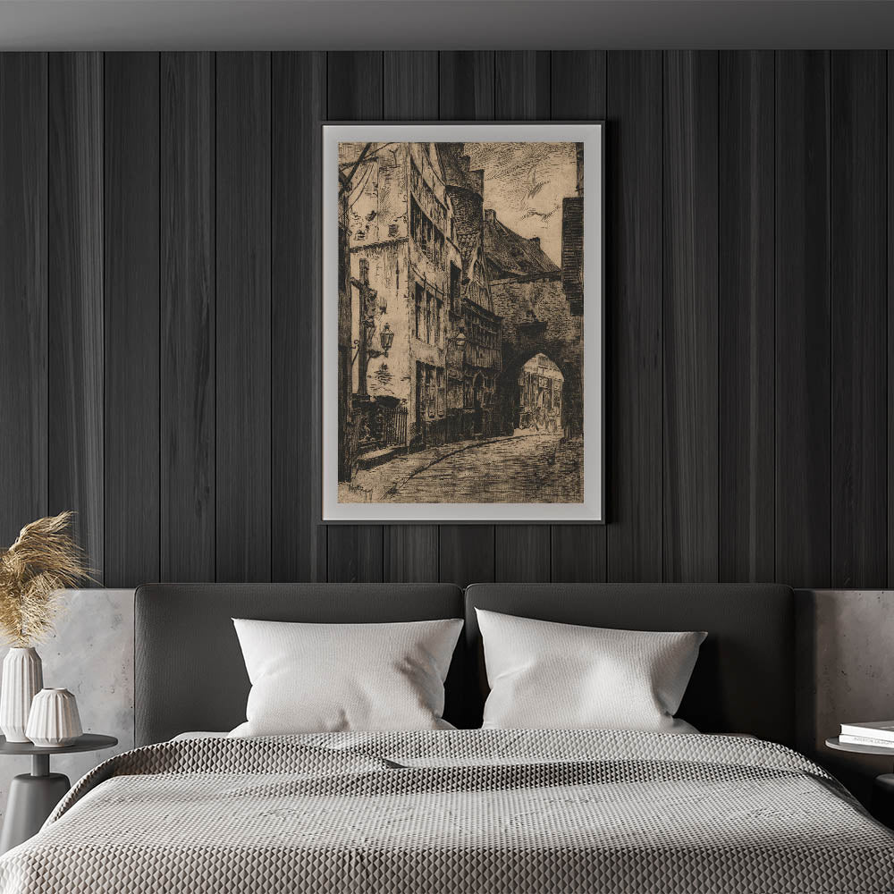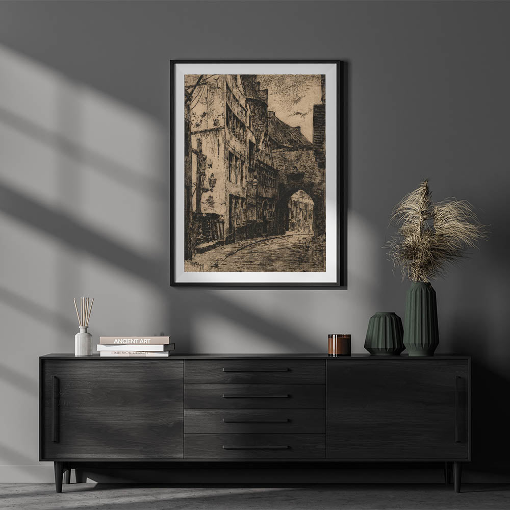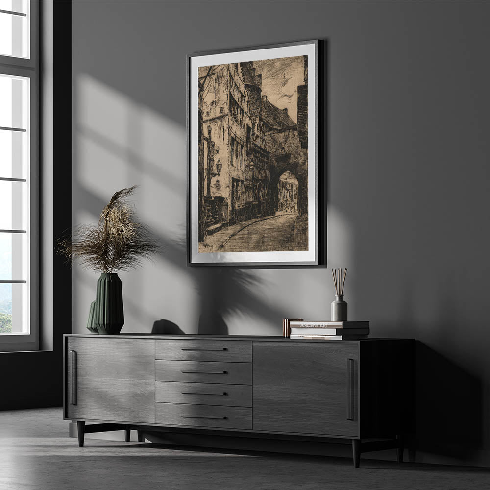This Gothic wall art captures the essence of a medieval street scene, featuring intricate architectural details and shadowy alleyways. The dark tones and textured lines evoke a sense of mystery and history, making this piece a stunning representation of vintage Gothic prints. The artwork showcases a timeless European street, with winding roads and ancient buildings that transport viewers to another era. Ideal for those who appreciate medieval Gothic themes, this print adds an air of elegance and nostalgia to any room.