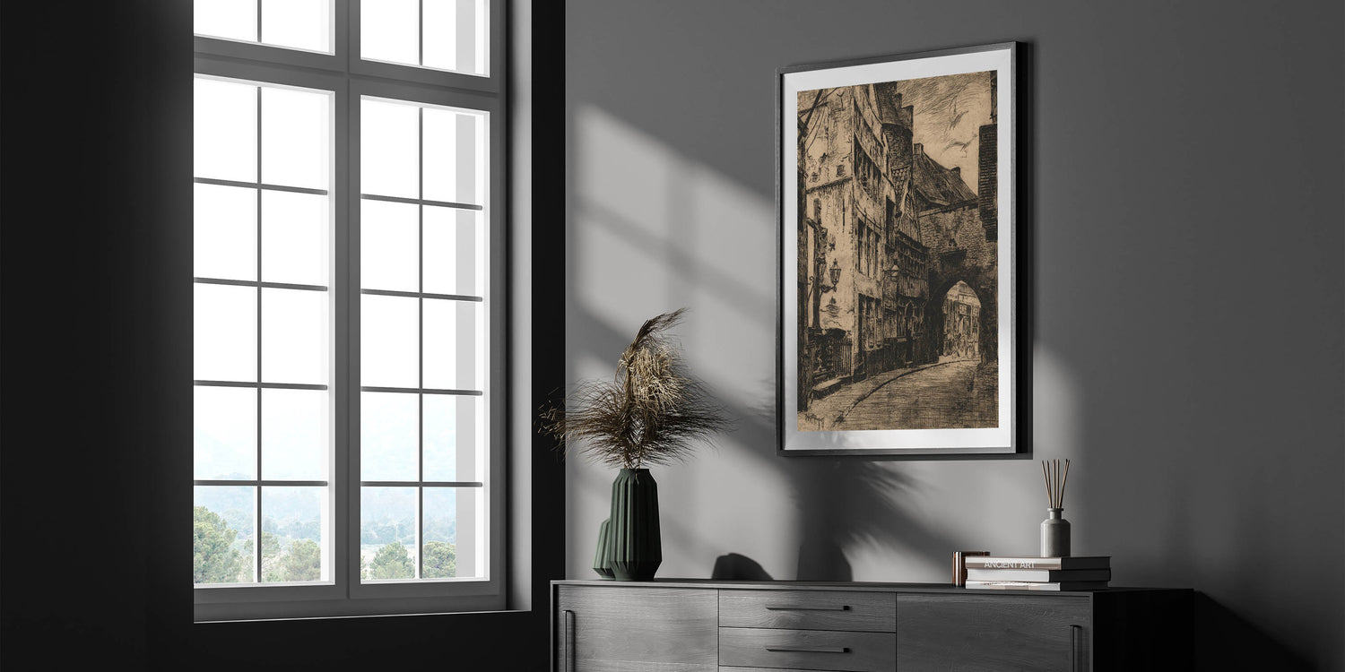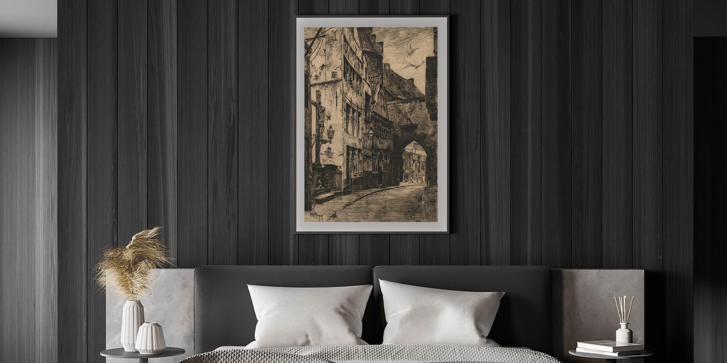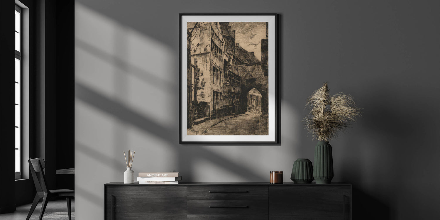 This Gothic wall art captures the essence of a medieval street scene, featuring intricate architectural details and shadowy alleyways. The dark tones and textured lines evoke a sense of mystery and history, making this piece a stunning representation of vintage Gothic prints. The artwork showcases a timeless European street, with winding roads and ancient buildings that transport viewers to another era. Ideal for those who appreciate medieval Gothic themes, this print adds an air of elegance and nostalgia to any room.