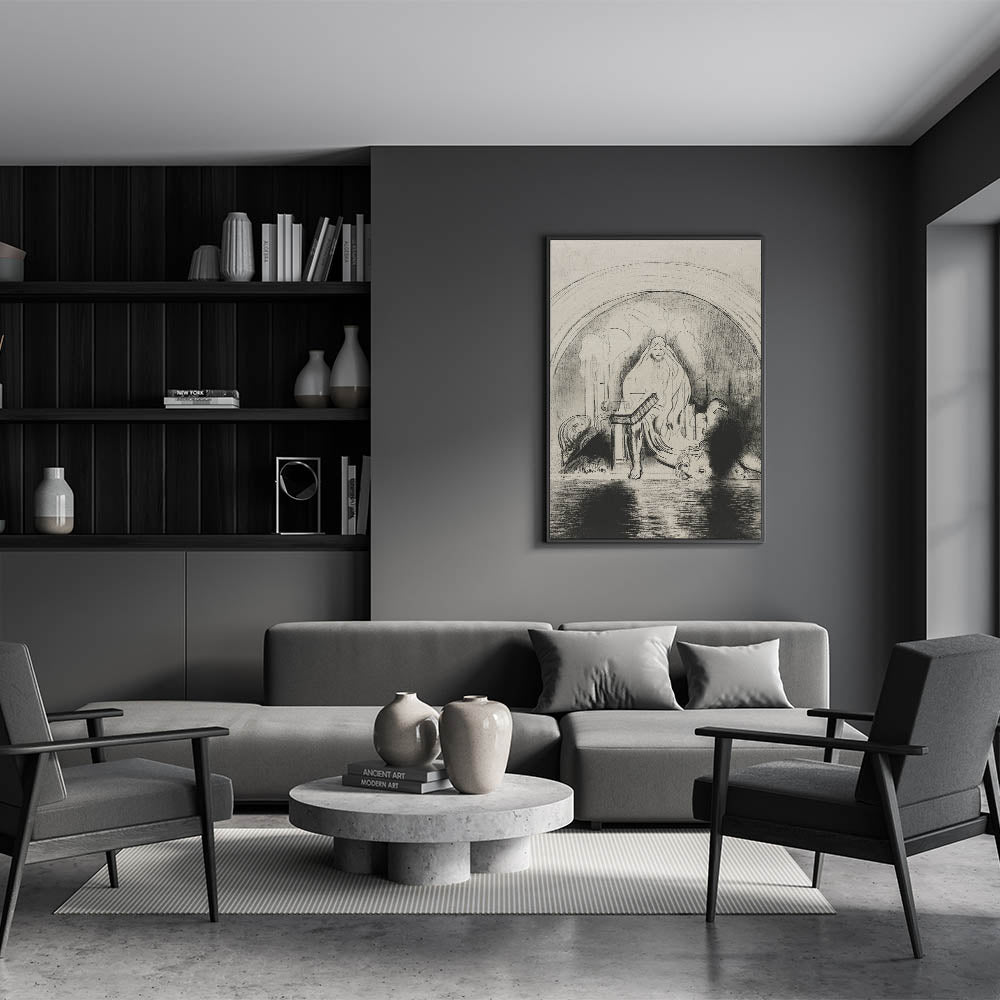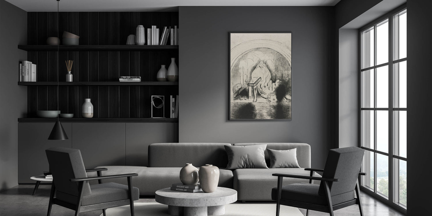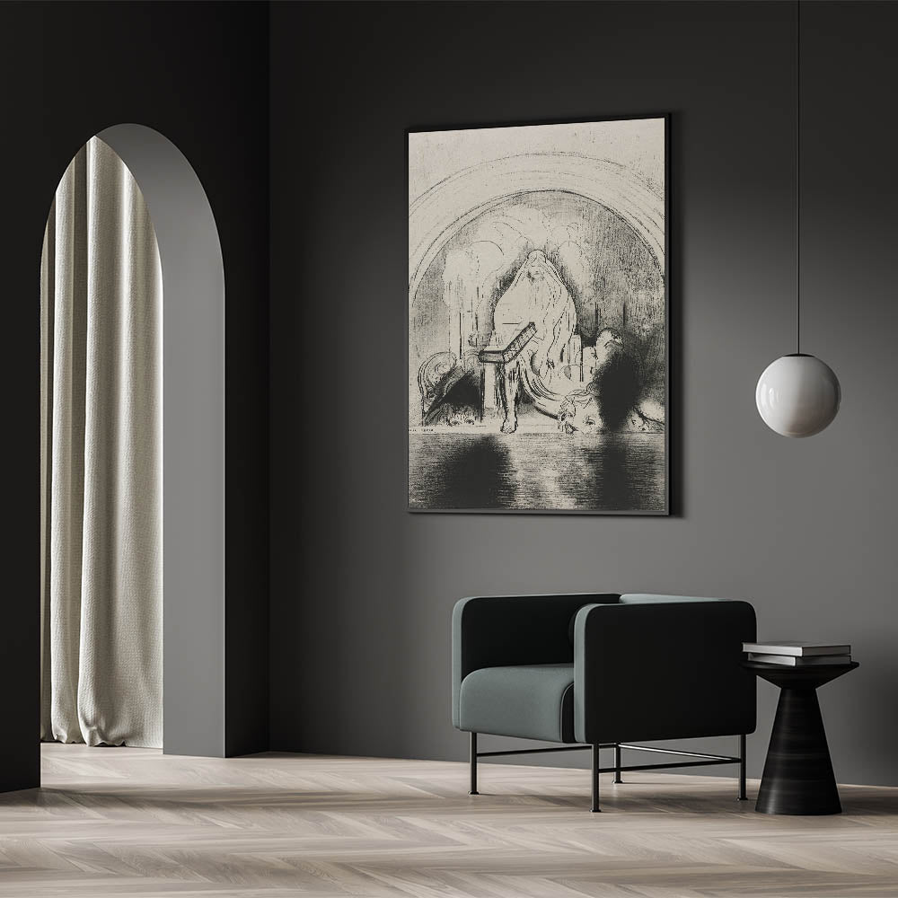 This Gothic wall art showcases a mystical veiled figure seated in a shadowy, mysterious setting. The flowing lines and dark shadows evoke a sense of enigma and timeless power, making it an exceptional representation of vintage Gothic prints. The intricate details and hidden faces surrounding the figure add to the depth and intrigue of this medieval Gothic-themed design, making it an ideal piece for those who appreciate dark decor style. This artwork draws viewers into a world of ancient mystery and symbolism, perfect for creating a dramatic focal point in any space.