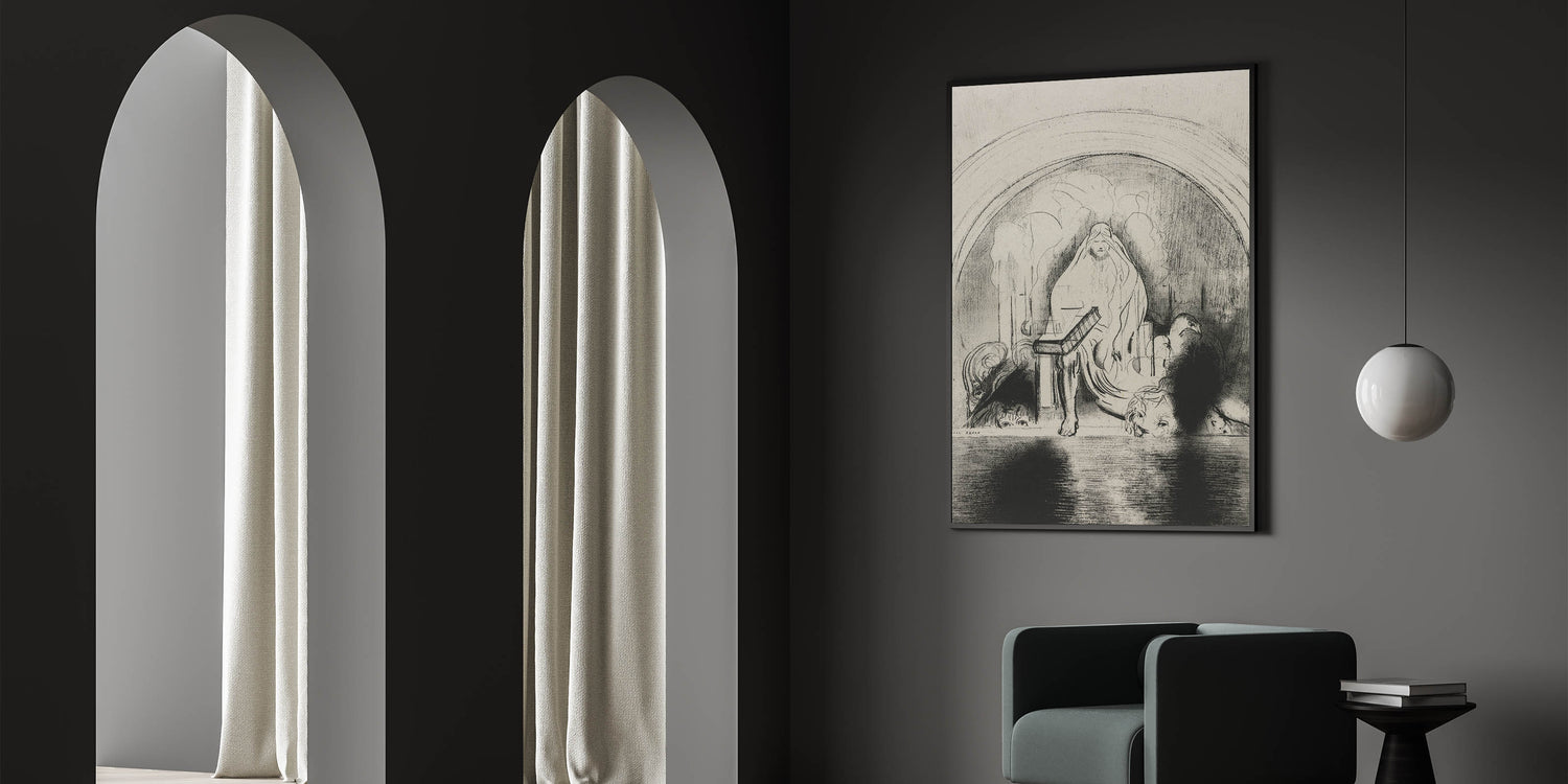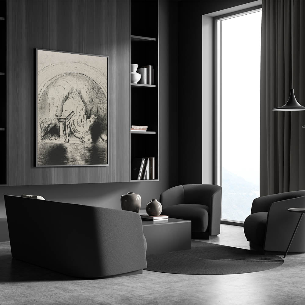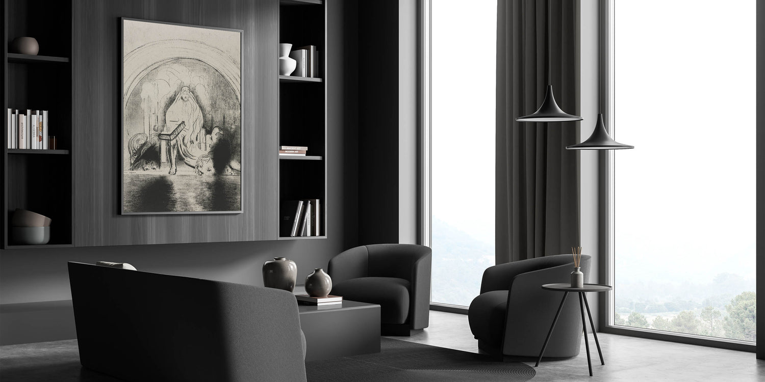 This Gothic wall art showcases a mystical veiled figure seated in a shadowy, mysterious setting. The flowing lines and dark shadows evoke a sense of enigma and timeless power, making it an exceptional representation of vintage Gothic prints. The intricate details and hidden faces surrounding the figure add to the depth and intrigue of this medieval Gothic-themed design, making it an ideal piece for those who appreciate dark decor style. This artwork draws viewers into a world of ancient mystery and symbolism, perfect for creating a dramatic focal point in any space.