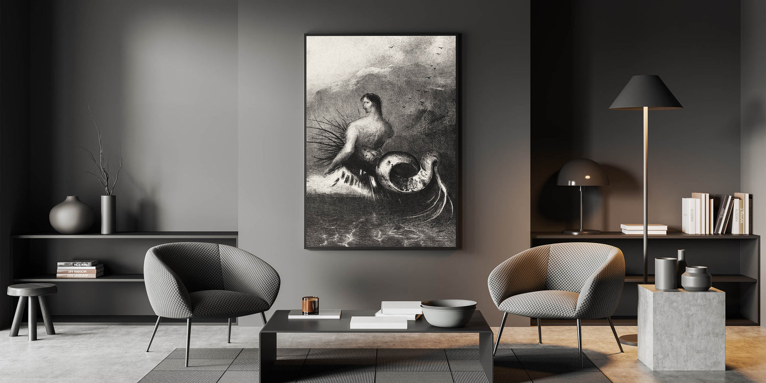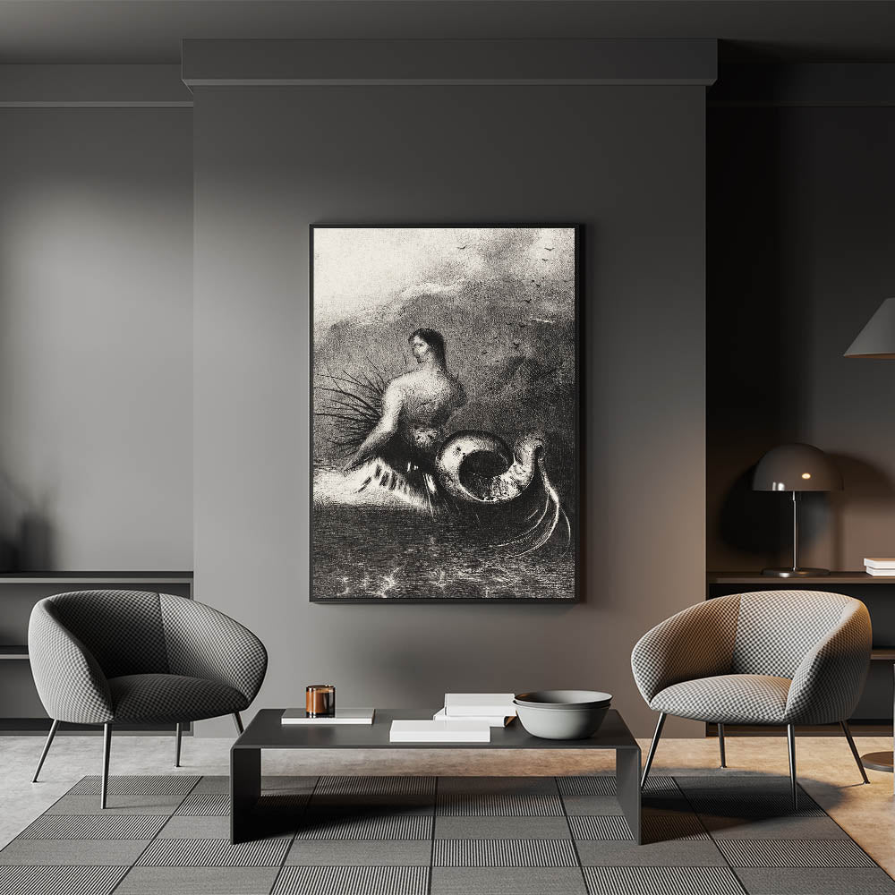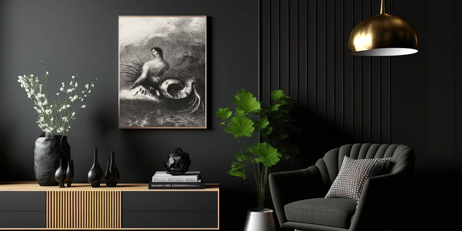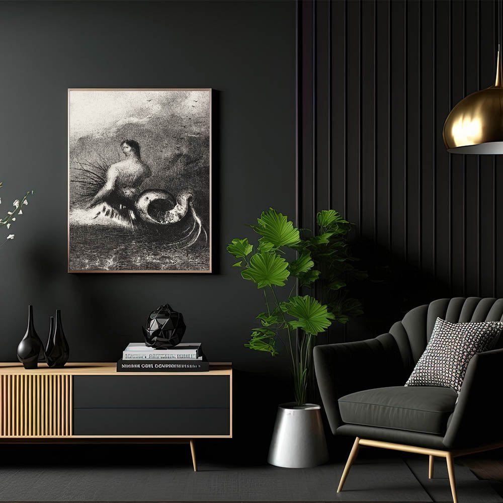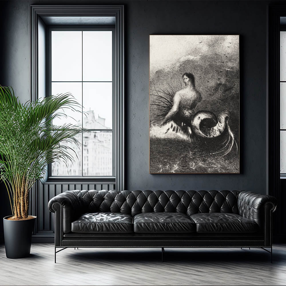 Embrace the eerie beauty of this Gothic Wall Art, featuring a serpent-like creature set against a stormy seascape. This dark and mysterious illustration captures the imagination with its otherworldly design, perfect for creating an atmospheric mood in any room. The combination of the human-like figure and the coiled serpent tail evokes a sense of fantasy and Gothic themes, ideal for lovers of dark decor styles and the mysterious unknown.