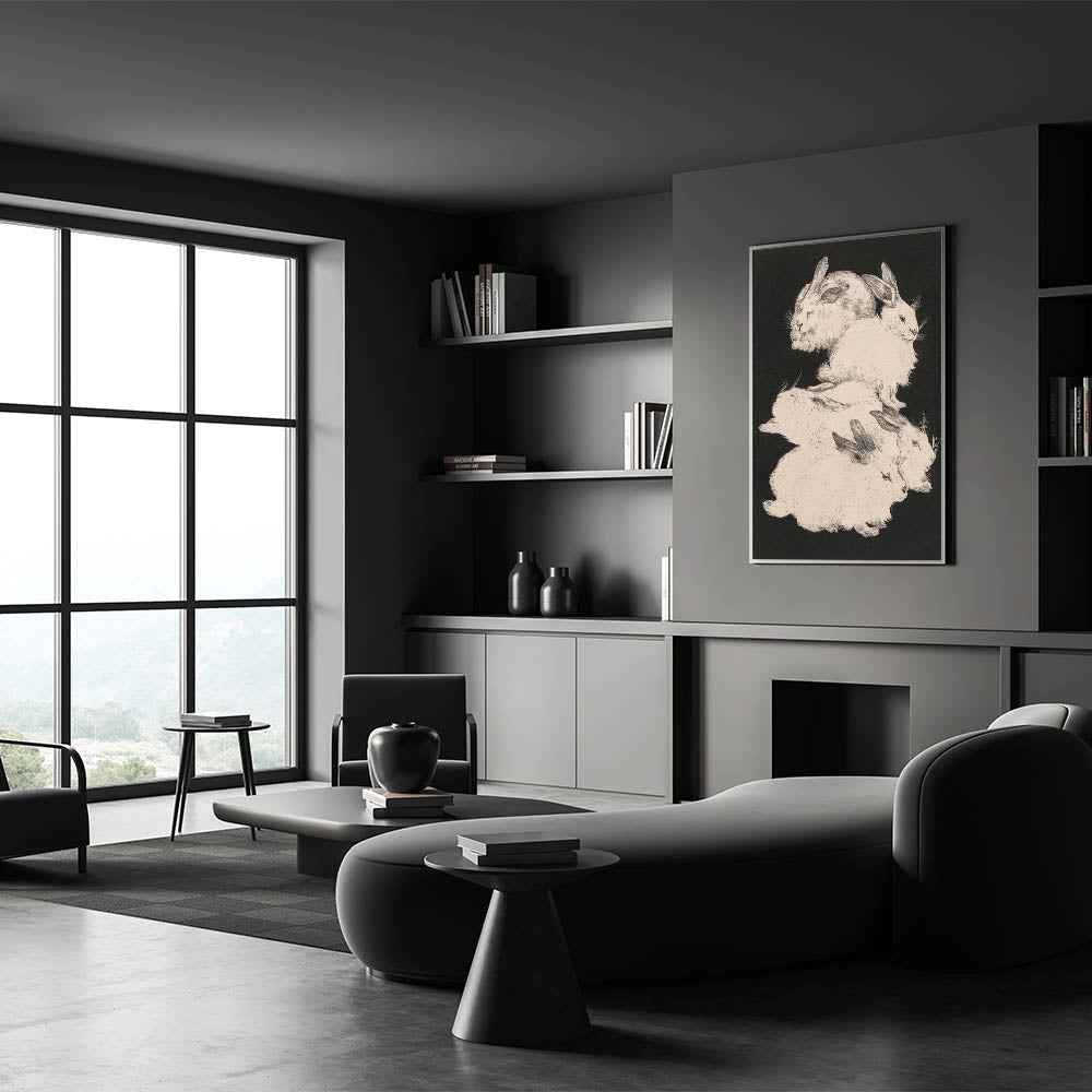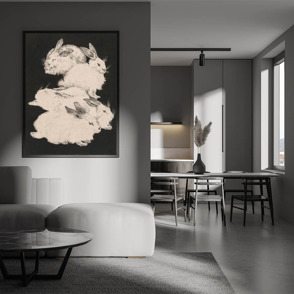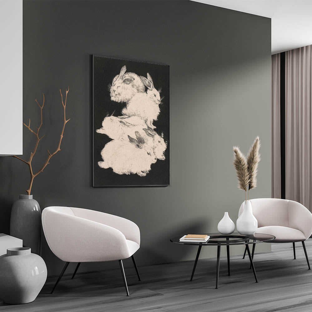 Bring a touch of the surreal into your space with this Gothic Wall Art, featuring a group of rabbits illustrated with a haunting, dreamlike quality. The dark background contrasts beautifully with the delicate details of the rabbits, offering a sense of both calm and mystery. Ideal for lovers of dark decor styles, this artwork is perfect for creating a unique and atmospheric space.