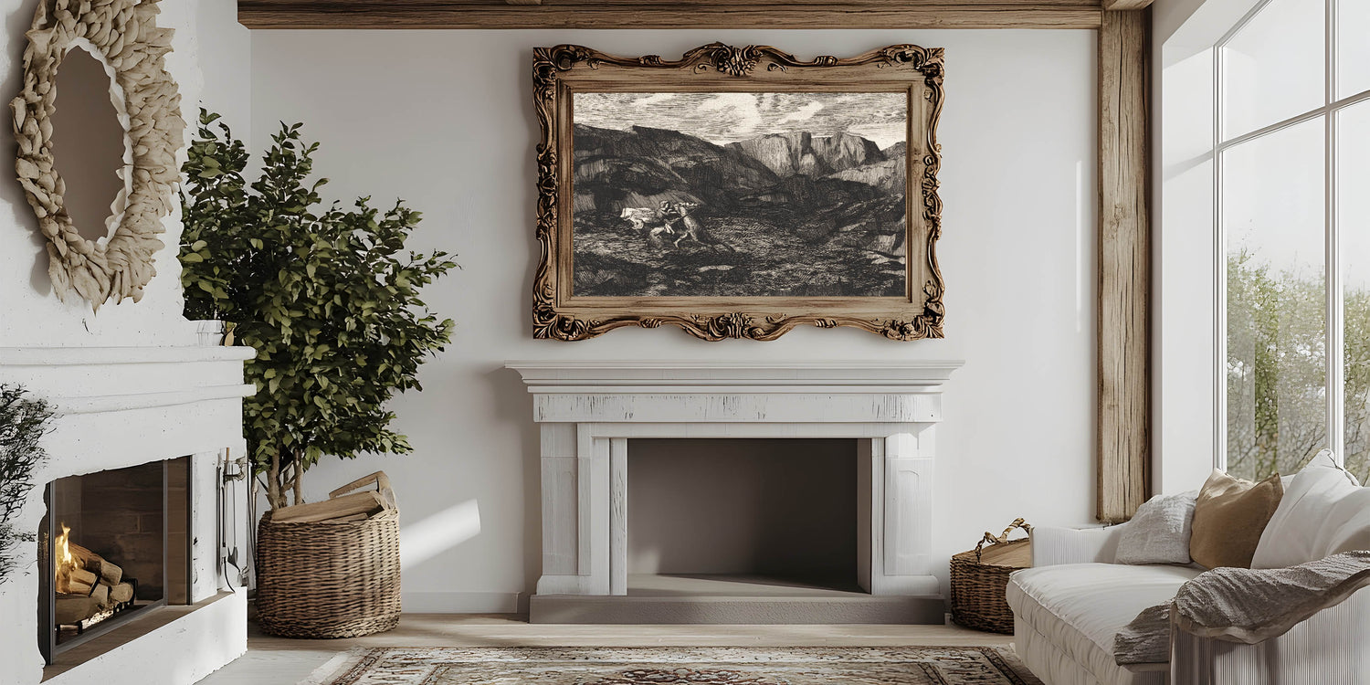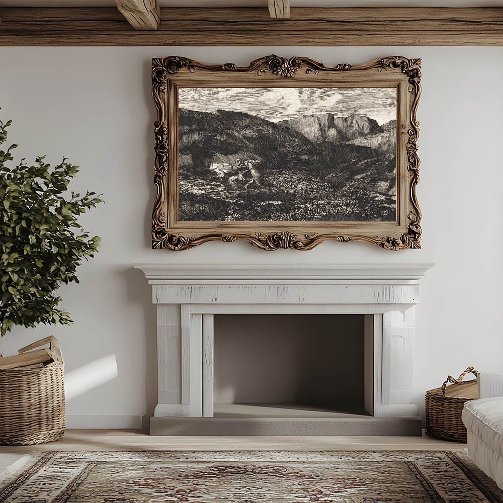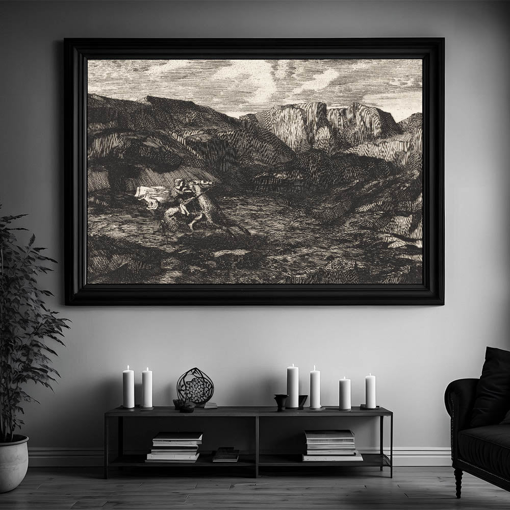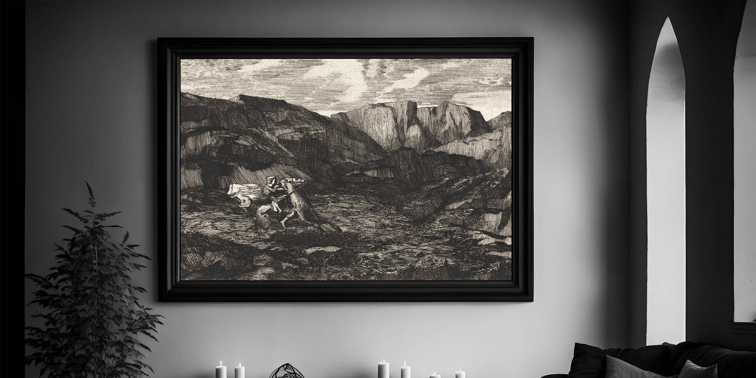 Embrace the mystery and adventure of Gothic art with this striking depiction of a lone rider traversing a rugged landscape. This artwork, filled with intricate etching details and a dramatic sense of movement, evokes a timeless and adventurous atmosphere. Perfect for those who appreciate medieval and Gothic-inspired themes, this piece is ideal for enhancing any space with an element of mystery and heroic elegance.