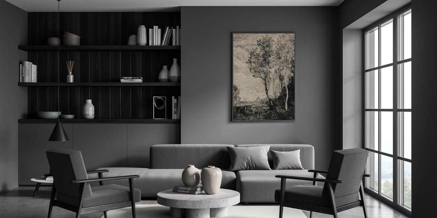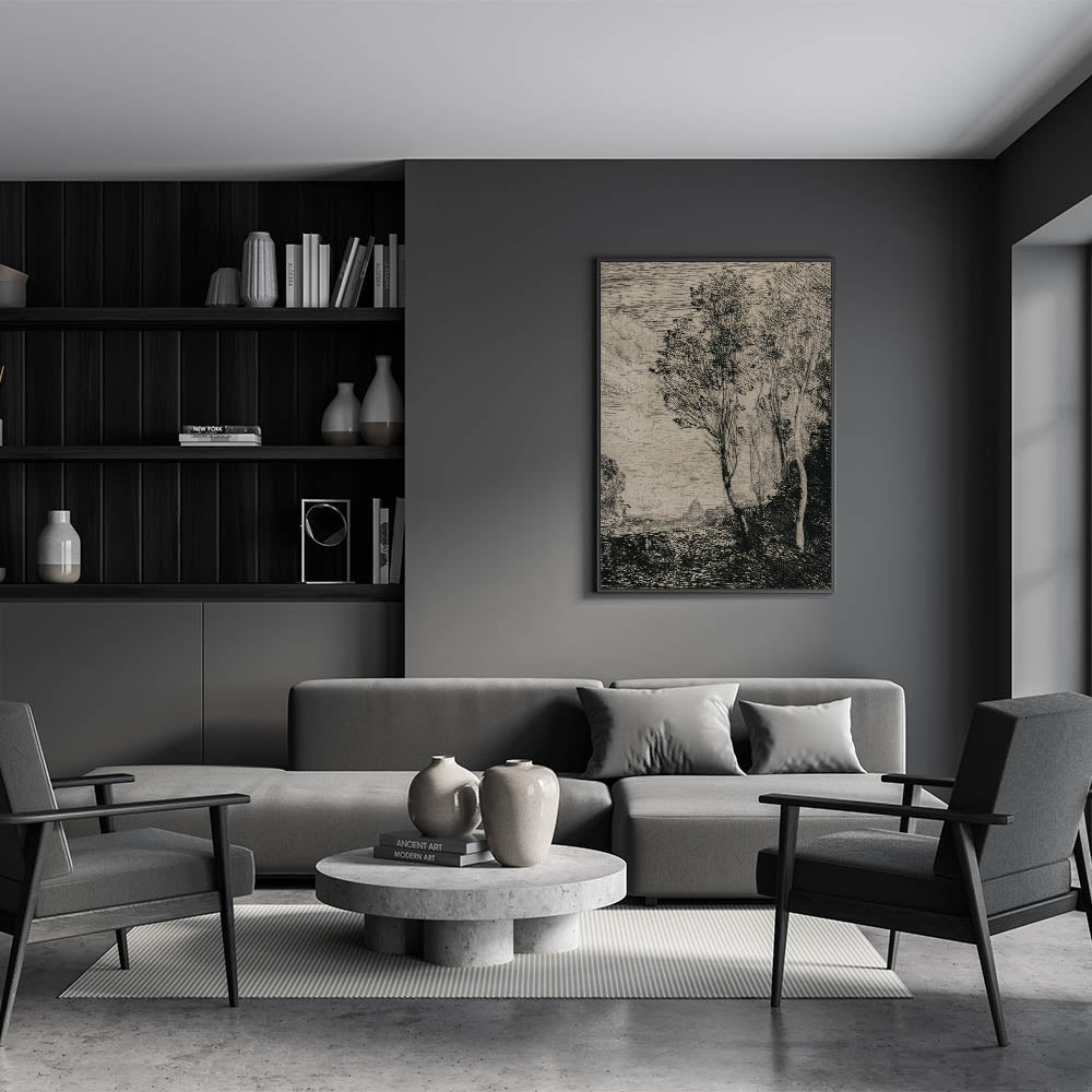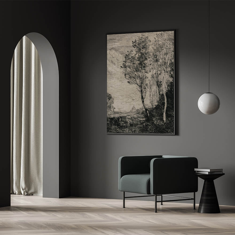 Transform your space with this captivating Gothic landscape artwork that features a moody, medieval-inspired scene. The illustration showcases towering trees and an ominous distant structure, evoking a sense of mystery and timelessness. Perfect for lovers of Gothic art, this piece adds depth and intrigue to any room, making it an ideal choice for those looking to create an atmospheric and sophisticated space.
