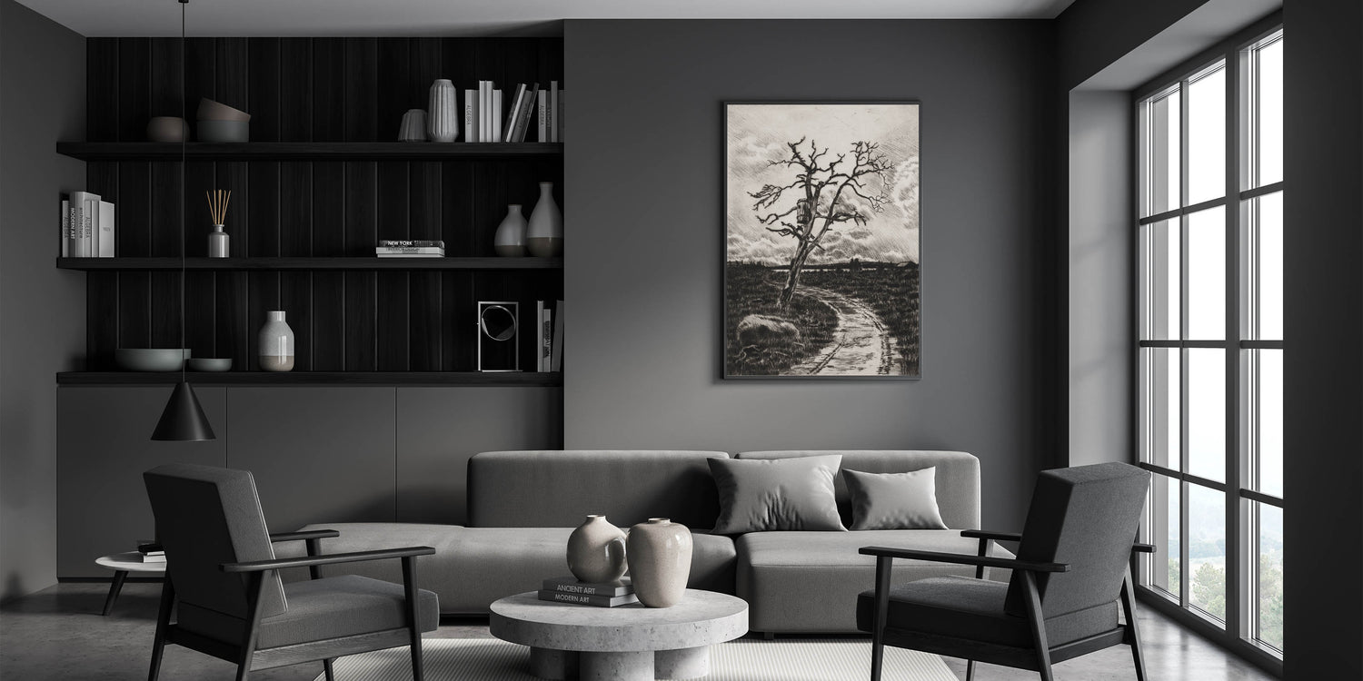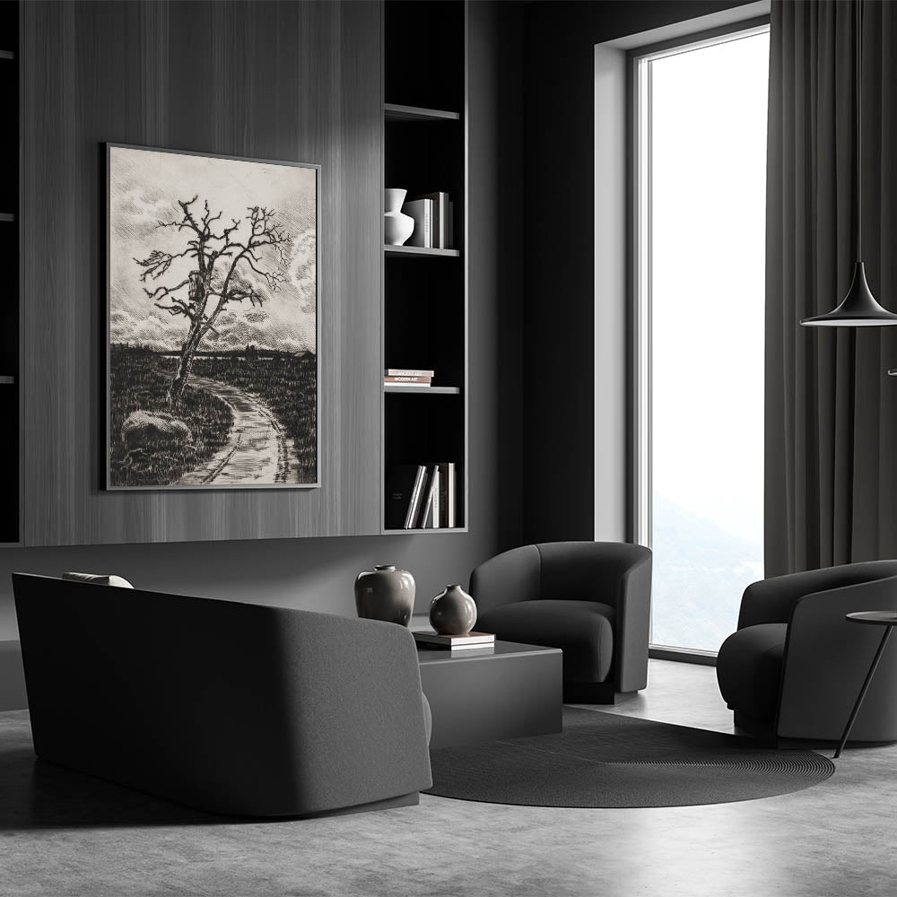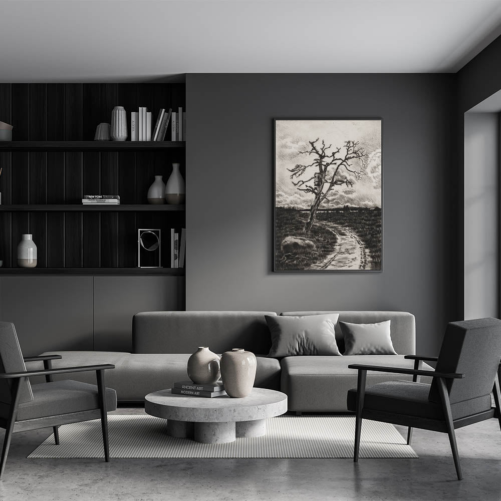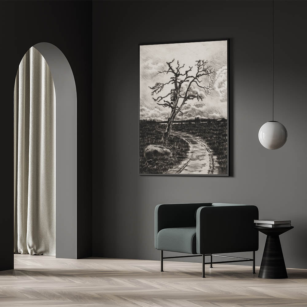 Explore the haunting beauty of this Gothic wall art, featuring a desolate, winding path under a stormy sky. The leafless tree and the rugged landscape evoke a sense of solitude and mystery, making this piece an ideal choice for those seeking a dark decor style. This Gothic-inspired design creates a captivating focal point in any room, perfect for enhancing an ambiance of intrigue and elegance.