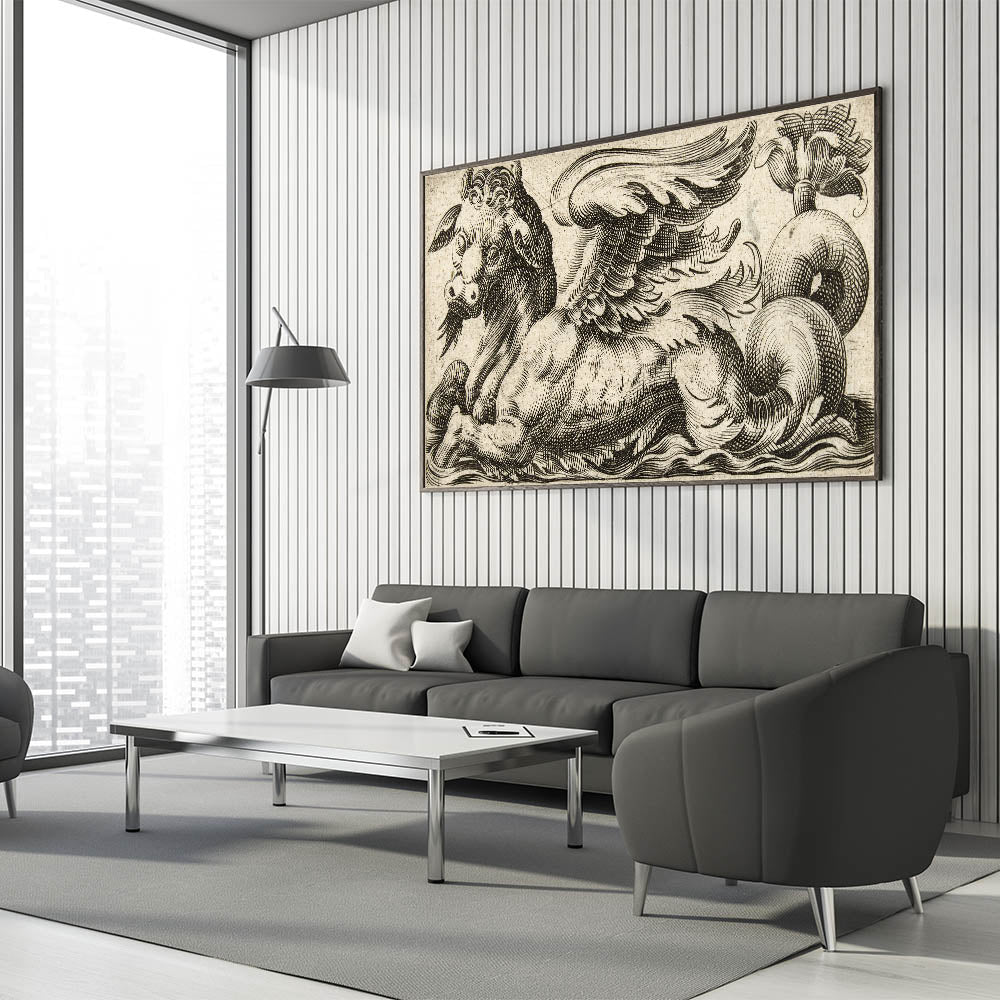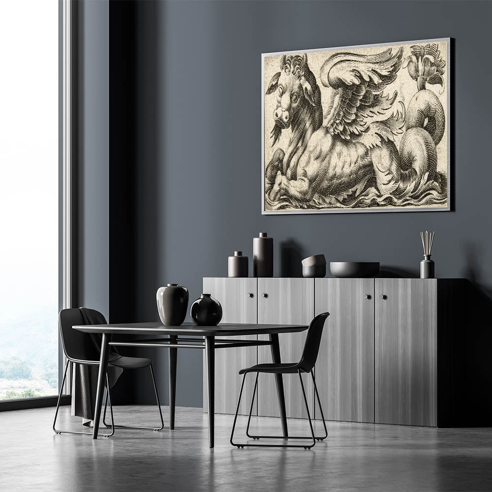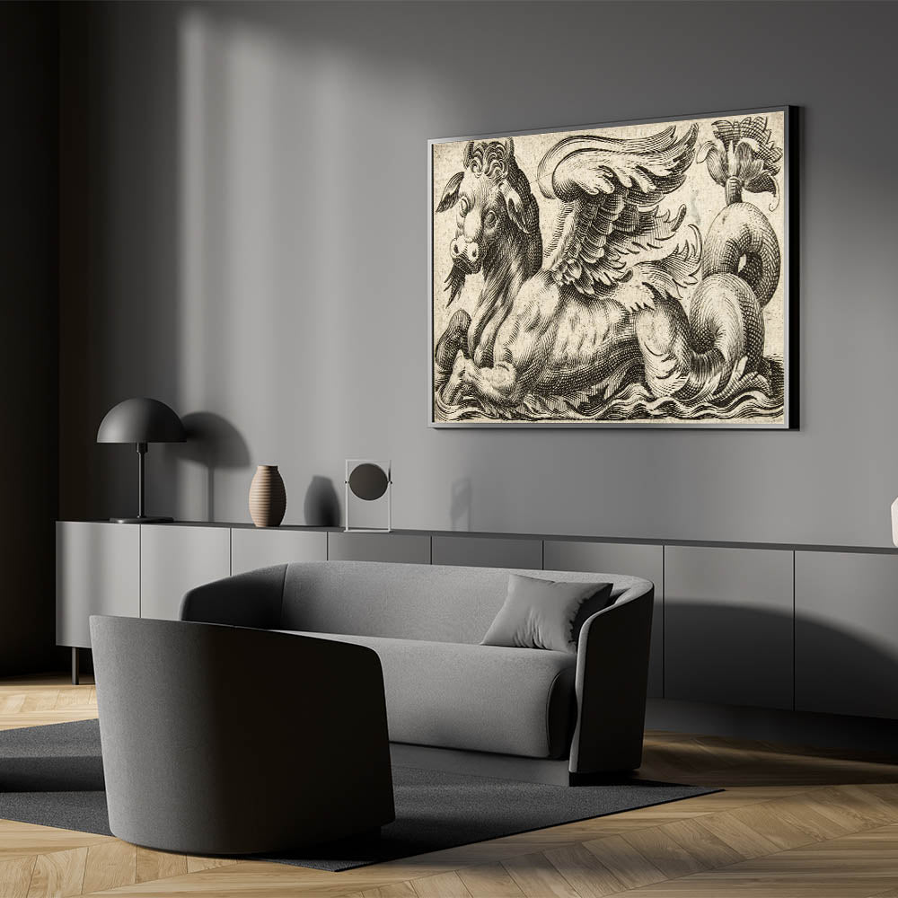 Dive into the world of Gothic mythology with this captivating wall art piece featuring a detailed illustration of a mythical winged beast. This Gothic-inspired design perfectly captures the essence of dark decor and medieval artistry, making it an excellent choice for those who appreciate vintage Gothic prints. The intricate line work and classic depiction of the creature evoke a sense of mystery and timelessness, transforming any space into a Gothic haven.