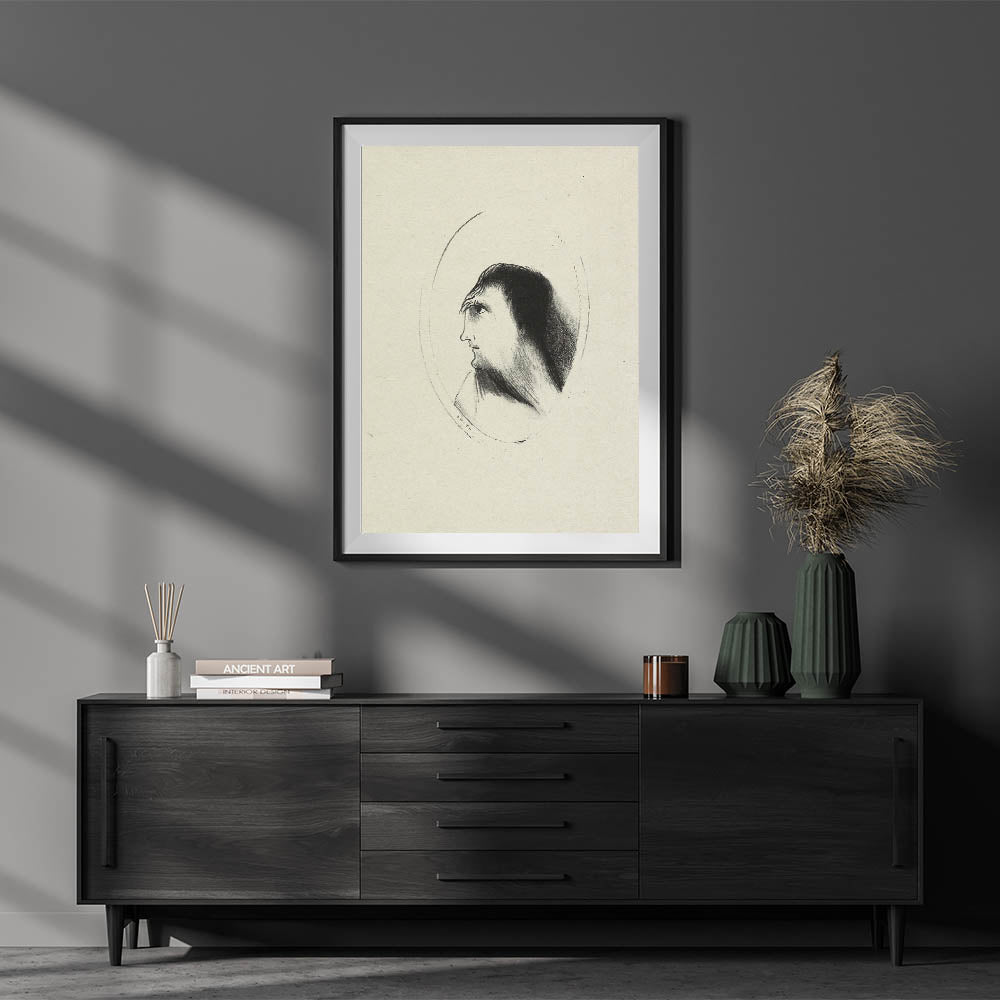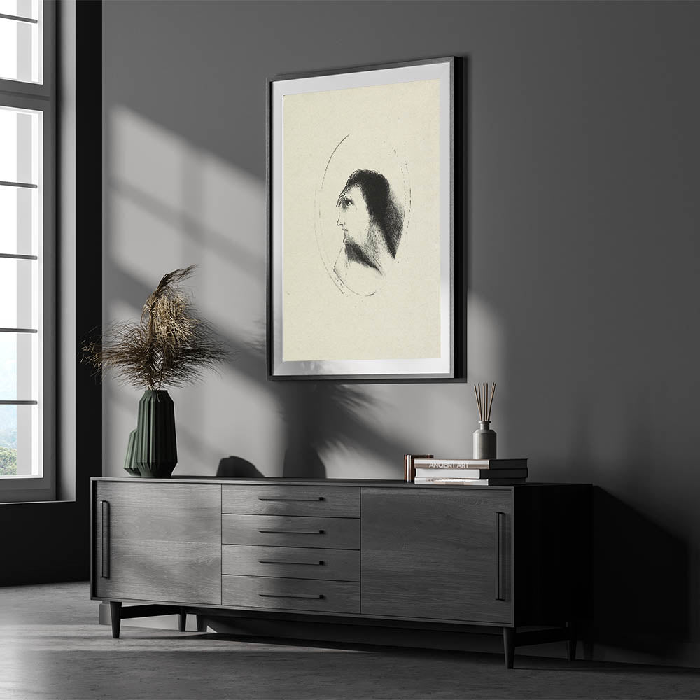 This Gothic wall art piece presents a haunting profile sketch of a mysterious figure, captured with a medieval and vintage aesthetic. The artwork's subtle shading and sharp lines evoke an air of enigma, making it a perfect addition for those who appreciate the elegance and mystery of Gothic style. Ideal for transforming any room into a moody, introspective space, this piece enhances your home with a touch of timeless Gothic charm.