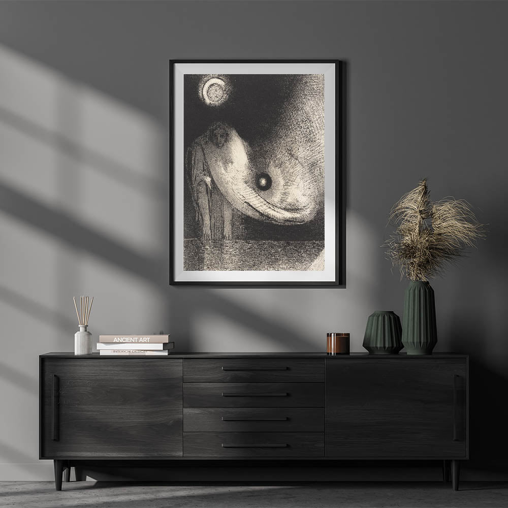 Step into a realm of mystery with this captivating Gothic wall art featuring an eerie figure illuminated by a glowing celestial sphere. The dark, shadowy tones and intricate textures create a haunting and timeless atmosphere, perfect for those looking to bring a sense of medieval intrigue into their space. This Gothic-inspired design is an elegant addition to any room, enhancing the ambiance with its mysterious and dramatic presence.