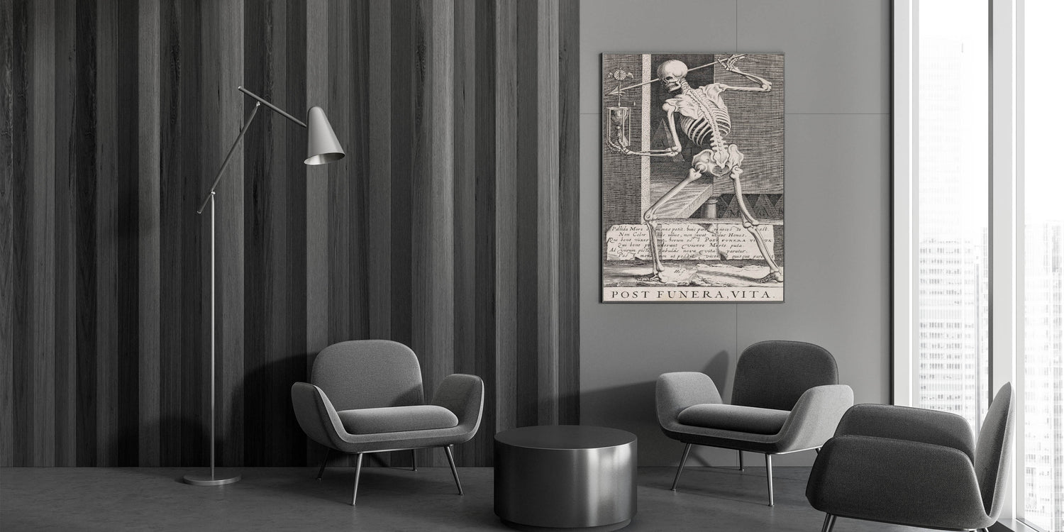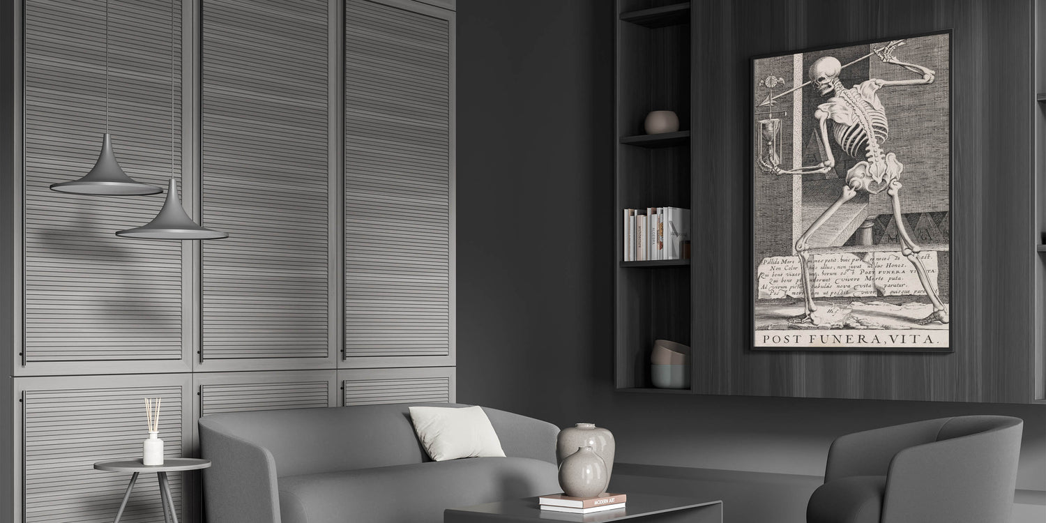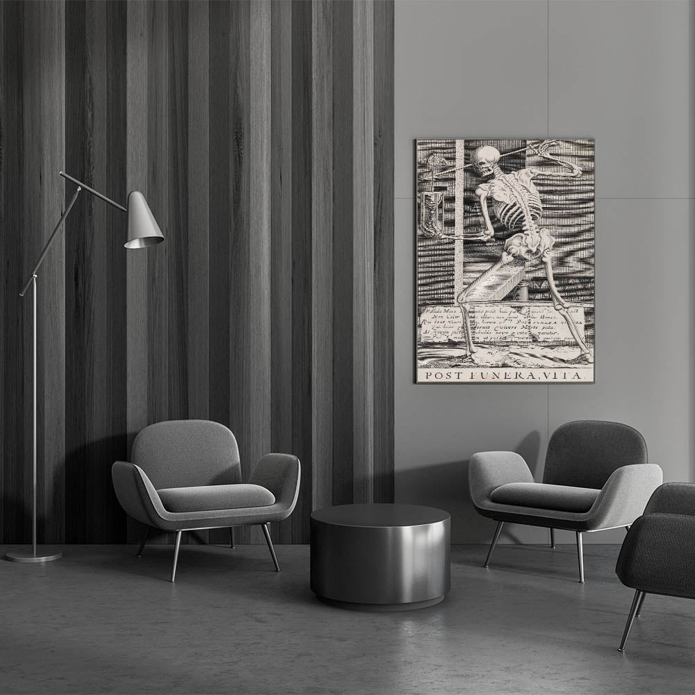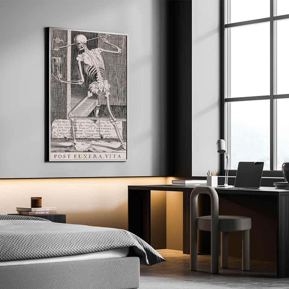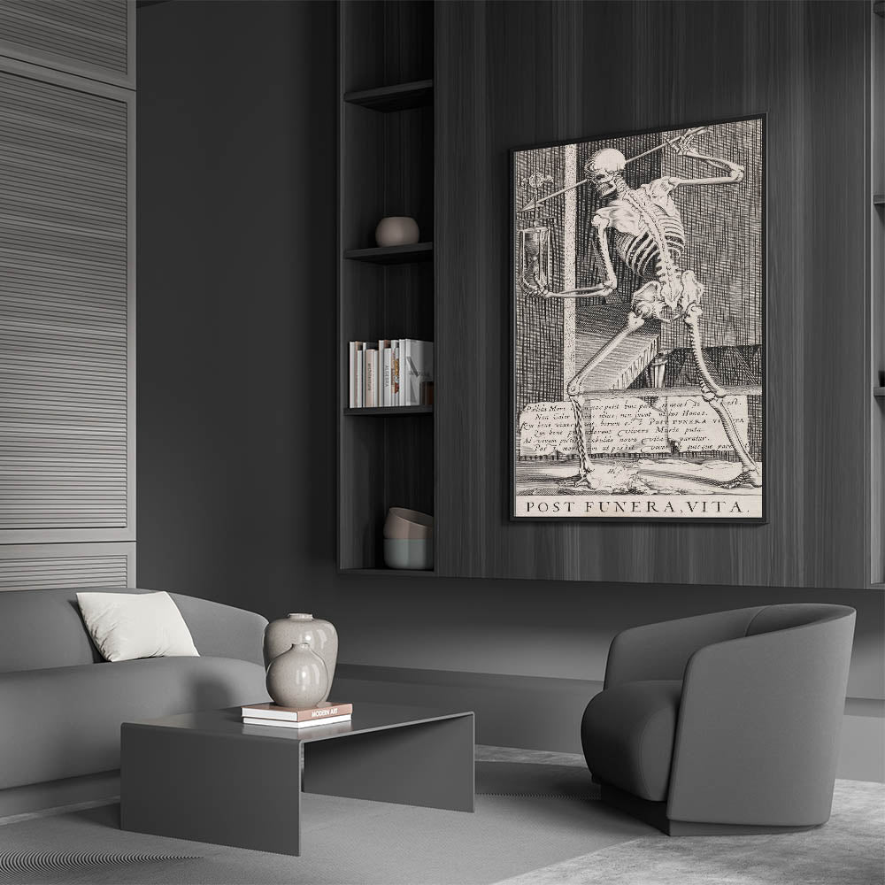 Embrace the timeless theme of mortality with this striking Gothic artwork featuring a skeleton holding an hourglass. This detailed etching serves as a classic memento mori, reminding viewers of the fleeting nature of life and the passage of time. The artwork's meticulous lines and symbolic imagery, including the Latin phrase "Post Funera, Vita" (After Death, Life), create a powerful visual narrative that is both thought-provoking and hauntingly beautiful. Perfect for those drawn to macabre or existential themes, this piece is an evocative addition to any Gothic-inspired space, study, or library. Its intricate design and vintage aesthetic make it an ideal focal point for those seeking to create an atmosphere of reflection and depth.