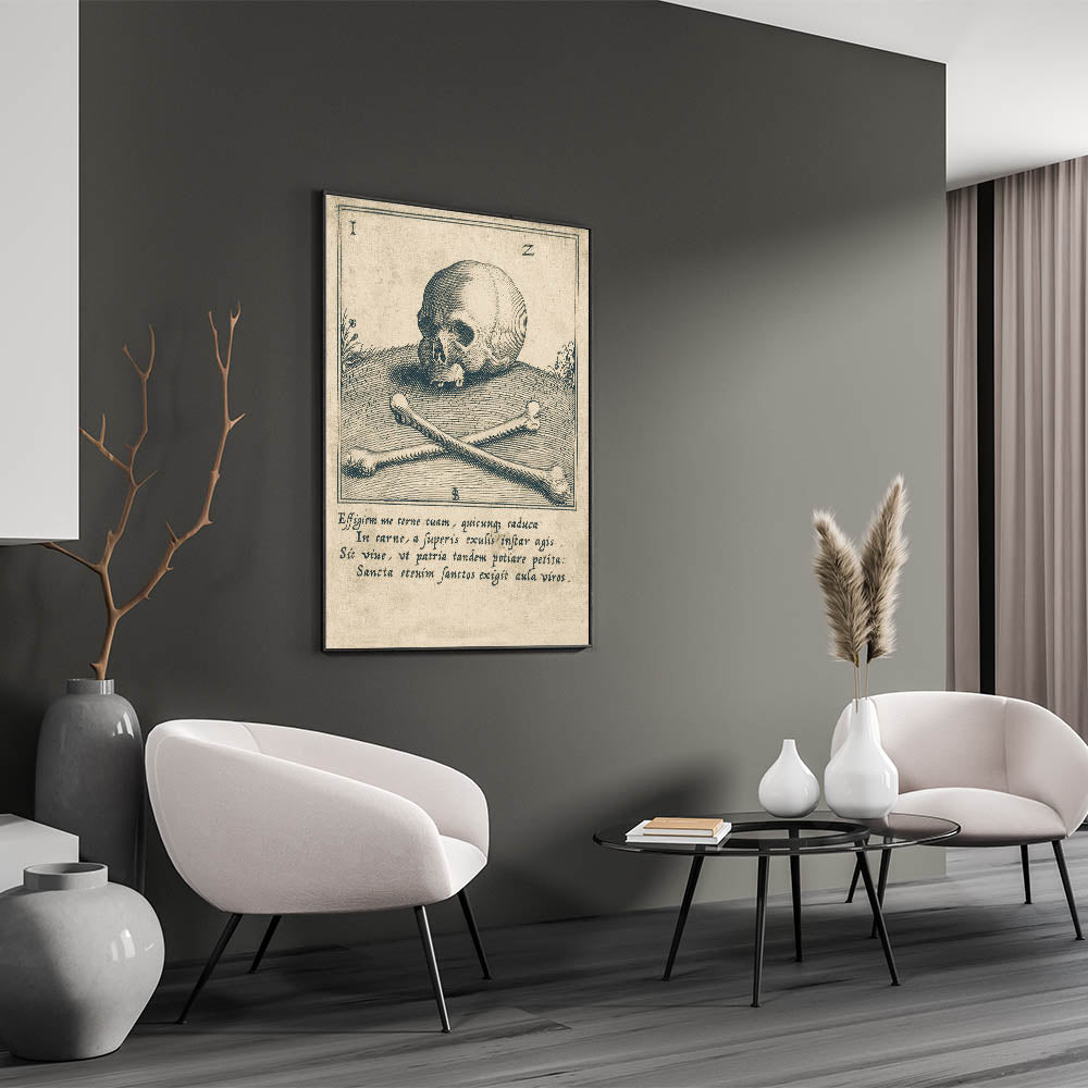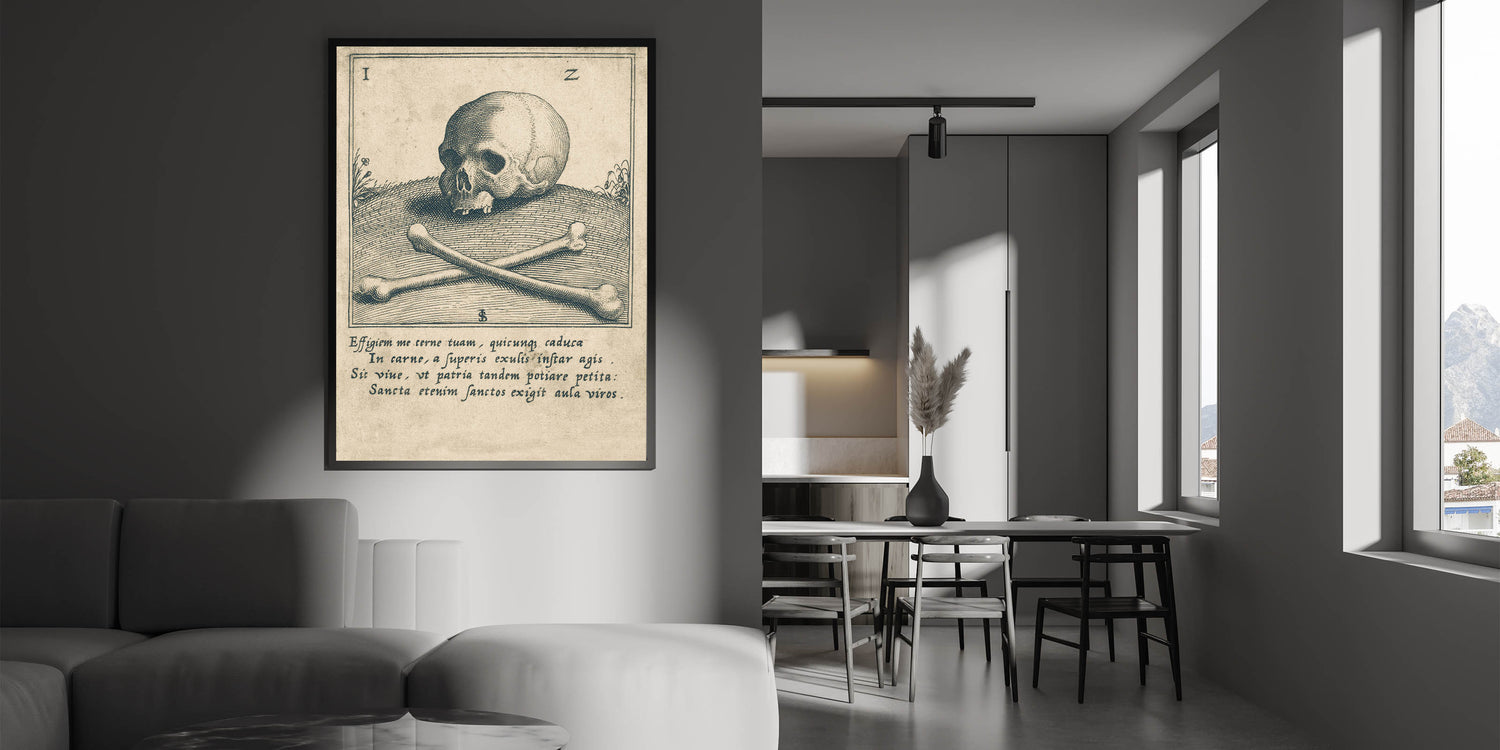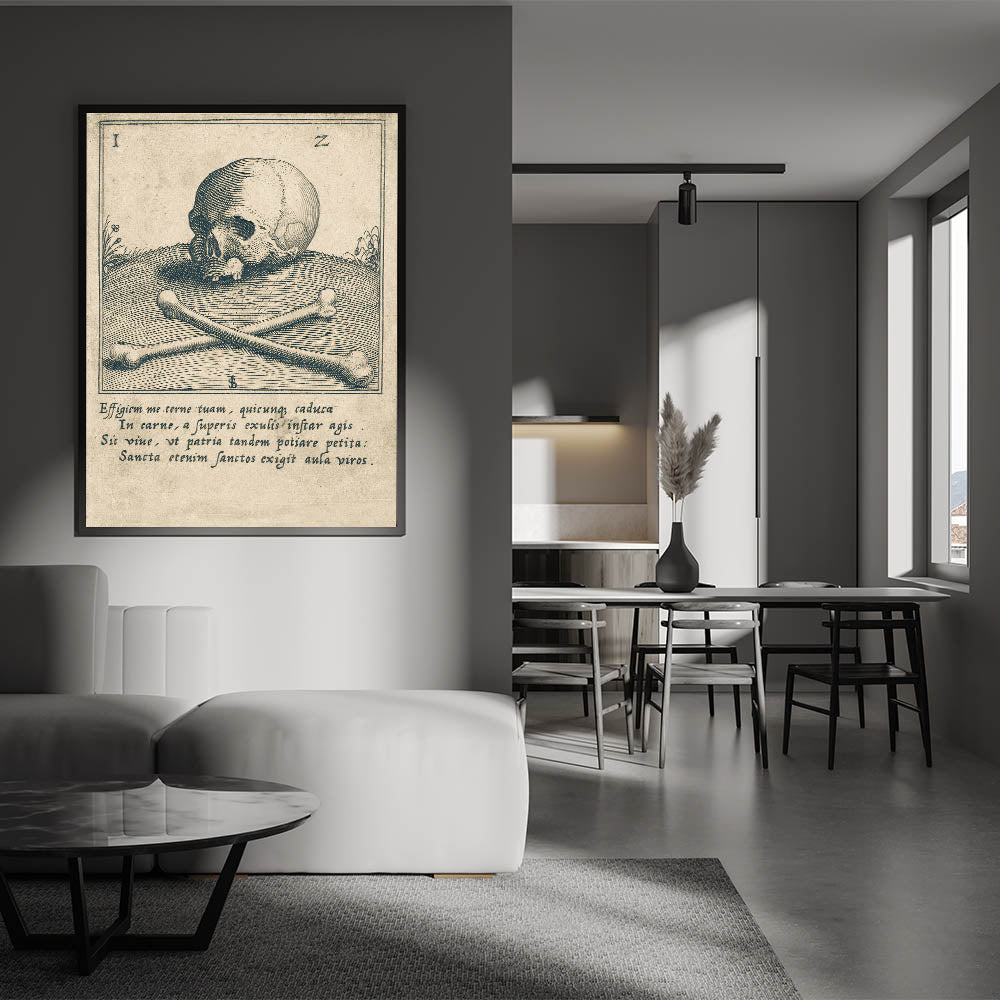 Delve into the macabre with this vintage illustration of a skull and crossbones, set against an ancient Latin inscription. This Gothic wall art piece is a perfect addition for enthusiasts of dark decor styles and medieval aesthetics. The intricate linework and classic imagery evoke a sense of mystery, making this design a timeless choice for those seeking vintage Gothic prints. Ideal for studies, libraries, or living spaces, this piece serves as a powerful reminder of the fragility of life while adding an atmospheric touch to your decor.