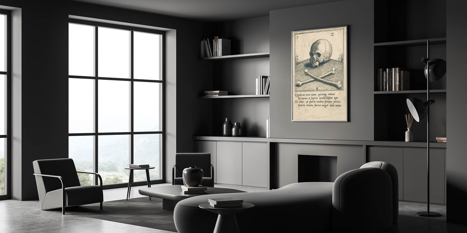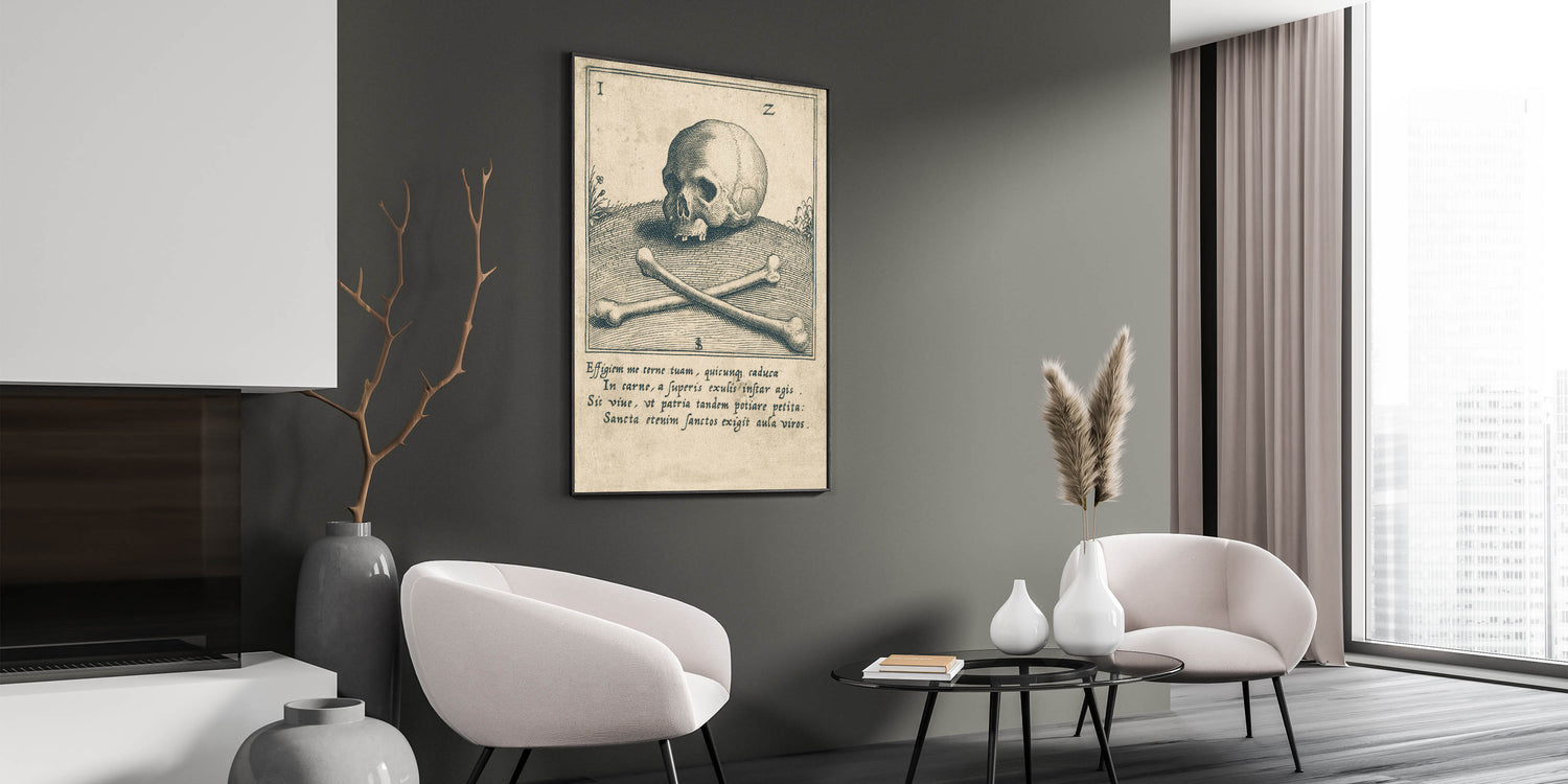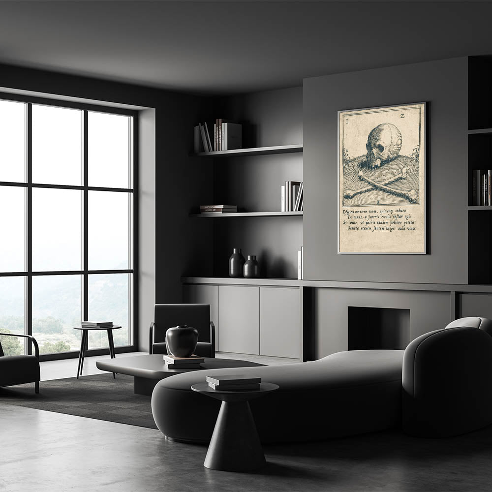 Delve into the macabre with this vintage illustration of a skull and crossbones, set against an ancient Latin inscription. This Gothic wall art piece is a perfect addition for enthusiasts of dark decor styles and medieval aesthetics. The intricate linework and classic imagery evoke a sense of mystery, making this design a timeless choice for those seeking vintage Gothic prints. Ideal for studies, libraries, or living spaces, this piece serves as a powerful reminder of the fragility of life while adding an atmospheric touch to your decor.