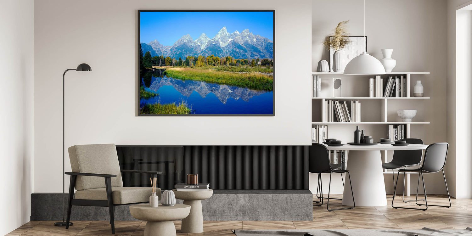 This Grand Teton photography art brings the peaceful beauty of the mountains and their reflection into your space, creating a calming and inviting atmosphere.