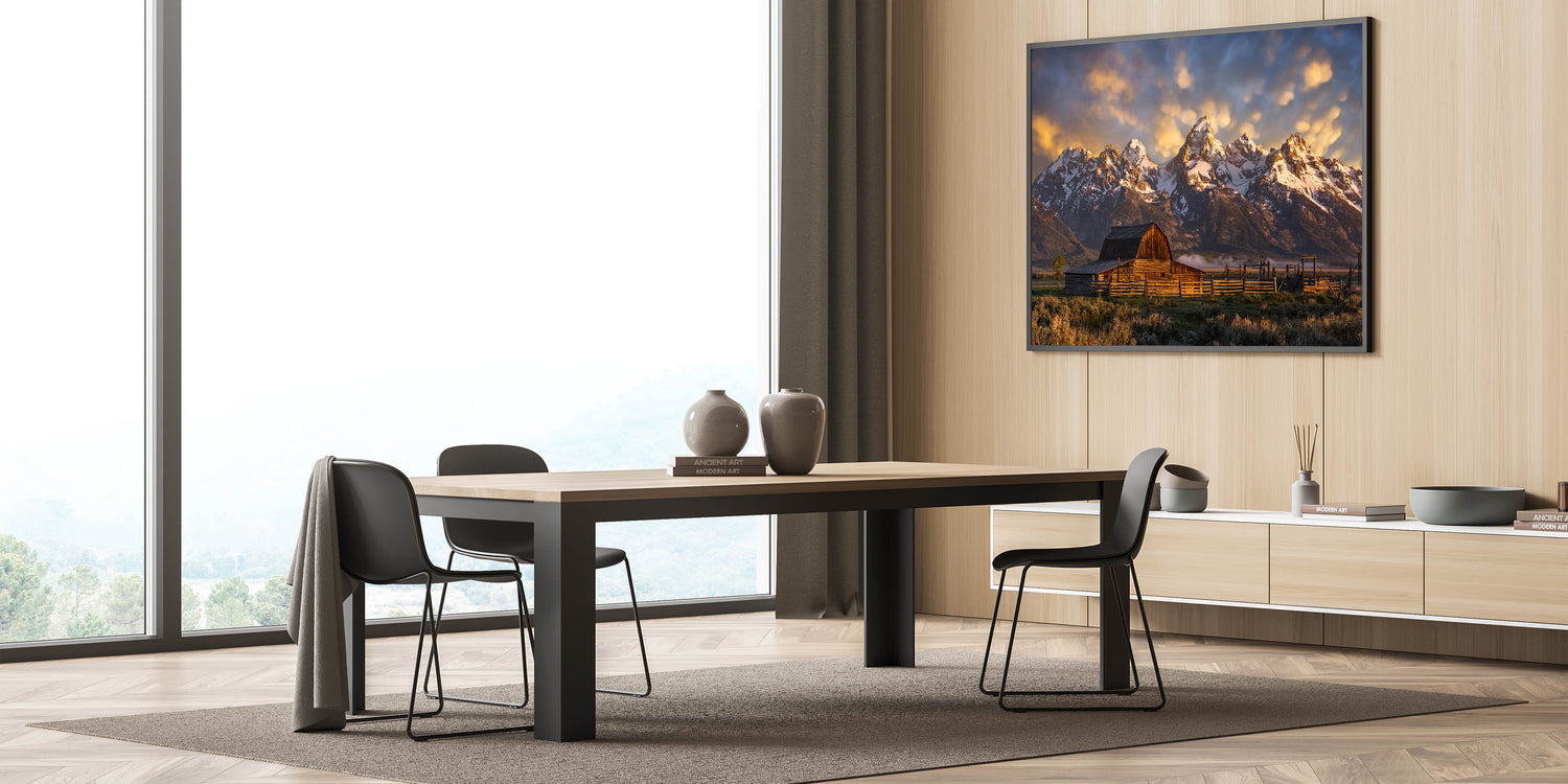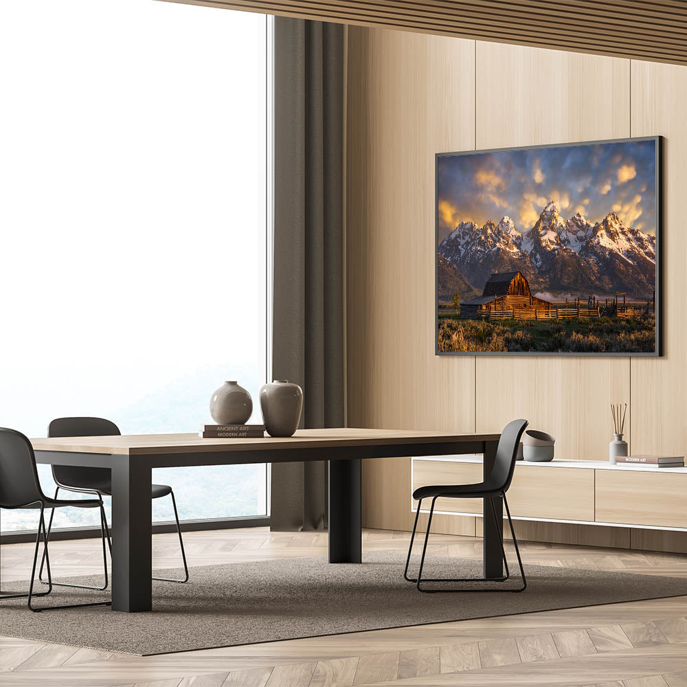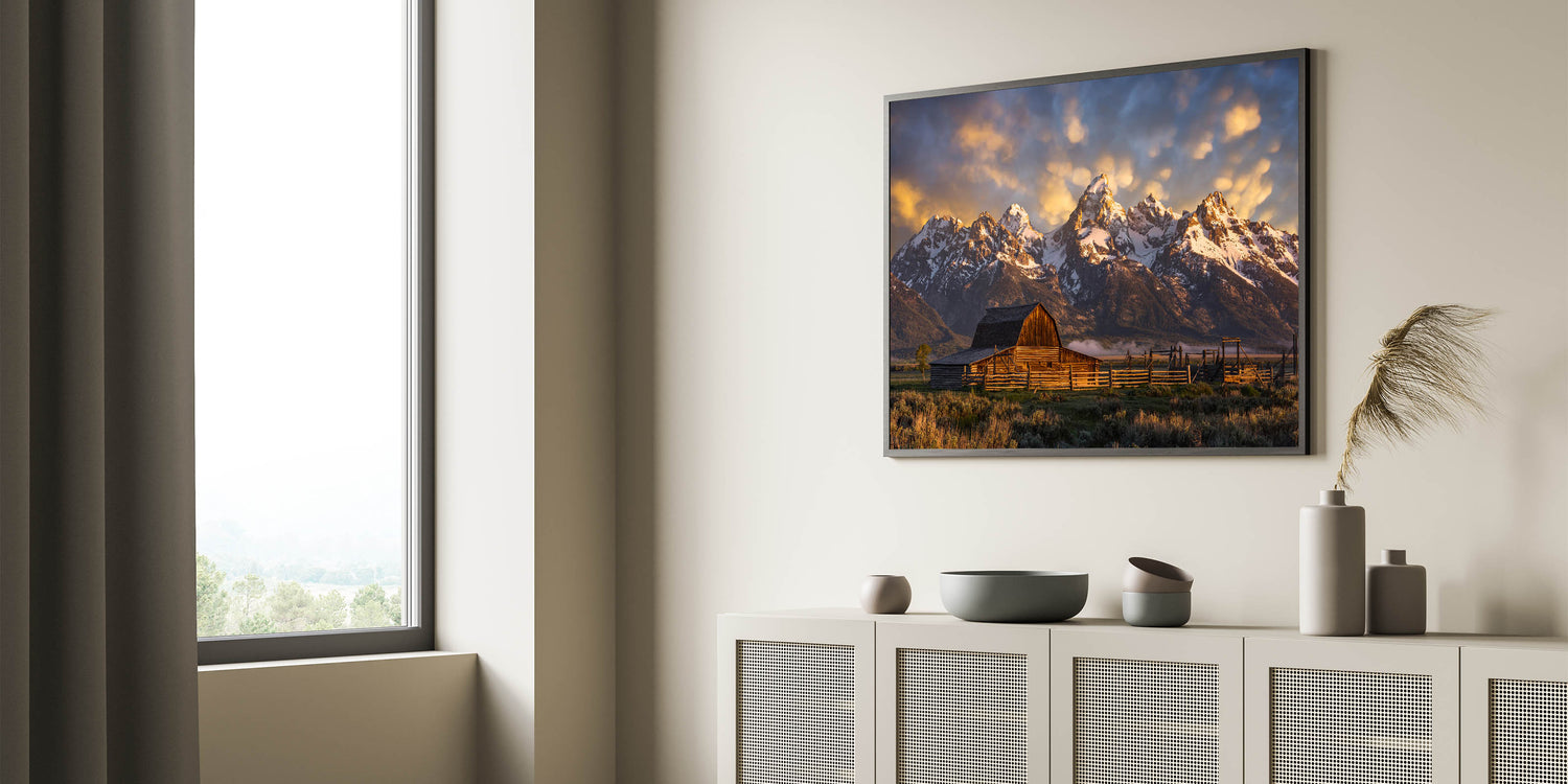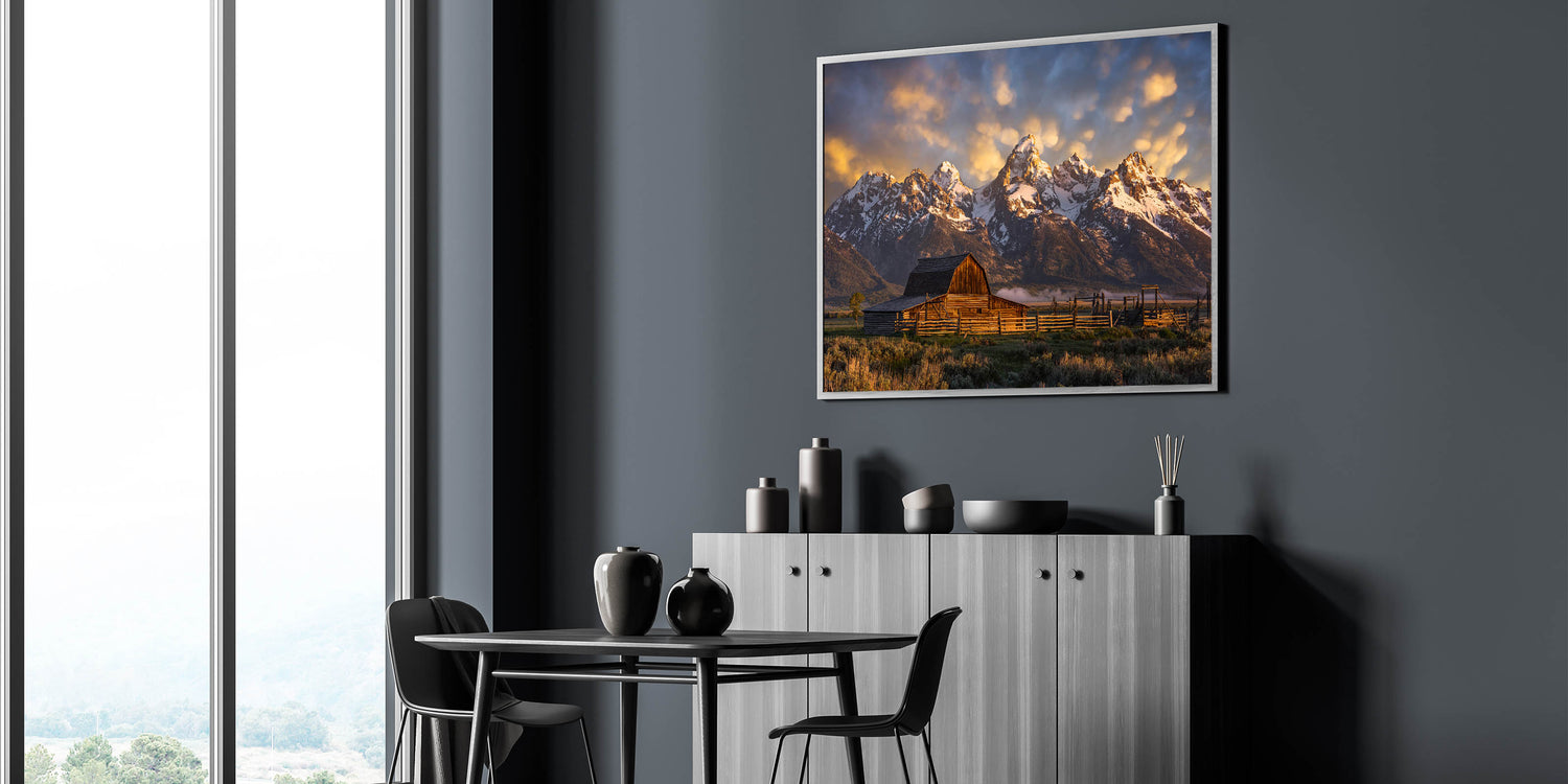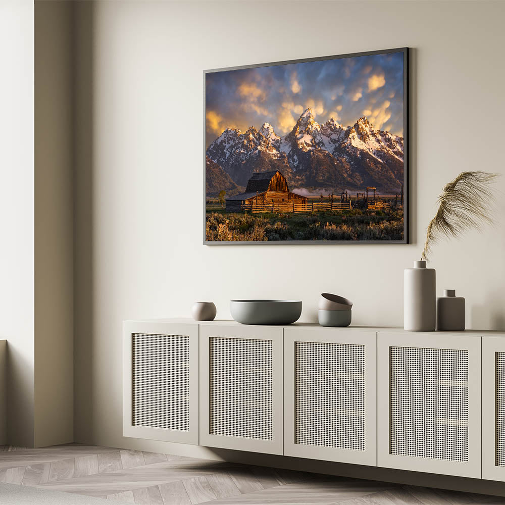This Grand Teton scenic print brings the warmth of sunset and the rustic charm of a barn into your home, creating an inviting and peaceful atmosphere.