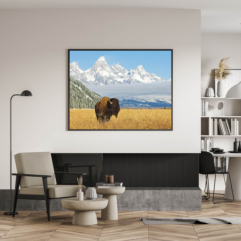 Experience the raw beauty of Grand Teton National Park with this striking photography art print, featuring a powerful bison standing proudly against the snow-covered Teton Range. The golden grass fields contrast beautifully with the crisp white mountains and the clear blue sky, creating a scene that perfectly captures the essence of the American West. This print is ideal for wildlife enthusiasts and those looking to add a touch of nature to their home or office.