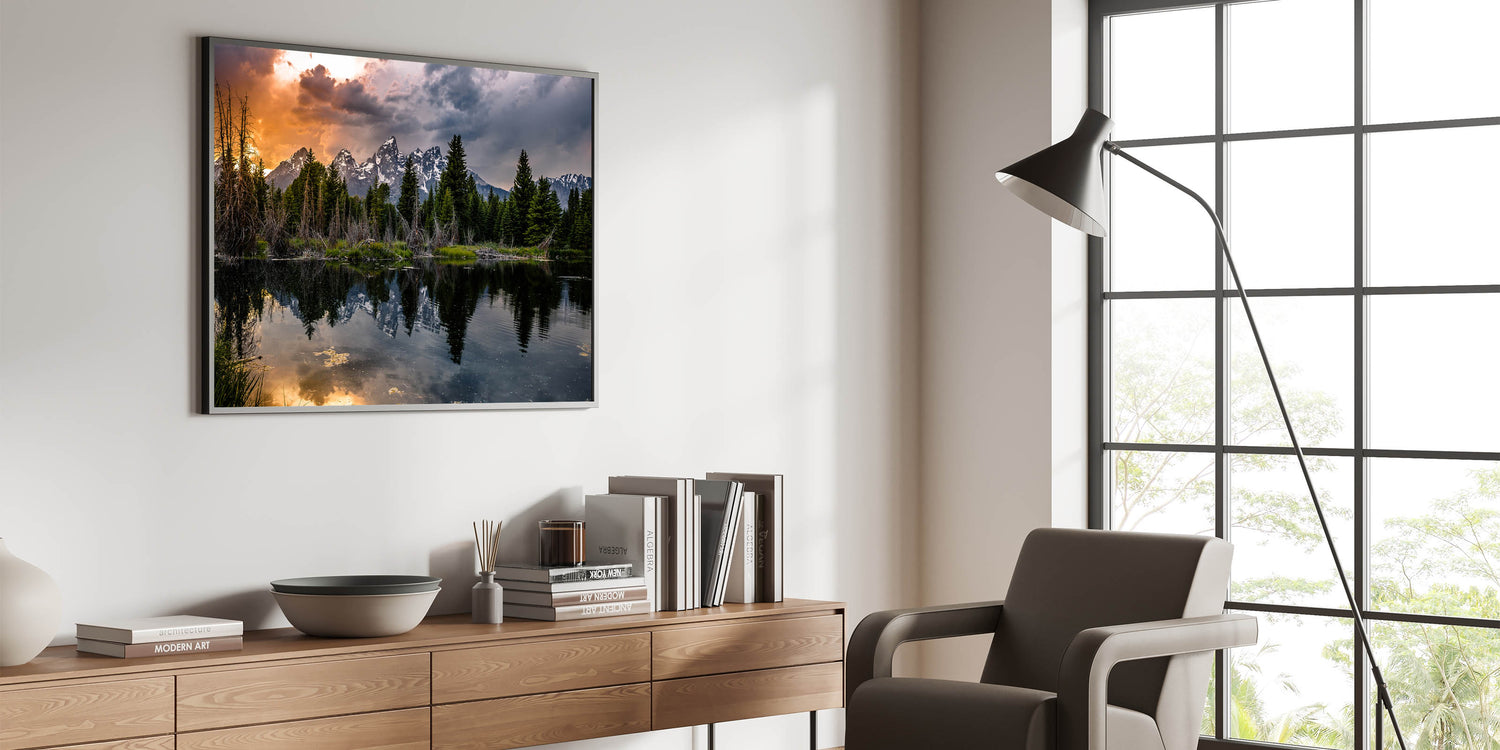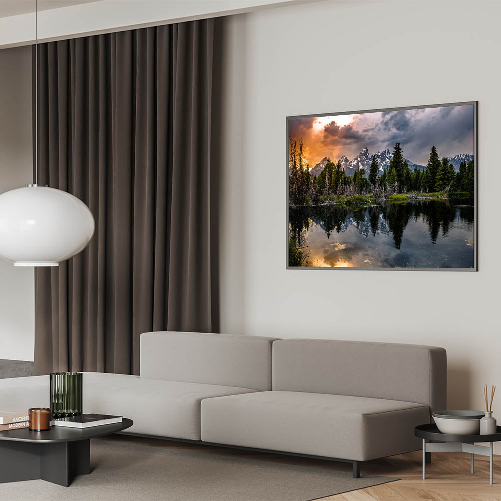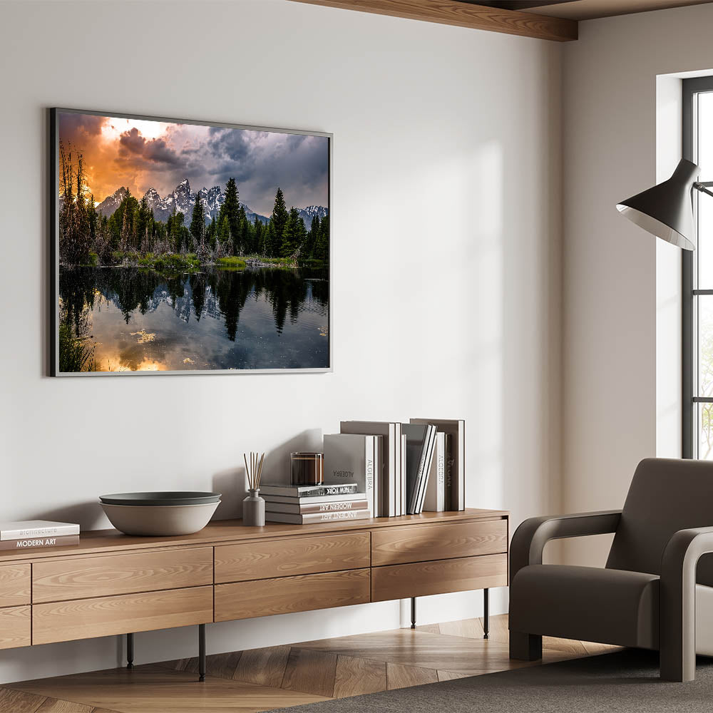 This Grand Teton scenic print brings the beauty of sunset reflections and dramatic skies into your home, offering a calming yet striking focal point for any room.