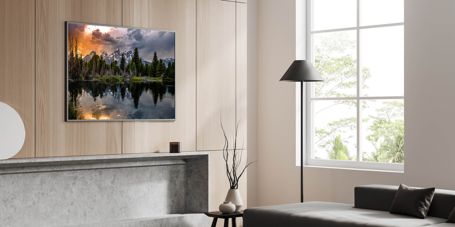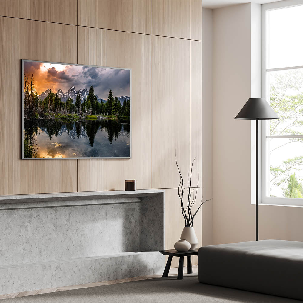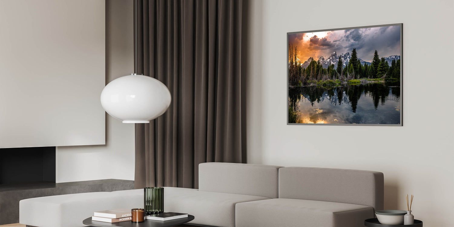 This Grand Teton scenic print brings the beauty of sunset reflections and dramatic skies into your home, offering a calming yet striking focal point for any room.