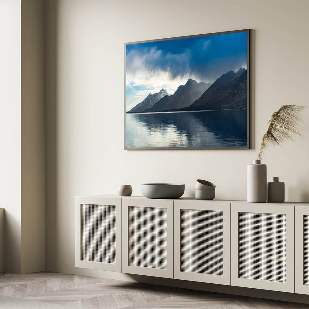 Experience the tranquil beauty of the Teton Range with this stunning Grand Teton scenic print. The image captures the essence of stillness as mist clings to the majestic mountain ridges while they tower above a serene, reflective lake. The calm waters mirror the distant peaks, adding to the overall sense of peace and solitude. This artwork is perfect for anyone who appreciates nature's quiet moments and the grandeur of Wyoming's iconic landscapes.
