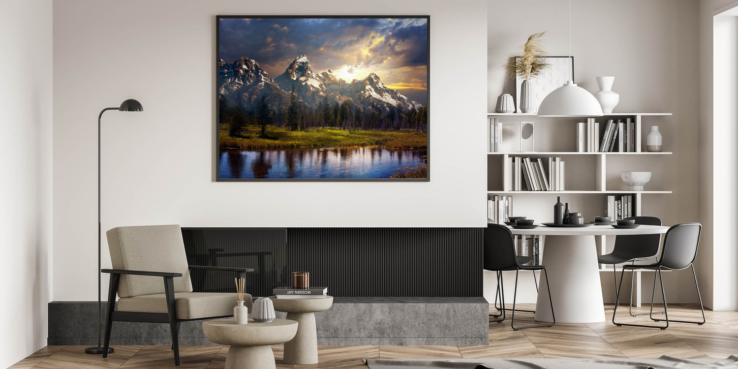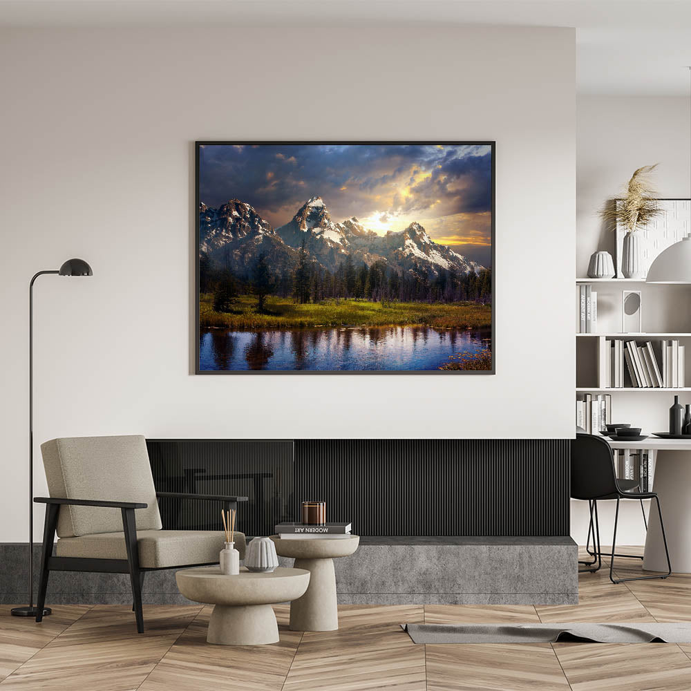 This Grand Teton photography art brings the magic of sunset and nature into your home, offering a sense of peace and wonder. It’s perfect for creating an inviting and nature-inspired atmosphere in any room.