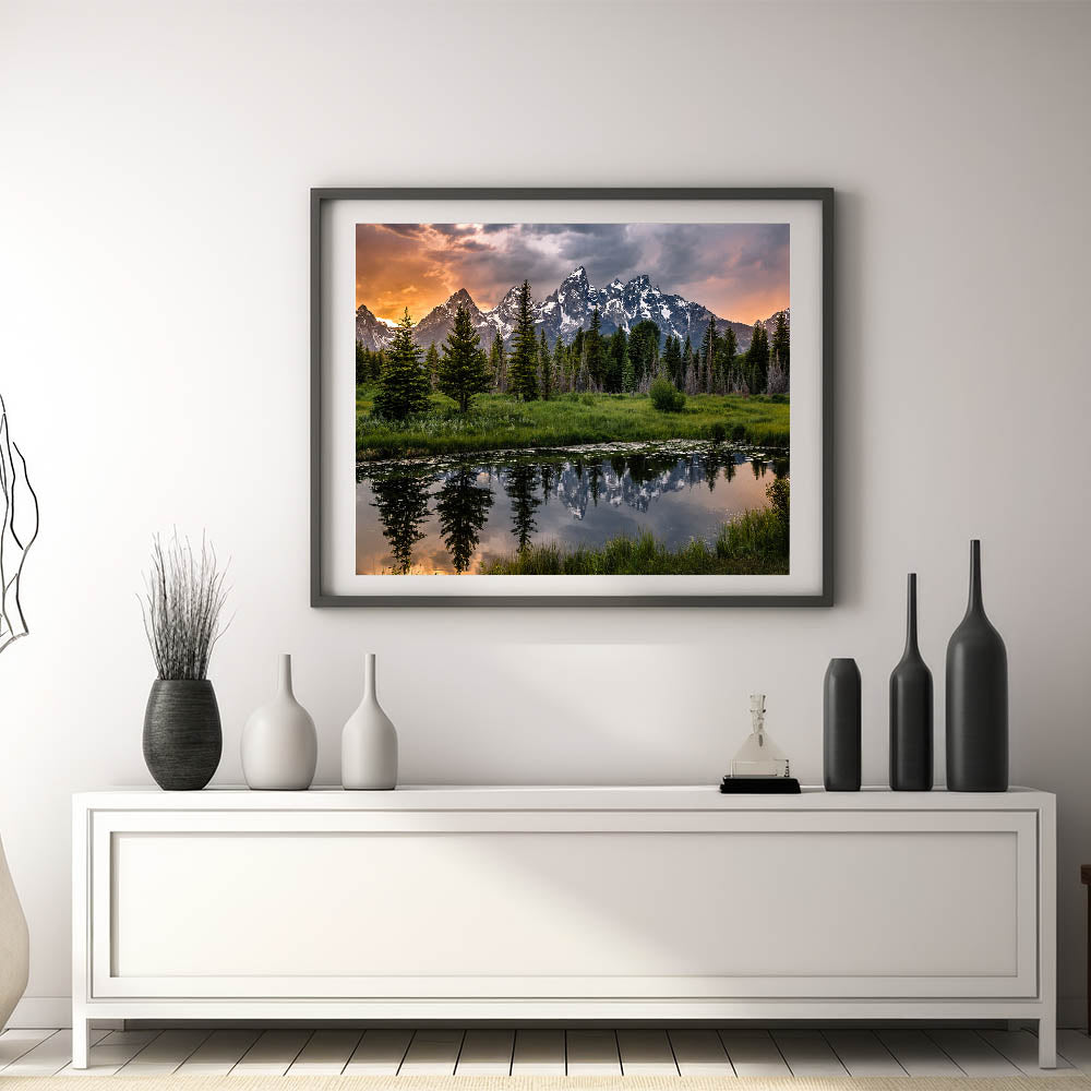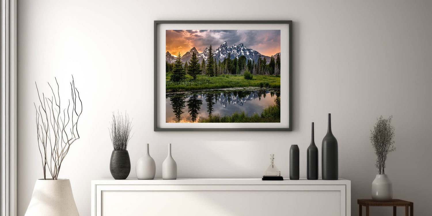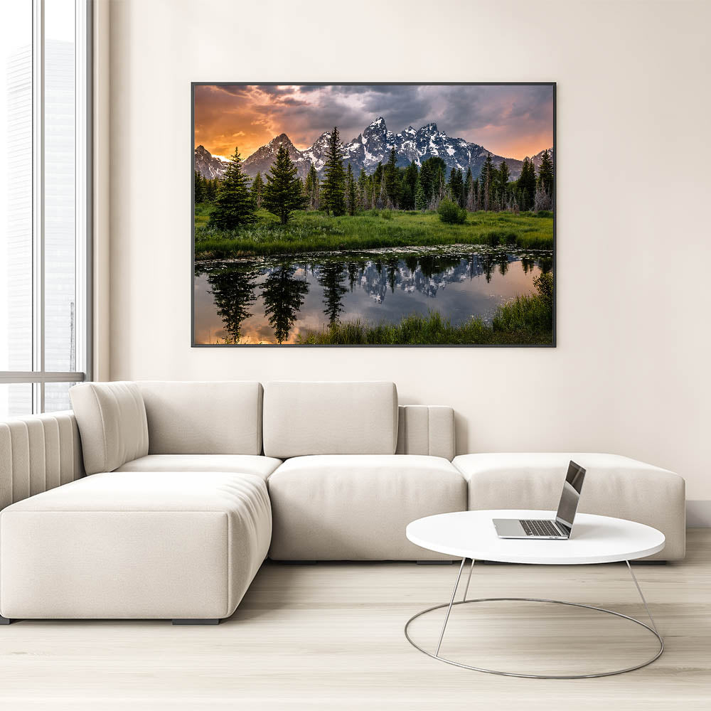 This Grand Teton photography art brings the beauty of a fiery sunset and peaceful reflections into your home, creating a calming yet vibrant atmosphere.