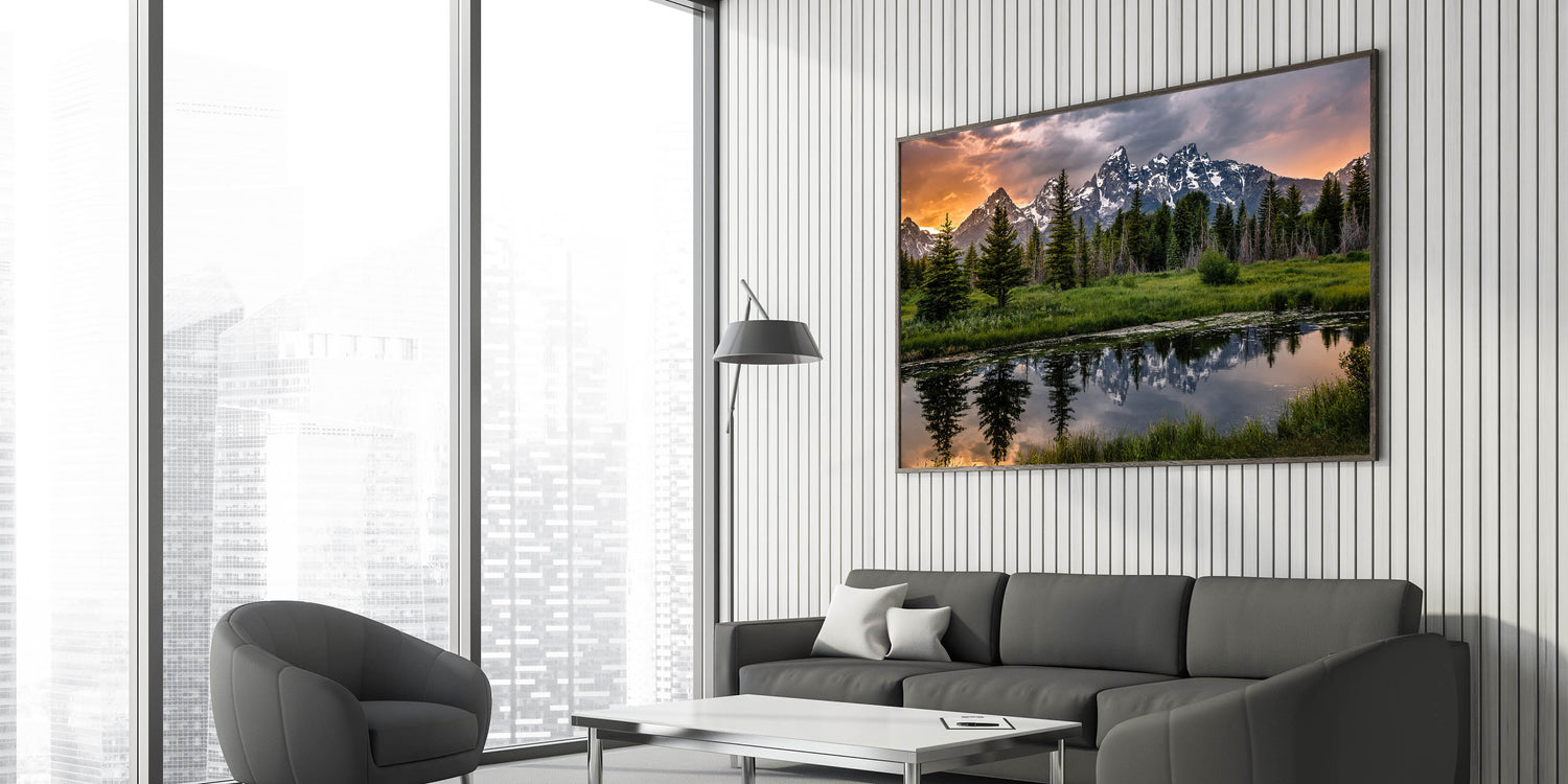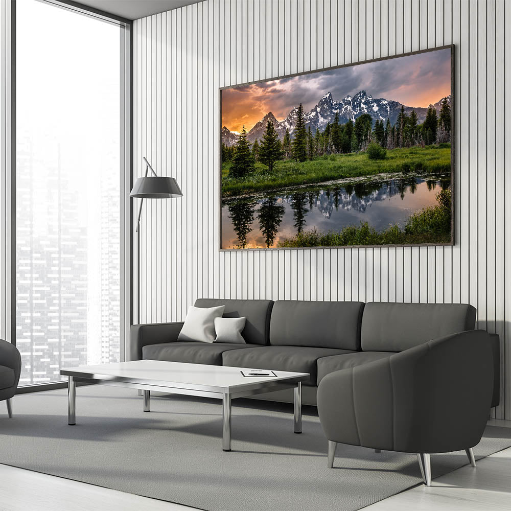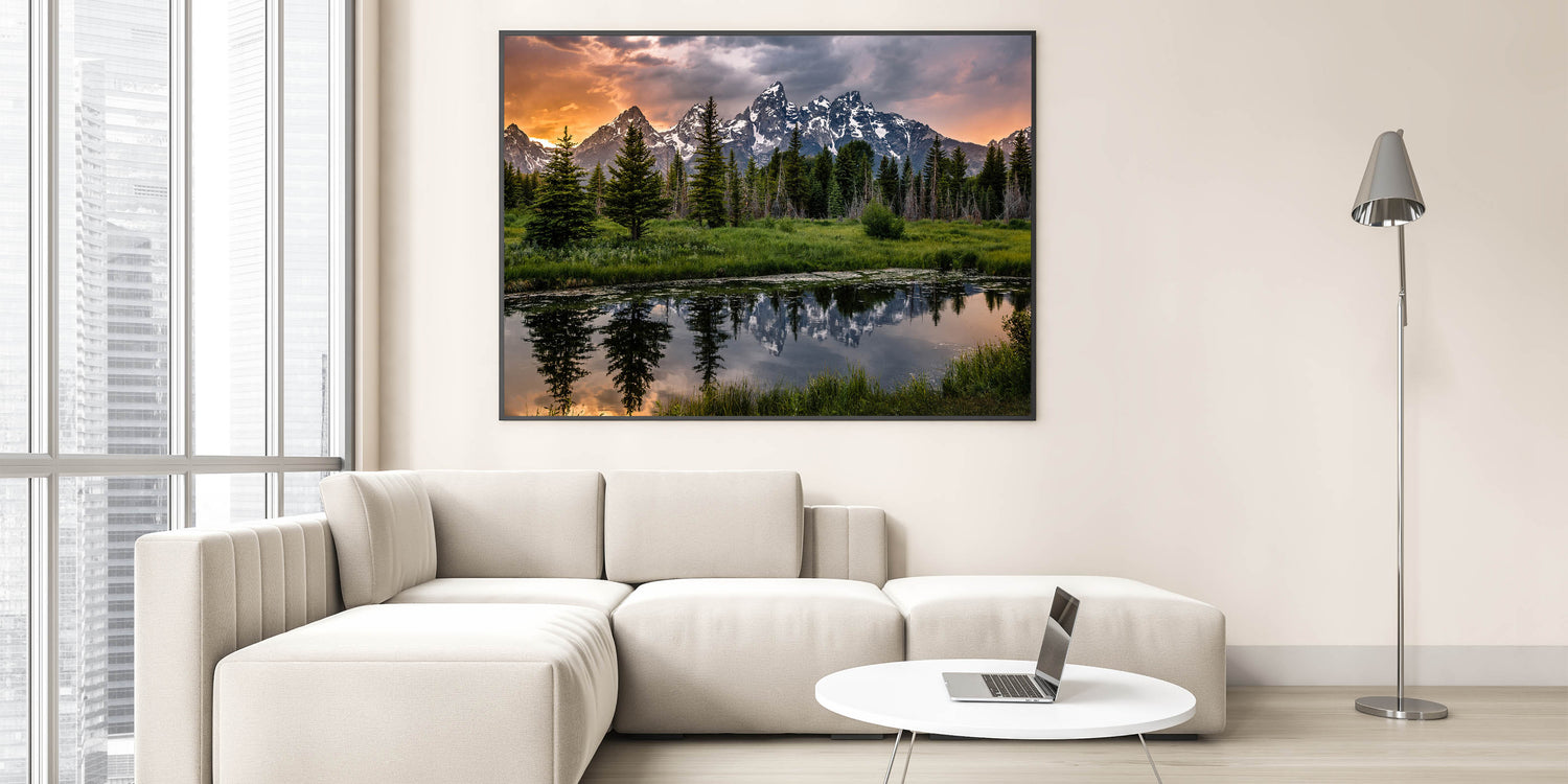 This Grand Teton photography art brings the beauty of a fiery sunset and peaceful reflections into your home, creating a calming yet vibrant atmosphere.