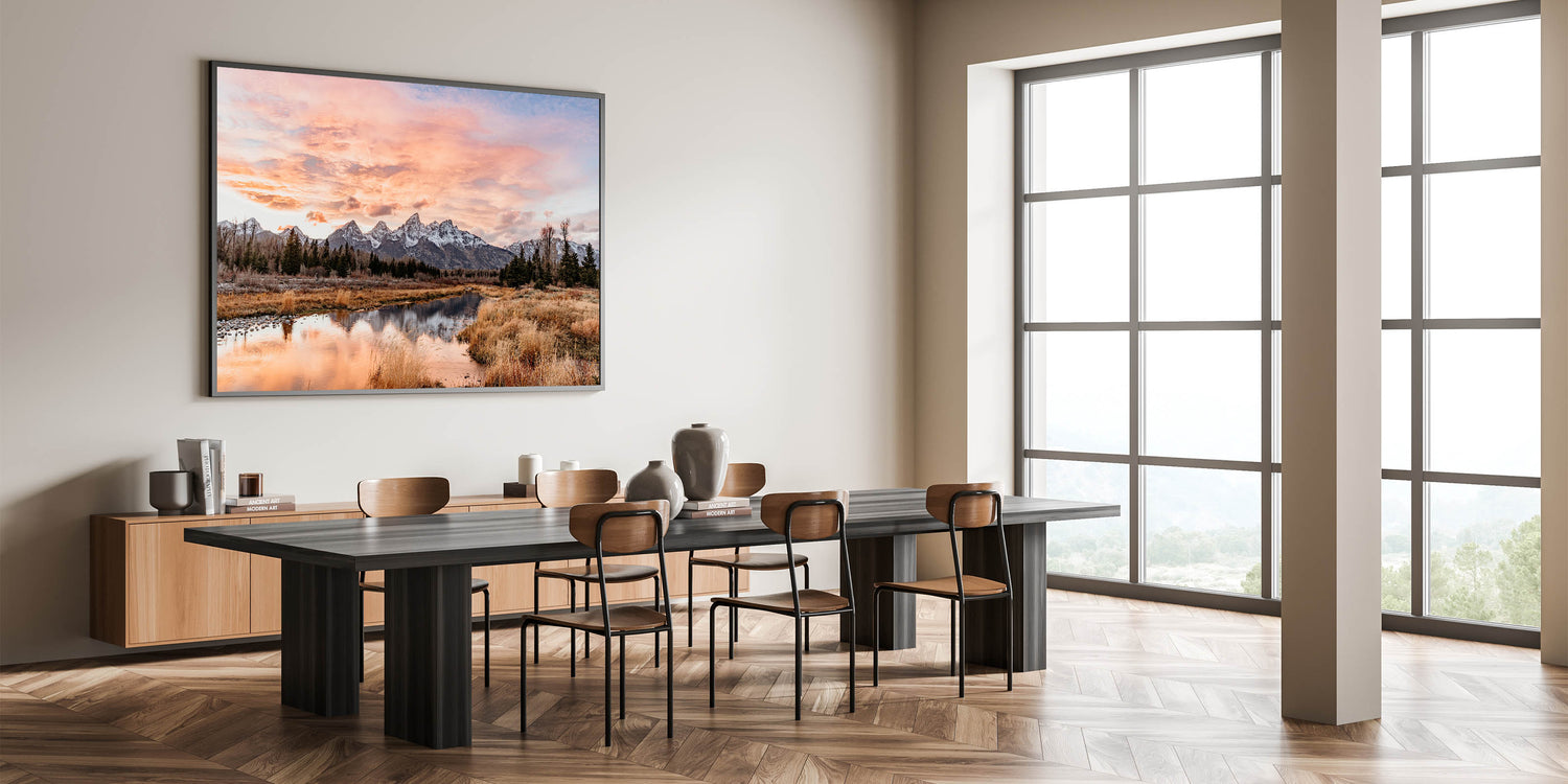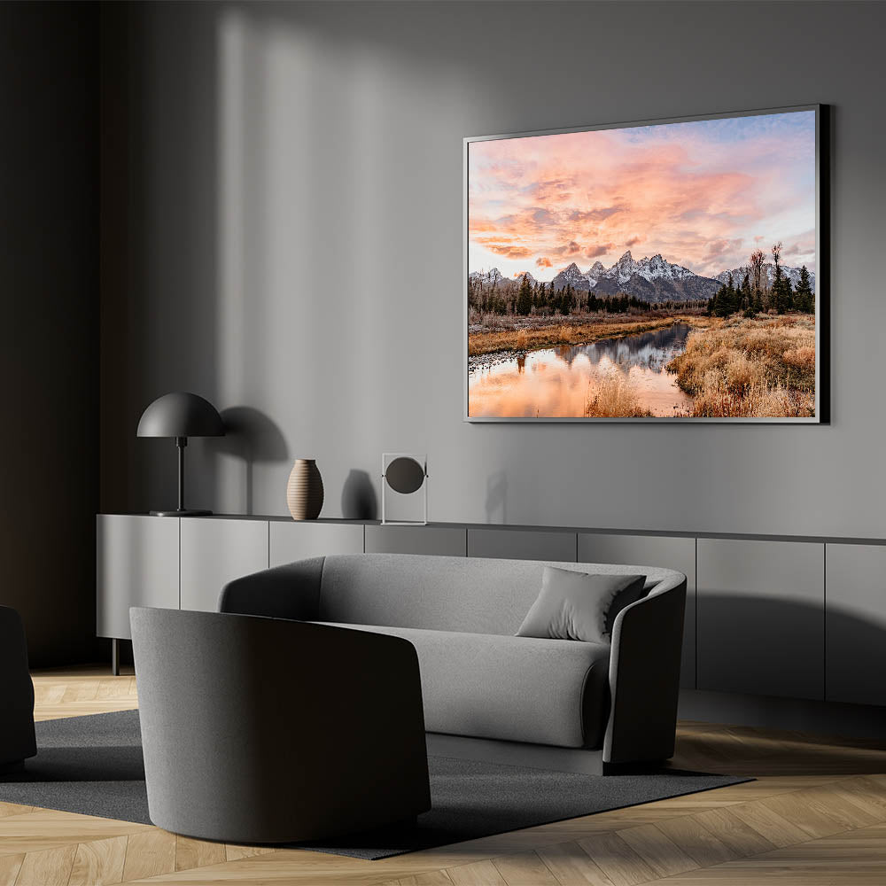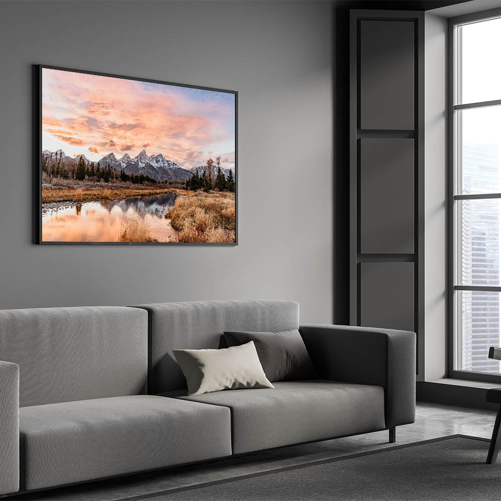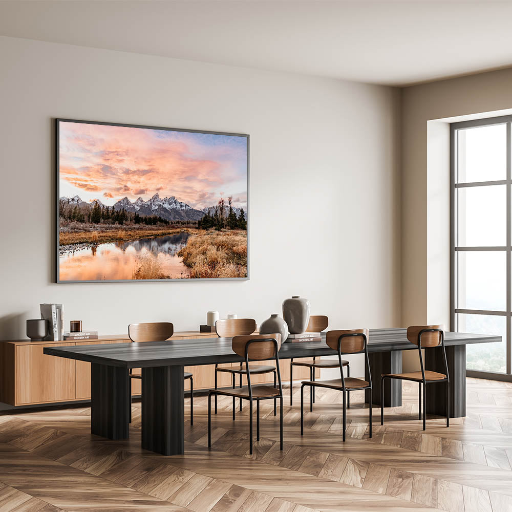 This Grand Teton photography art brings the peaceful beauty of a sunset and serene reflections into your space, creating a calming and relaxing atmosphere.