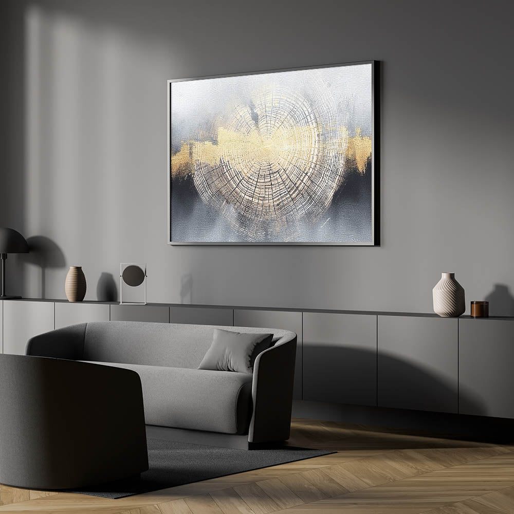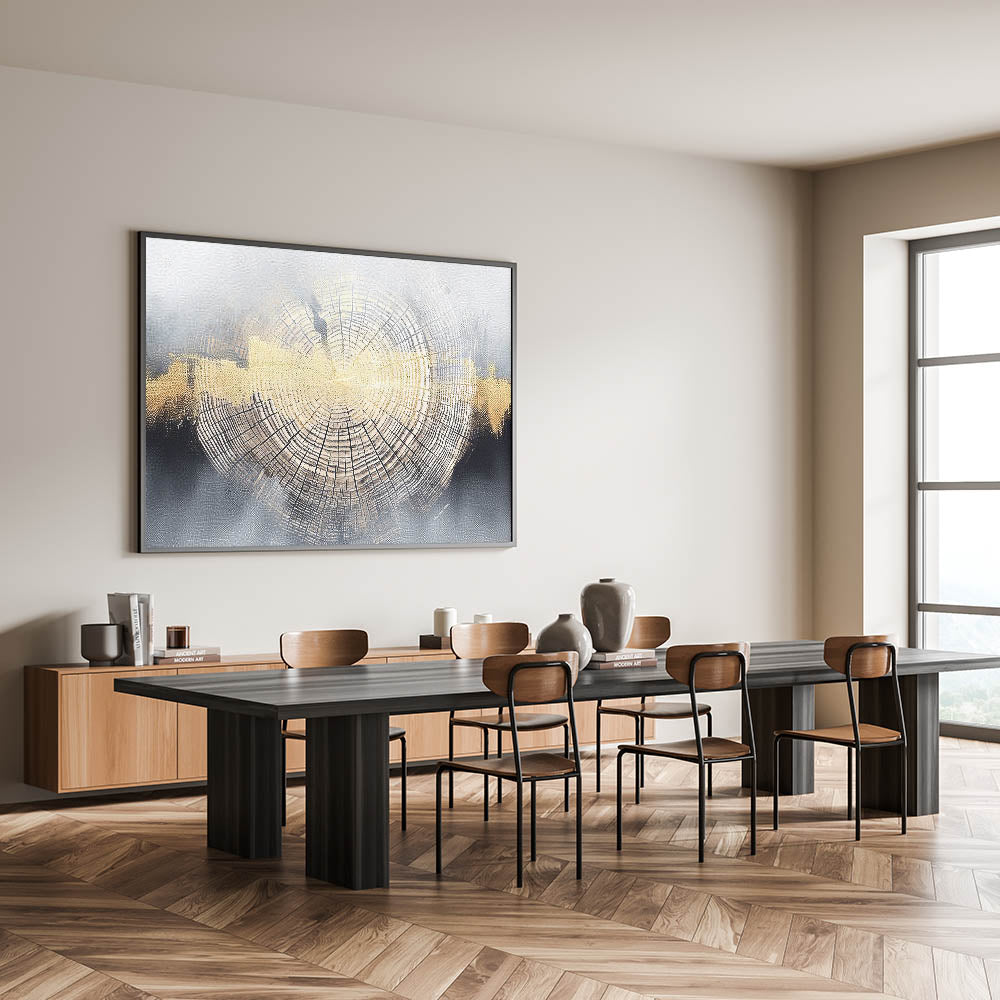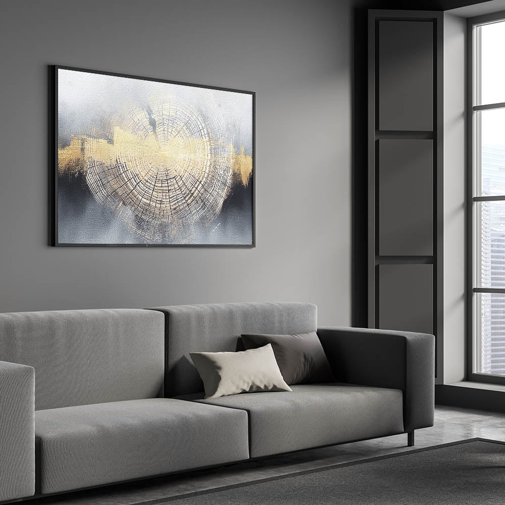 Elevate your space with this captivating abstract tree ring art, a modern masterpiece that blends natural elements with metallic tones and geometric patterns. The central tree ring motif, rendered in intricate detail, is surrounded by shimmering gold and deep black, creating a striking contrast that draws the eye. The subtle gradient of grays and silvers in the background adds depth and dimension, making this piece an ideal focal point for any room, whether it's a contemporary living space, office, or bedroom.