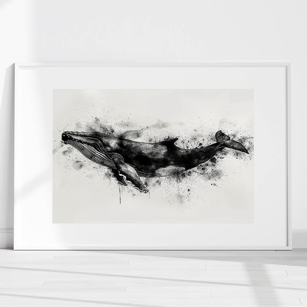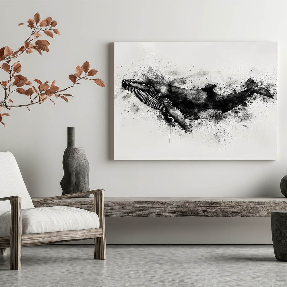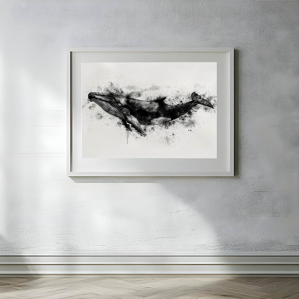 Embrace the fusion of nature and modern art with this Abstract Whale Ink Art. This unique piece captures the essence of a whale in an expressive, splattered ink style that adds a contemporary edge to any space. The black and white design highlights the fluidity and grace of the whale while the abstract splashes of ink convey movement and energy. Perfect for those who appreciate both marine life and modern art, this artwork is available in multiple formats including stretched canvas, framed canvas, acrylic glass, and more.