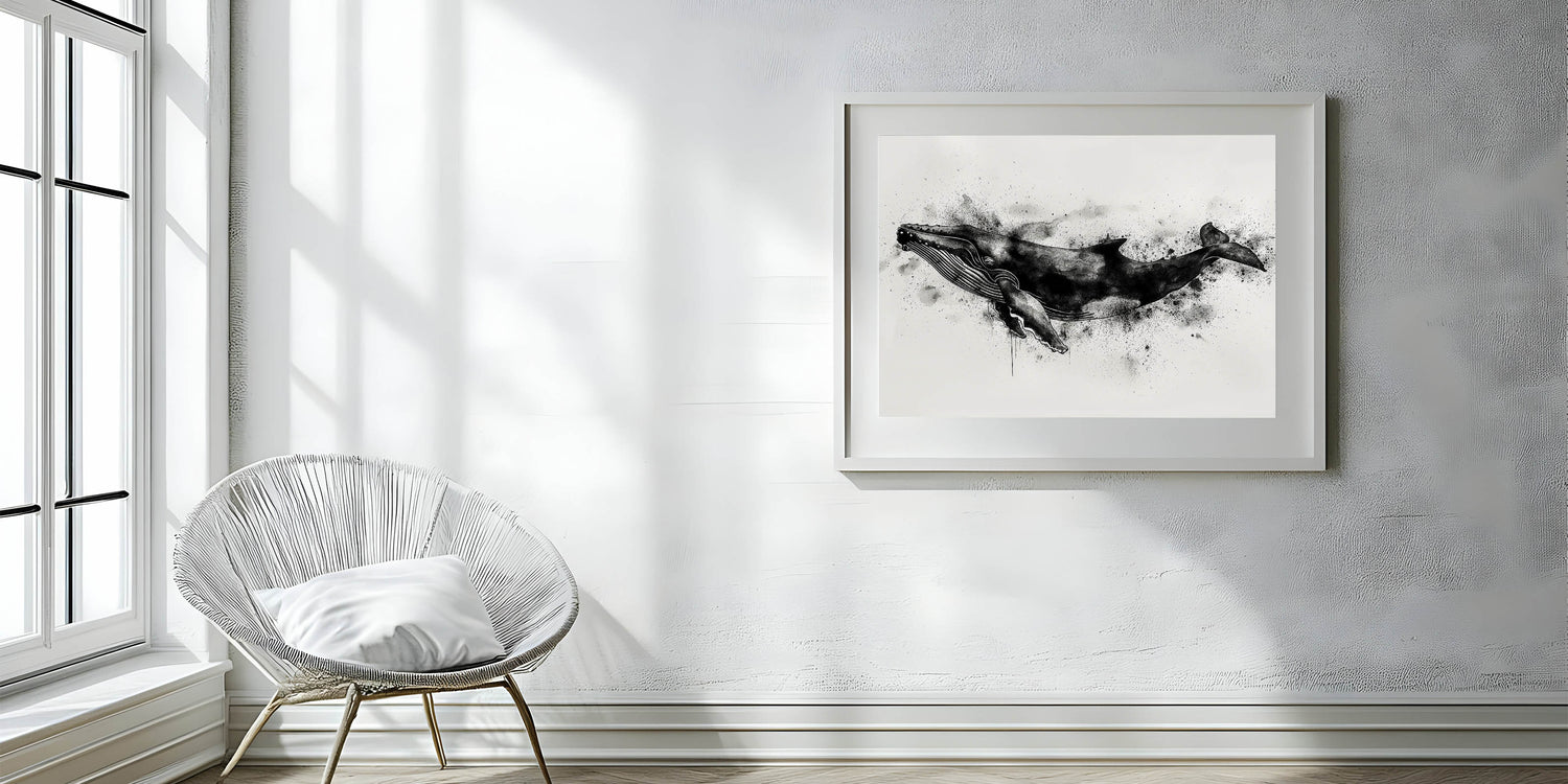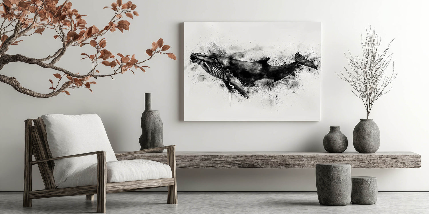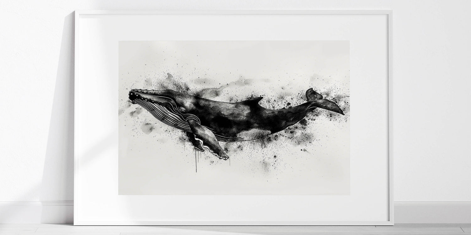 Embrace the fusion of nature and modern art with this Abstract Whale Ink Art. This unique piece captures the essence of a whale in an expressive, splattered ink style that adds a contemporary edge to any space. The black and white design highlights the fluidity and grace of the whale while the abstract splashes of ink convey movement and energy. Perfect for those who appreciate both marine life and modern art, this artwork is available in multiple formats including stretched canvas, framed canvas, acrylic glass, and more.