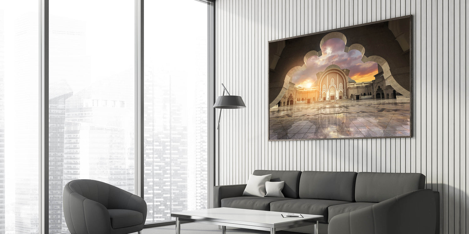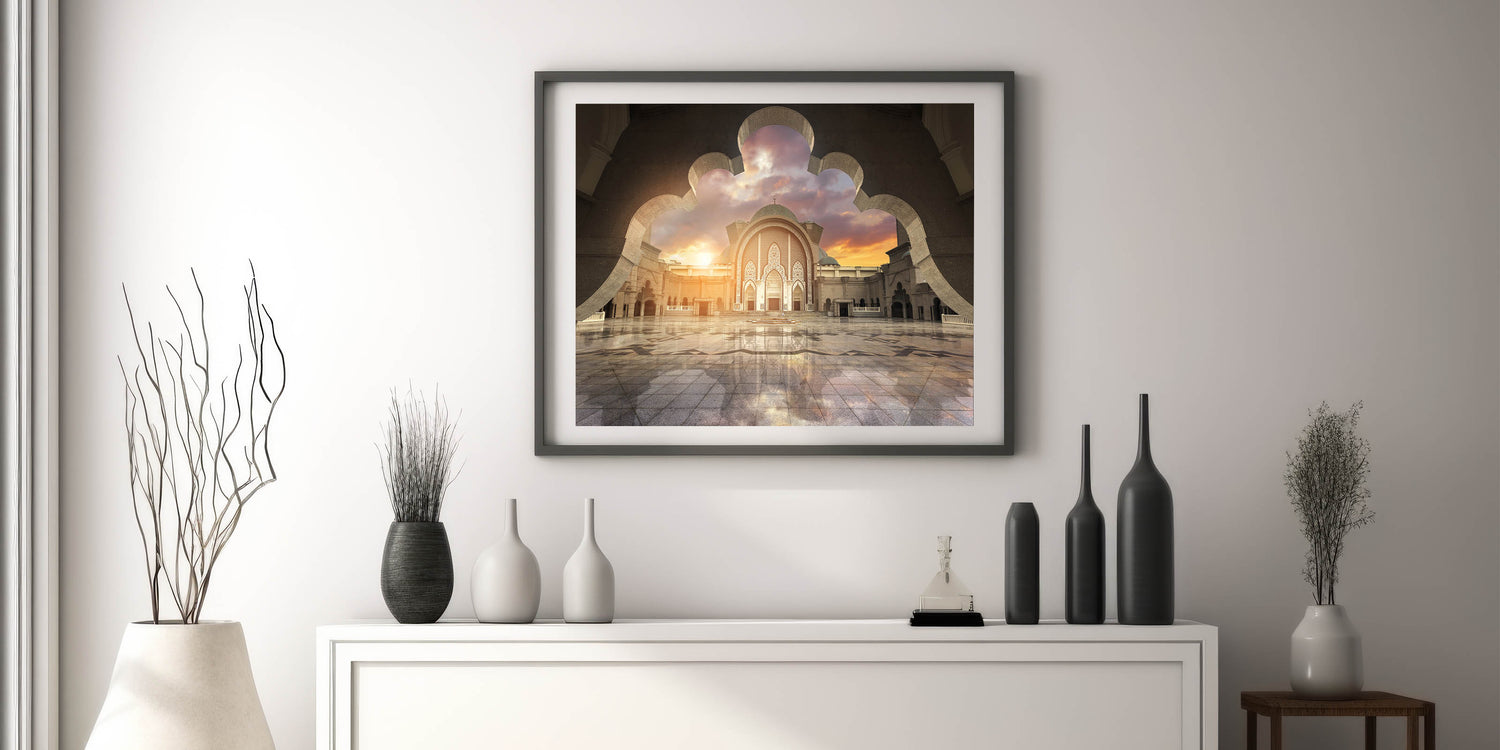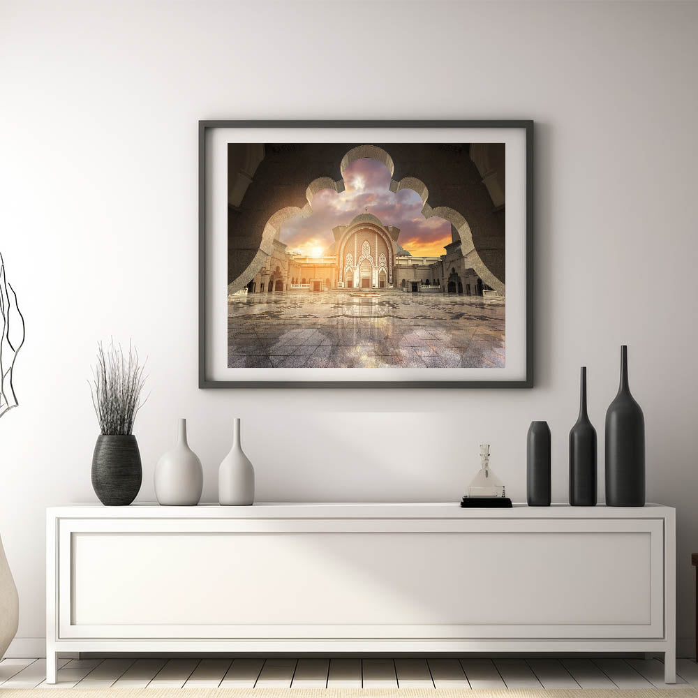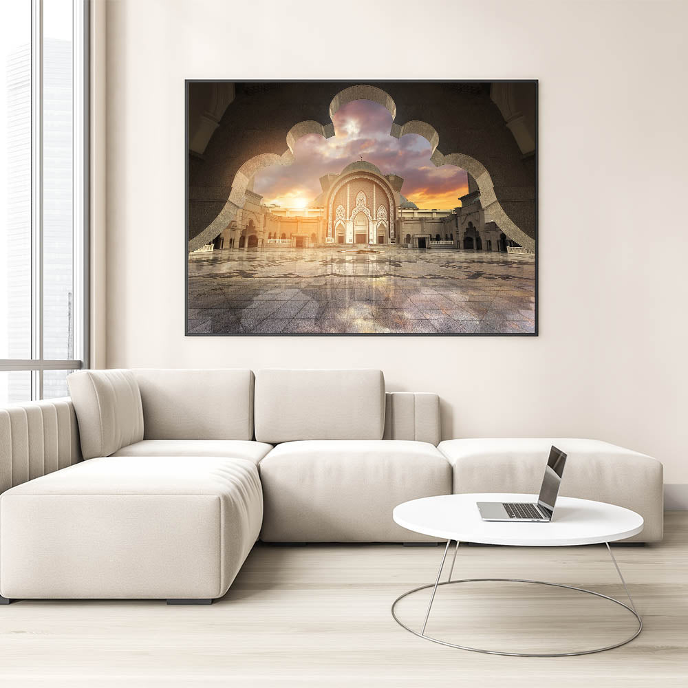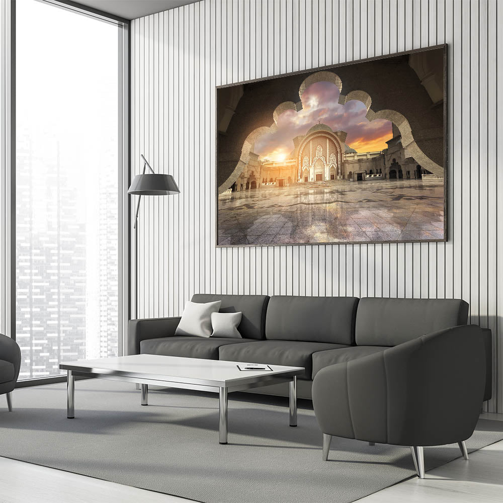 This breathtaking piece will elevate the ambiance of any space, whether in a home or office. Its stunning combination of traditional Islamic architecture and modern art presentation makes it a perfect fit for anyone looking to add a touch of elegance and spirituality to their decor.