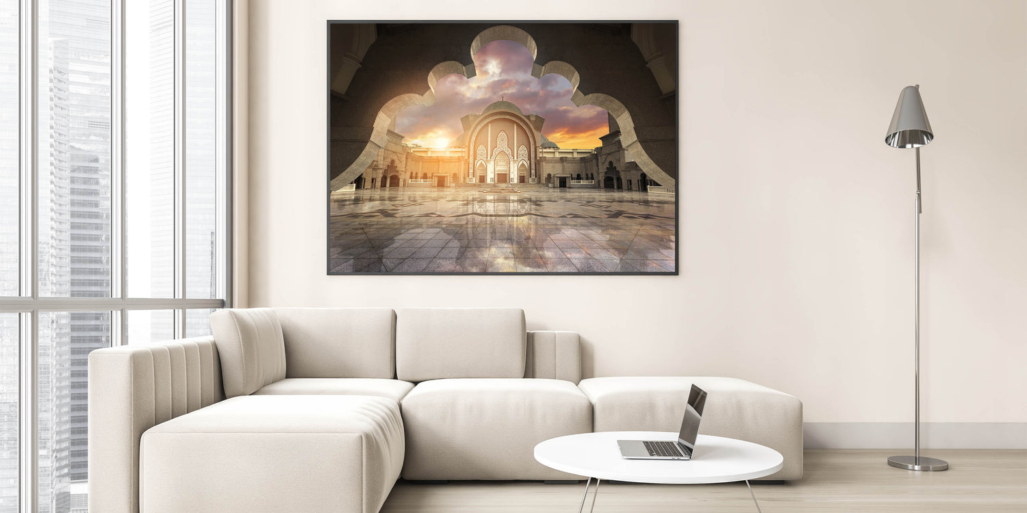 Immerse yourself in the stunning architecture and cultural beauty of Malaysia with this captivating artwork. This piece captures the grand entrance of a mosque at sunset, with its reflection shimmering on the polished marble floor. The intricate Islamic design and the golden hues of the setting sun create a serene and elegant scene that’s perfect for any room. The arches of the mosque frame the sky, adding depth and a sense of grandeur to the image.