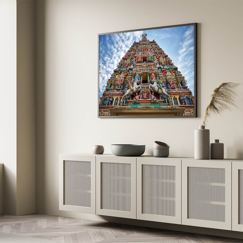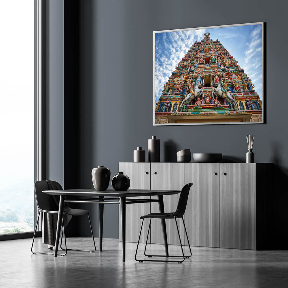 Perfect for those who appreciate cultural art and architecture, this Malaysia art print will add a unique and vibrant touch to your home or office. The detailed statues and vibrant colors make this piece a true conversation starter, enhancing any space with its historical and spiritual significance.